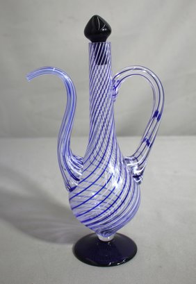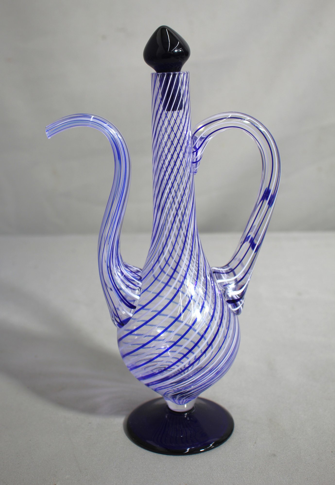this CESM-I BULBUL glass pitcher stands 10 inches tall and showcases an exquisite blend of artistry and function. Handcrafted with precision, the pitcher features a rich blue and clear stripe design that spirals elegantly from the base to the neck, culminating in a distinctive dark top stopper. The curvaceous handle and elongated spout add grace and ease of pouring