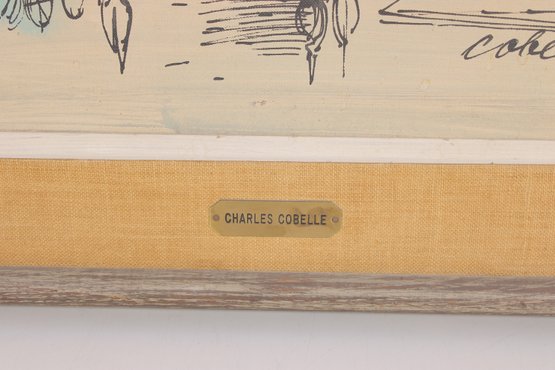 The artwork is signed “Cobelle” in the lower portion and retains its original vintage frame with a fabric mat and artist name plaque, adding to its authenticity and display appeal.