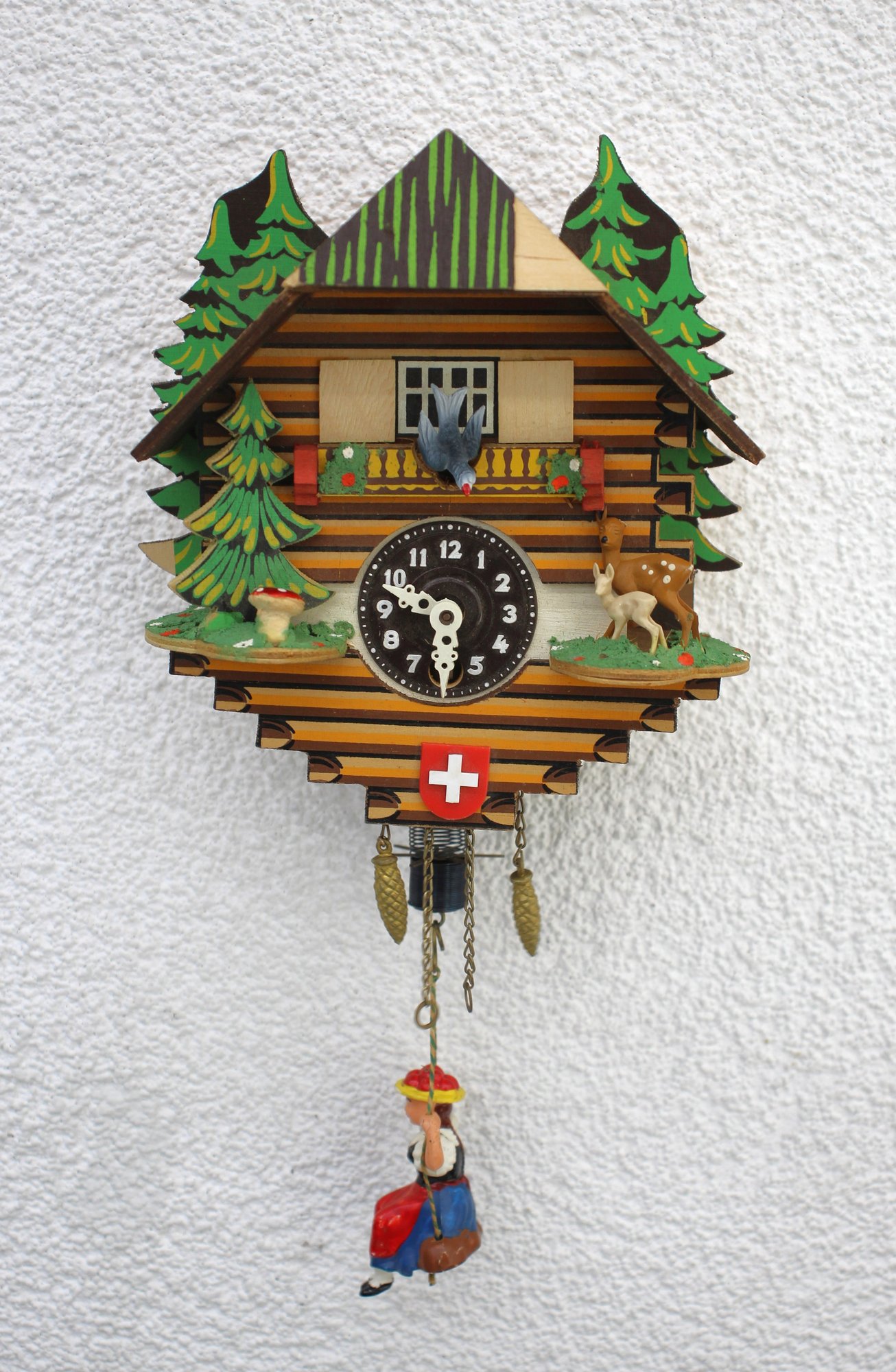 This delightful 6.5-inch Swiss chalet cuckoo clock captures the essence of Alpine craftsmanship with its hand-painted details and traditional Swiss design. The clock face is framed by a miniature log cabin, pine trees, and adorable forest animals, complete with a red Swiss cross emblem. A charming figurine of a girl in traditional attire swings below, adding movement and whimsy. This piece operates with a classic mechanical movement, visible through the back. Perfect for collectors or as a unique decorative accent, this miniature cuckoo clock brings a touch of Swiss charm to any space.