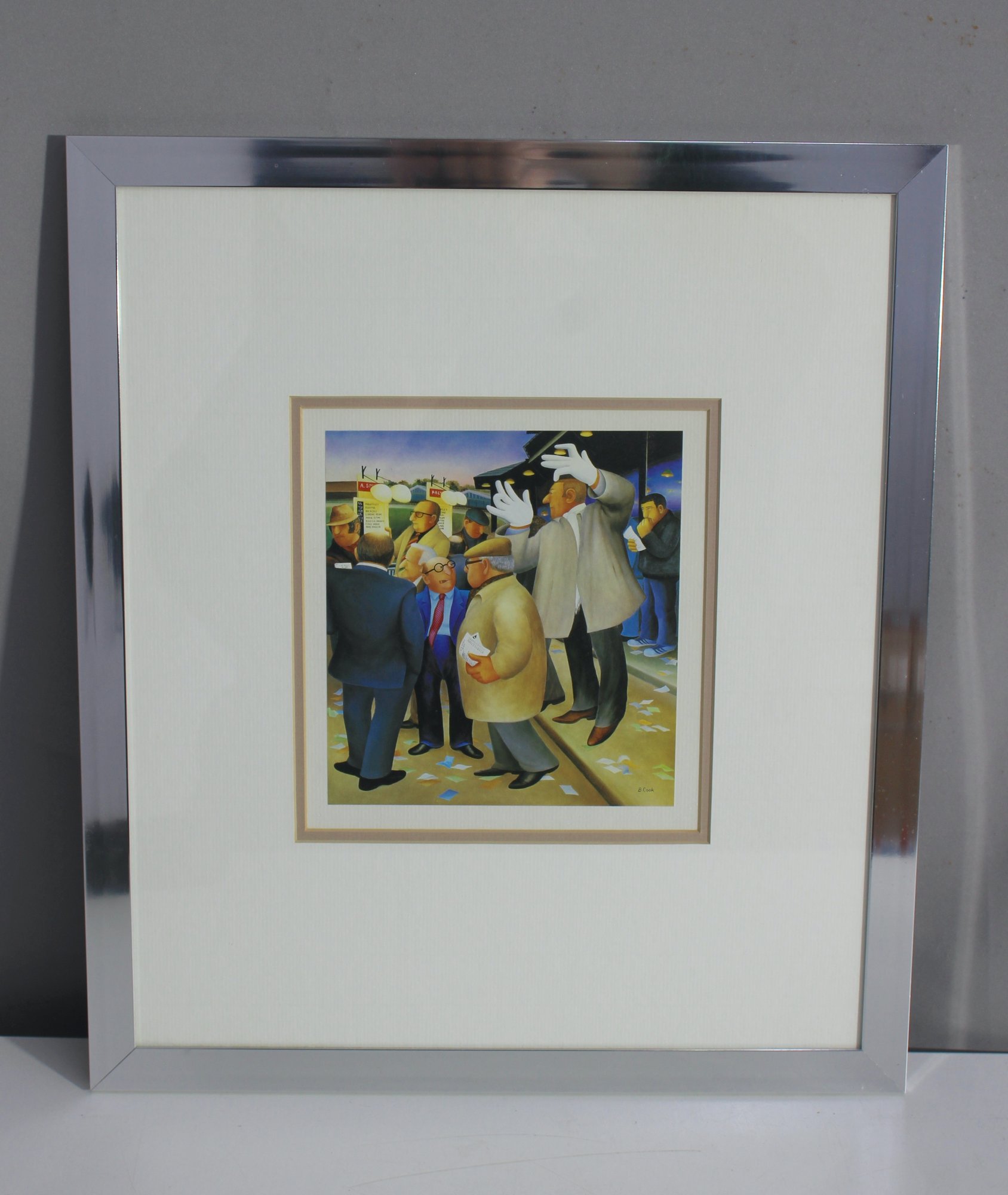 The artwork is professionally framed in a sleek chrome frame with a crisp white mat that highlights the vivid composition, making it perfect for any contemporary or eclectic décor. The signature "B. Cook" is visible in the lower right corner, adding authenticity to this delightful piece.