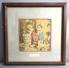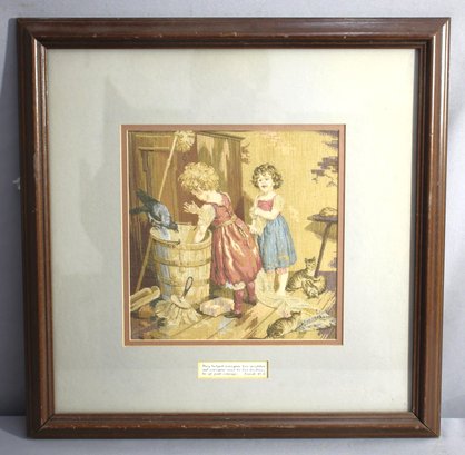 Welcome to a delightful piece of nostalgia with this beautifully framed needlepoint artwork, titled 'Childhood Innocence'. This vintage textile piece portrays two young children engaging with a feathered friend by a wooden bucket, with a playful kitten at their feet - a scene rich with the whimsy of youth and the beauty of simple pleasures.
