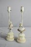 These delicate figures, a lady adorned in a wide-brimmed bonnet and a gentleman in ceremonial attire, are rendered in soft pastel hues with intricate detailing that captures the opulence of the era. The figurines are set upon sturdy bases, ensuring their elegant poise. Each lamp is topped with a fitting where a shade can be attached to complement the vintage charm of the figures.