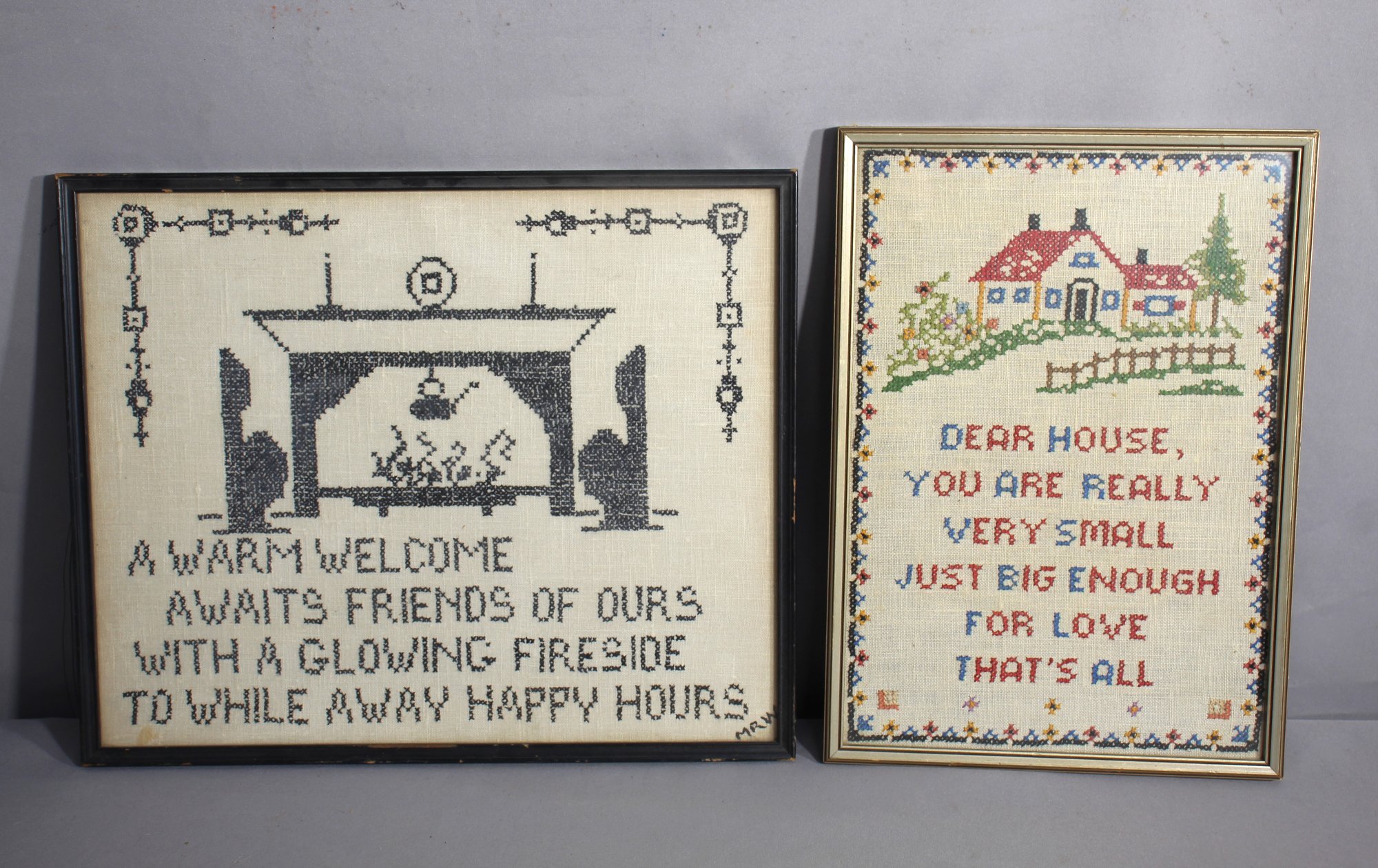 The first piece features a quaint hearth scene, complete with a kettle over a fire, accompanied by the welcoming words "A warm welcome awaits friends of ours with a glowing fire to while away happy hours."