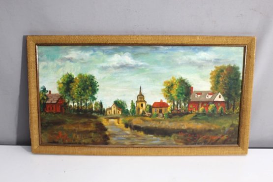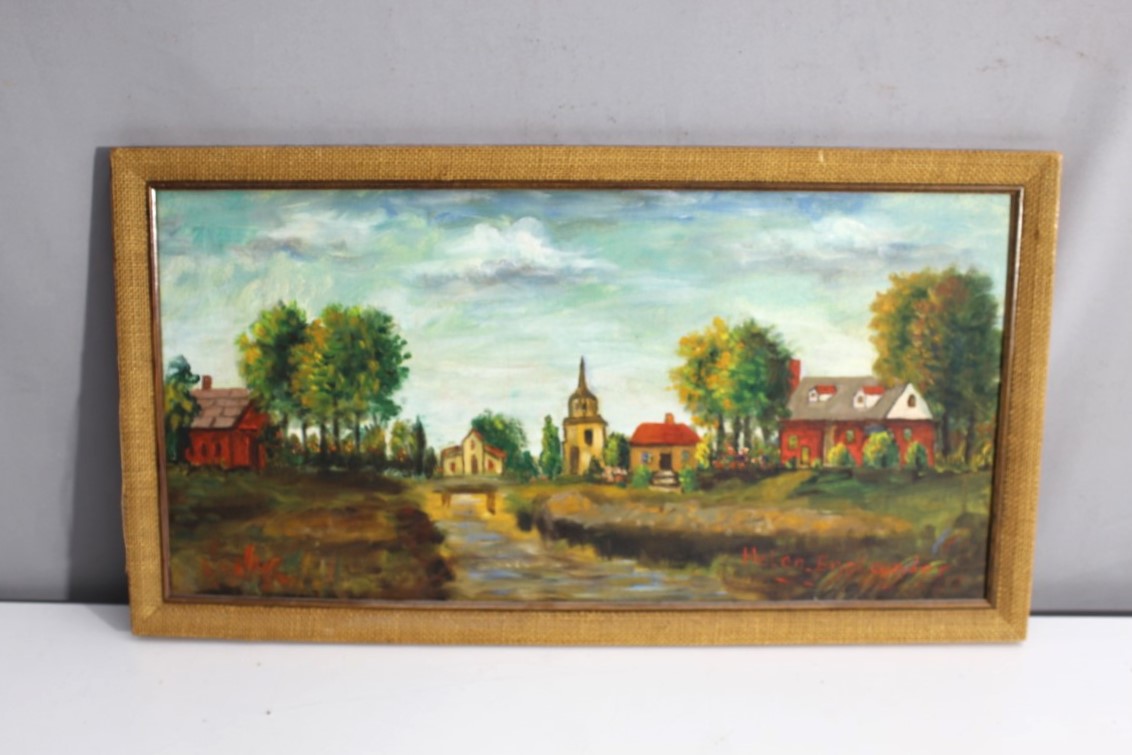 This delightful painting on artist board, signed by Helen englander., captures a serene countryside scene with vibrant colors and picturesque details. The artwork features a charming village landscape, complete with houses, a church steeple, and lush trees set against a cloudy sky. The painting is skillfully framed in a rustic burlap-style wooden frame that enhances its classic appeal. This piece would make a lovely addition to any art collection or home décor. Frame and painting are in good vintage condition, showing minimal wear consistent with age.