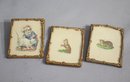 each one beautifully framed with intricate golden gilded frames that add an exquisite touch of elegance. These diminutive artworks feature charming imagery: a sweet child with her pet lamb, an inquisitive squirrel amidst nature, and a serene cat resting on a patch of green.