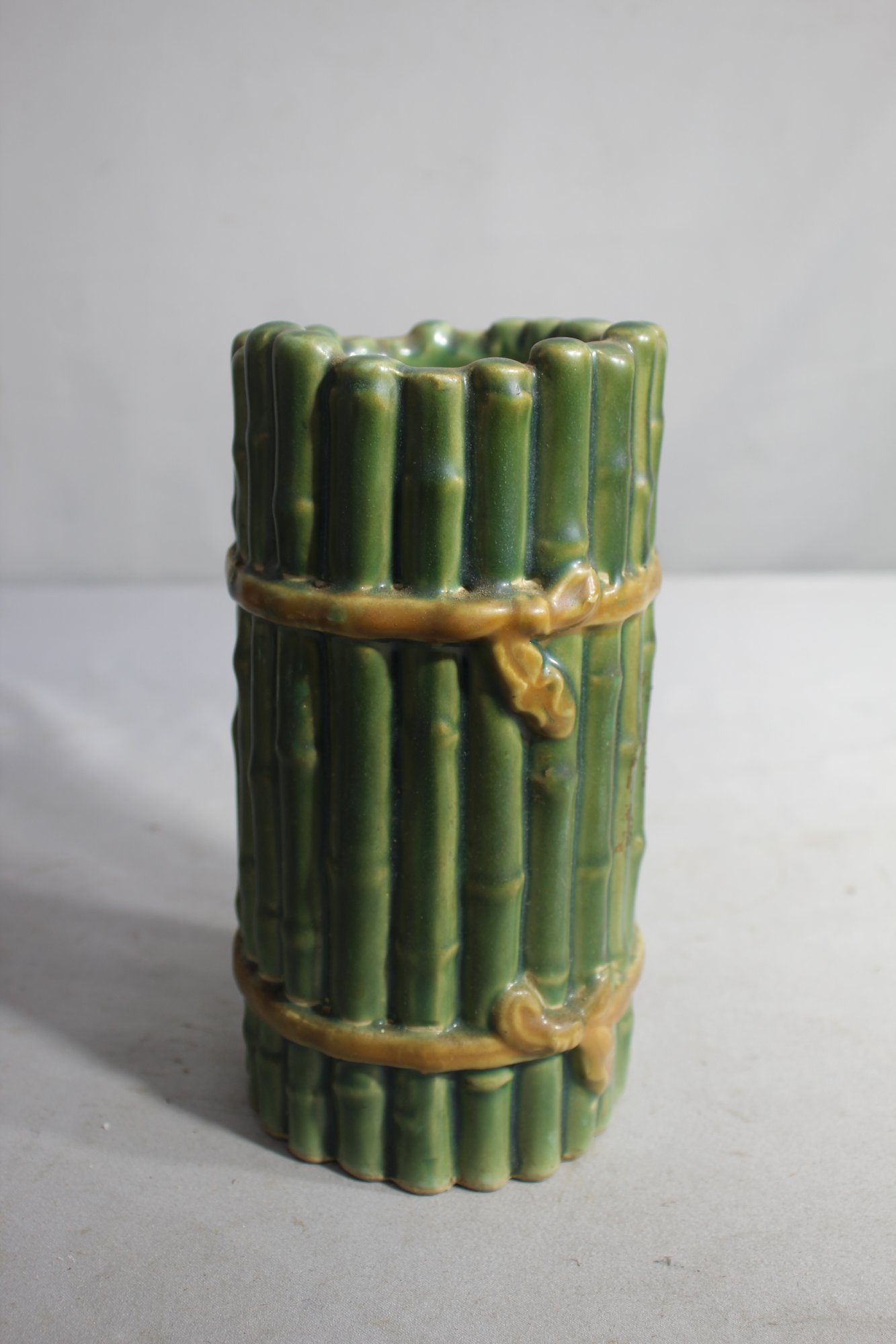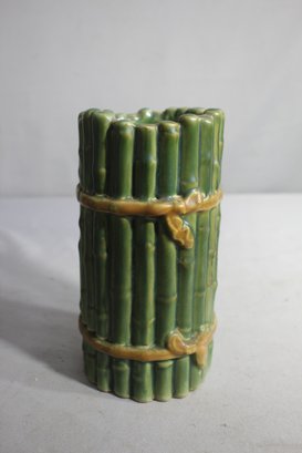 This unique vintage ceramic vase features a delightful asparagus motif, adding a touch of rustic elegance to any collection. Standing at approximately 7 inches in height, the vase is adorned with vibrant green tones and detailed relief work that mimics the texture and appearance of asparagus stalks, complete with a golden band that enhances its quaint charm. Whether used as a standalone decorative piece or as a whimsical container for your favorite blooms, this vase is sure to be a conversation starter.