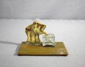 featuring a playful elephant delightfully posed with its trunk resting on a small glass ink container. The base has the warm hues of an aged patina, possibly onyx or a simulating resin, and the elephant is adorned with a circus-like embellishment