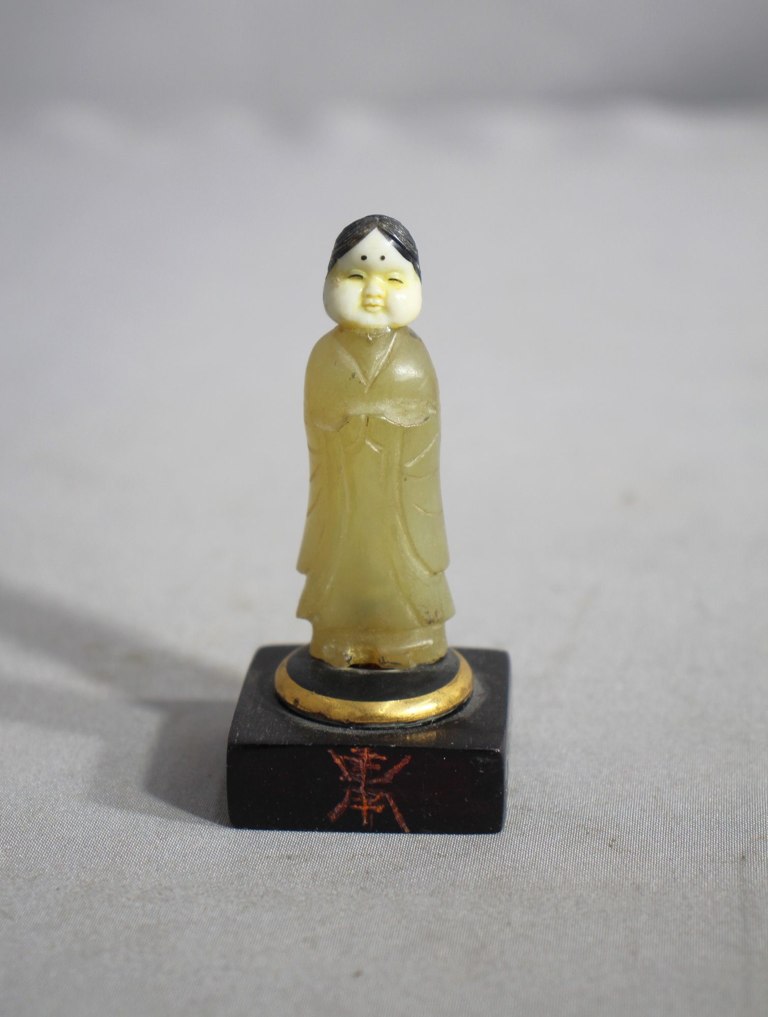 a delightful piece of Japanese culture, this vintage netsuke figurine is a small yet captivating work of art. Crafted with an eye for detail, the figurine portrays a traditional Japanese character, possibly a merchant or a common townsfolk, with subtle features and a serene expression that brings the figure to life.