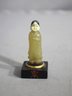 Standing on a custom wooden base with a brass ring, the figure is made from a light, creamy material that may be ivory or bone—materials commonly used in historic netsuke creations. The base is marked with red kanji characters, adding an authentic touch to this miniature sculpture.