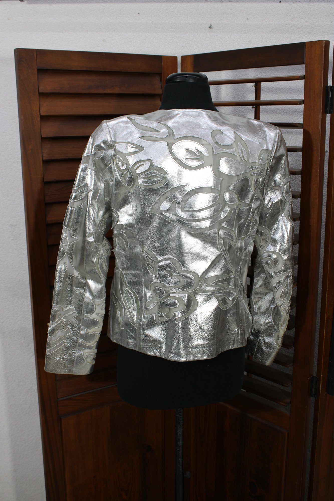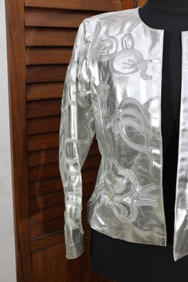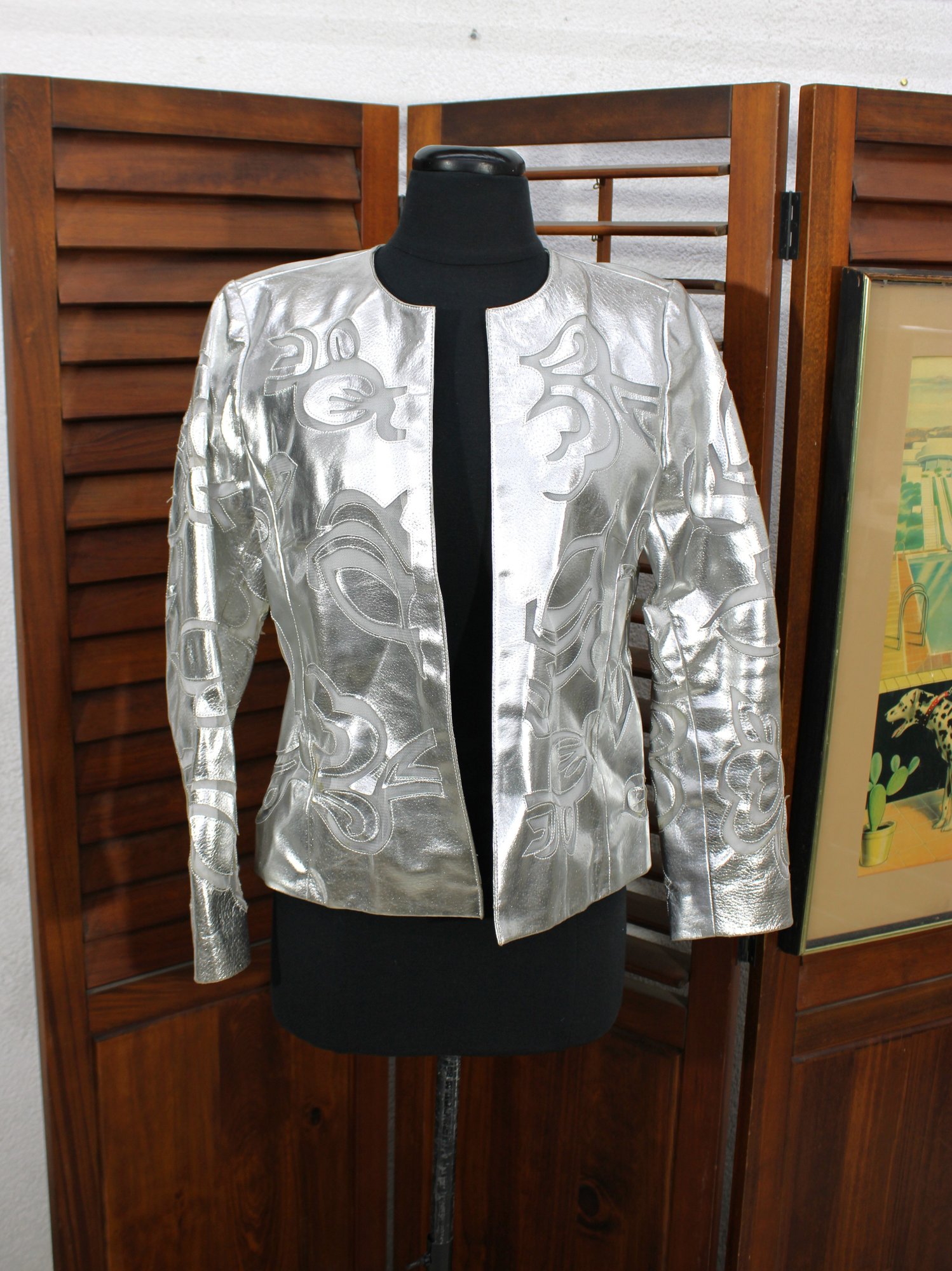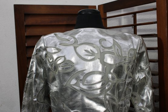 a stunning Chico’s silver jacket in size 0. The piece features an elegant open-front design with a beautiful embossed floral pattern throughout, giving it a textured, high-shine finish. The tailored shape and lightweight construction make it perfect for layering over dresses or tops for evening wear, special events, or dressy occasions.