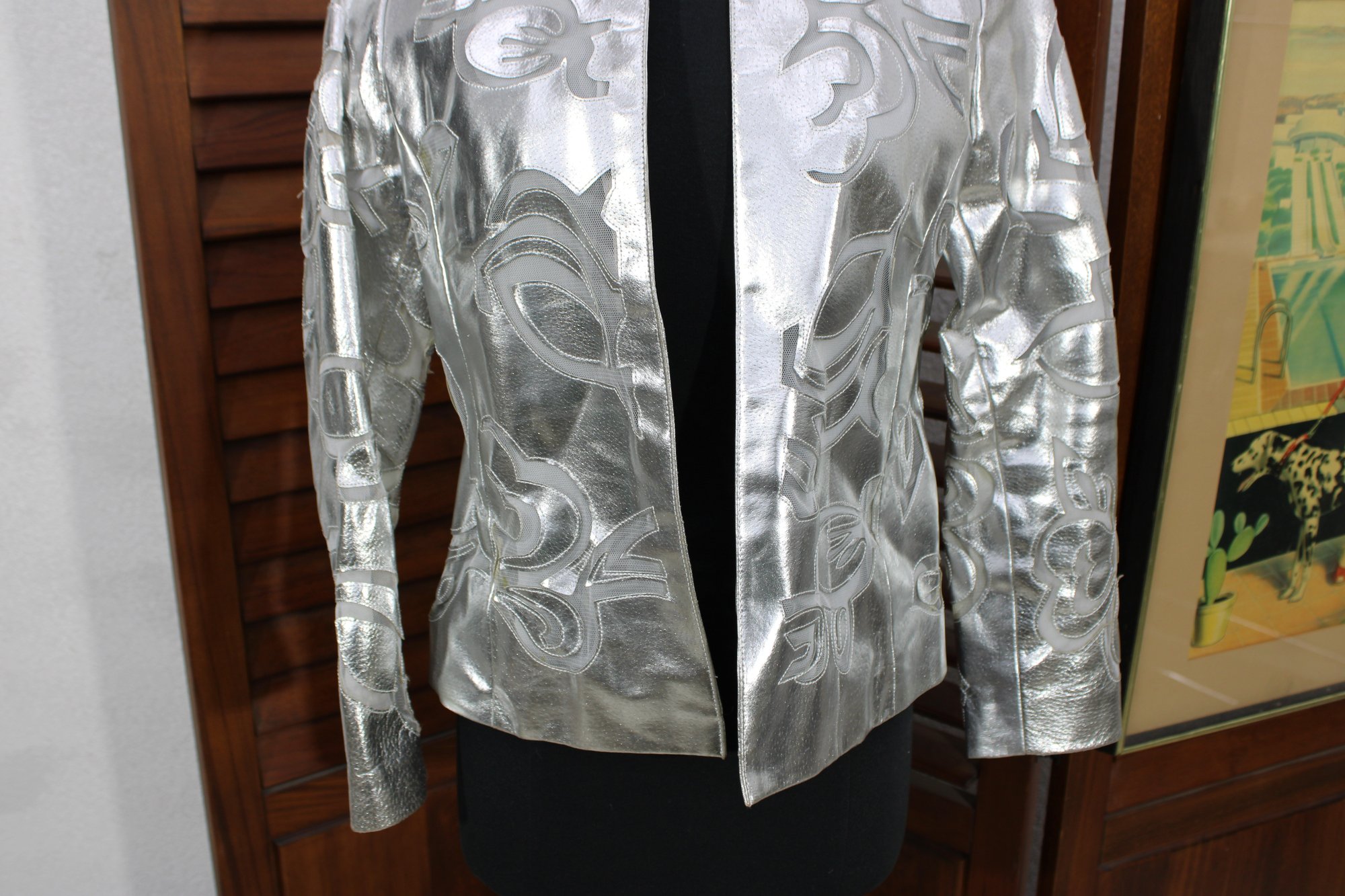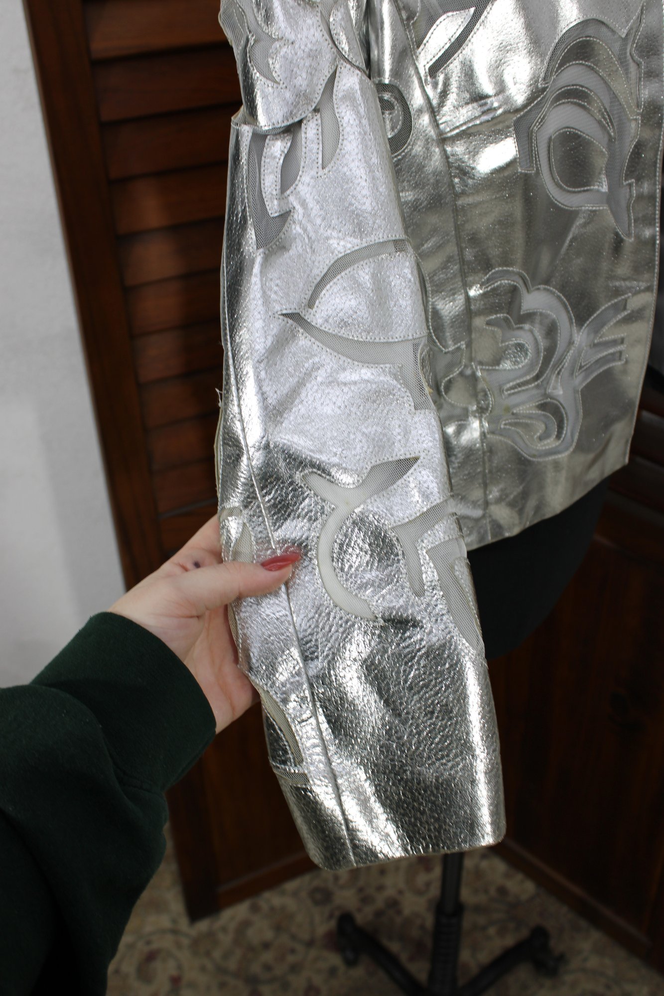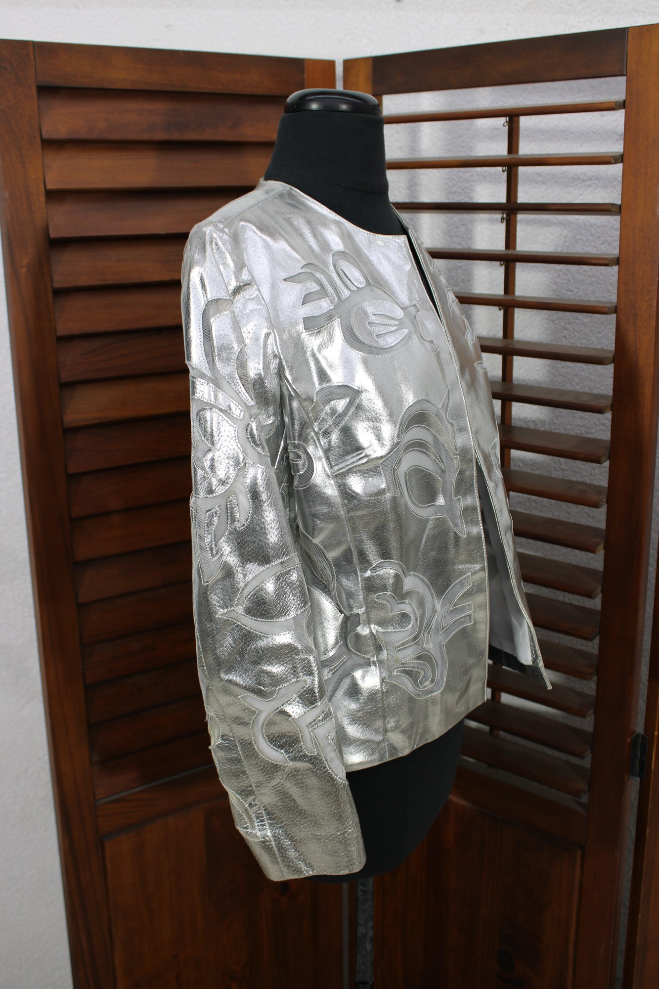 a stunning Chico’s silver jacket in size 0. The piece features an elegant open-front design with a beautiful embossed floral pattern throughout, giving it a textured, high-shine finish. The tailored shape and lightweight construction make it perfect for layering over dresses or tops for evening wear, special events, or dressy occasions.