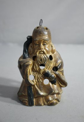 it features the image of a wise, bearded sage with traditional Chinese attire, signifying wisdom and calm. The figure's robe doubles as the body of the candle holder, with circular cutouts that allow the gentle light of a tealight to radiate a warm, peaceful glow.