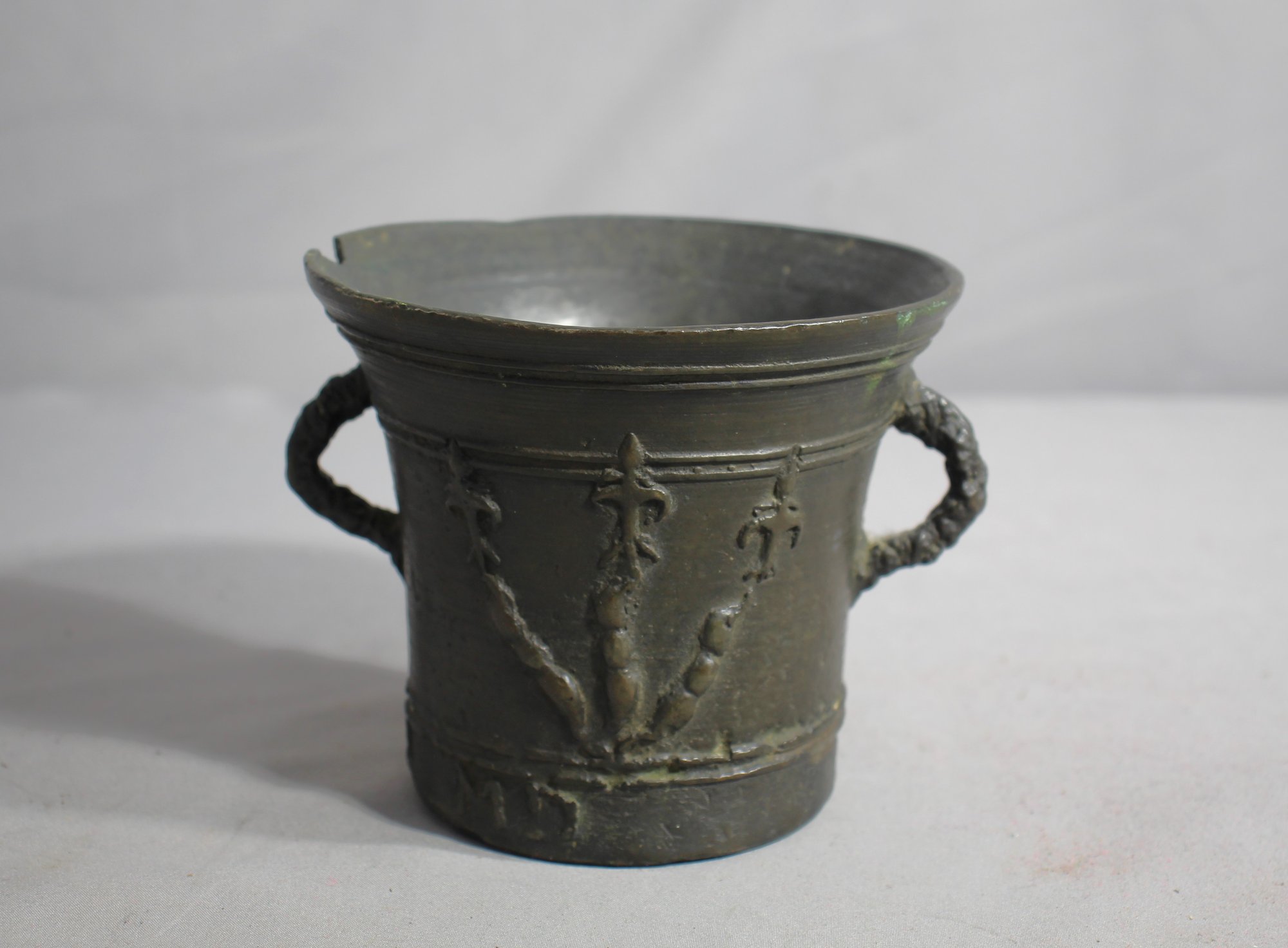 The vessel boasts a robust body adorned with classical motifs and reliefs that hearken back to a bygone era. Its two twisted iron handles add a practical element to its design, while contributing to its overall antique aesthetic. This piece stands as a testament to the functional art of metalwork, with a patina that tells a story of many years and many hands.
