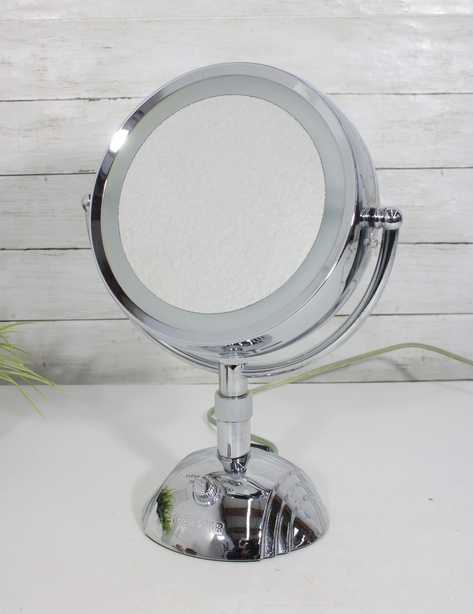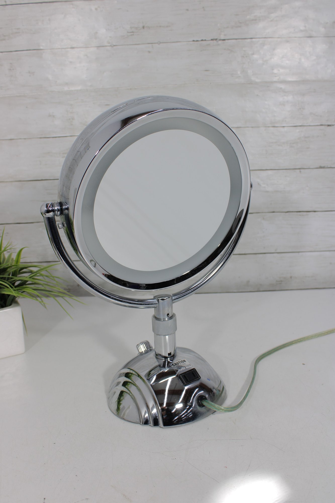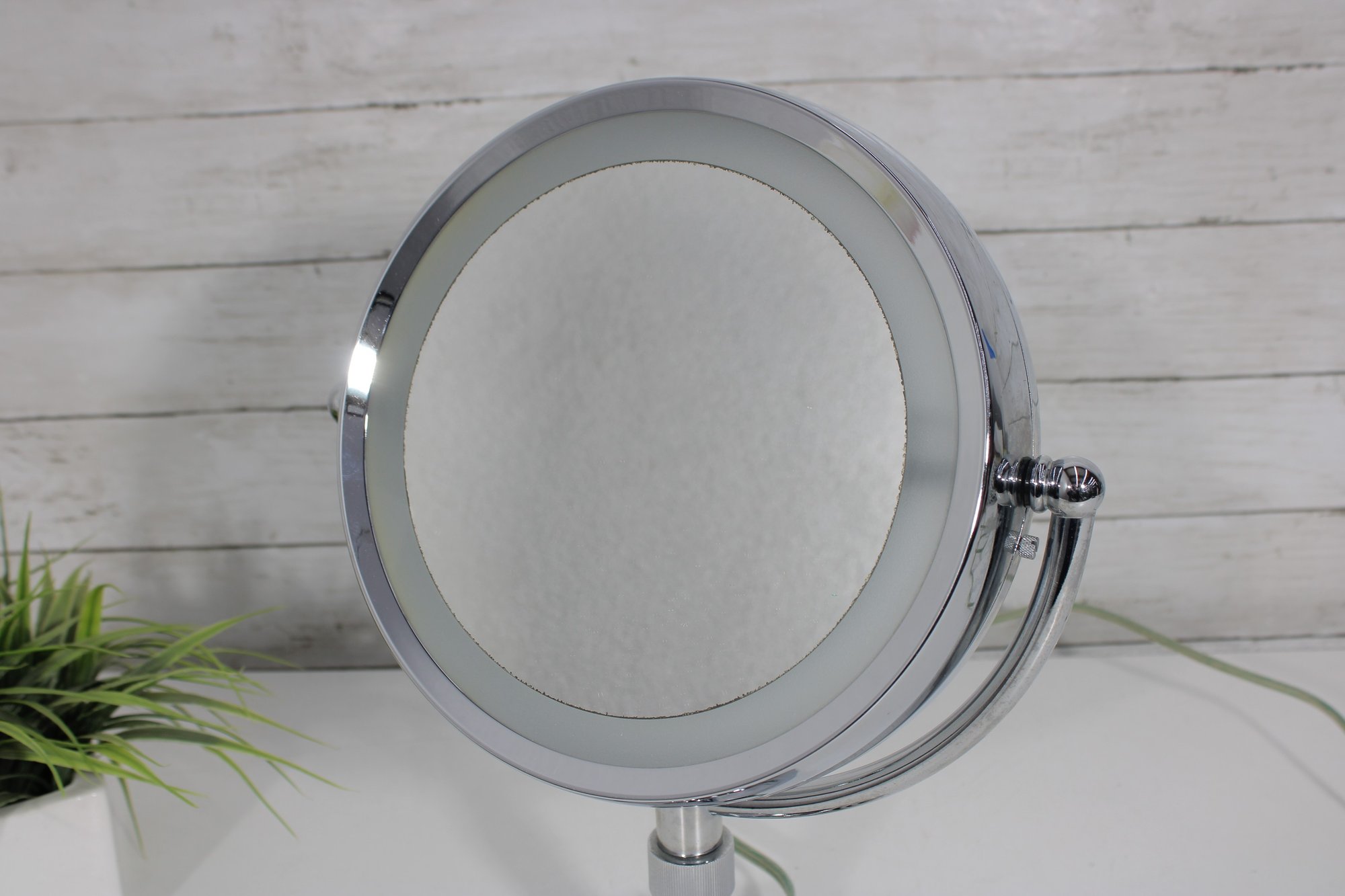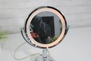 a sleek and functional chrome lighted vanity mirror, perfect for everyday grooming or makeup application. This double-sided mirror features a standard reflection on one side and magnification on the reverse, allowing for detailed viewing.
