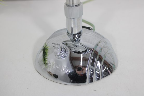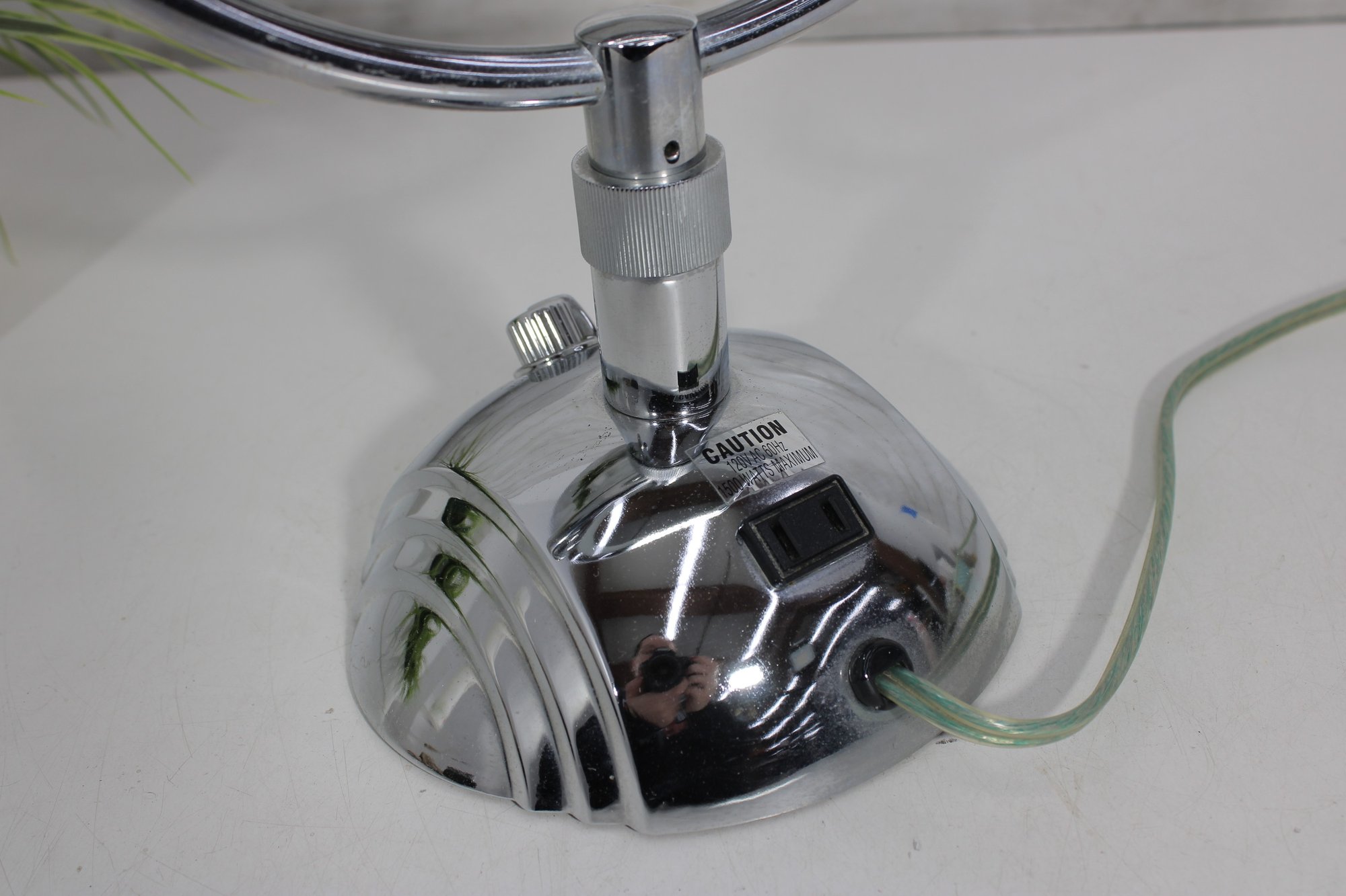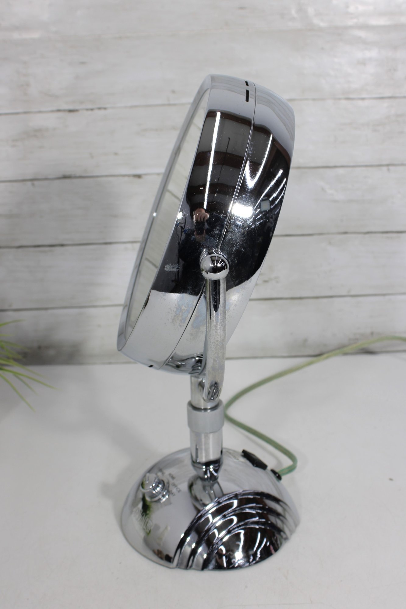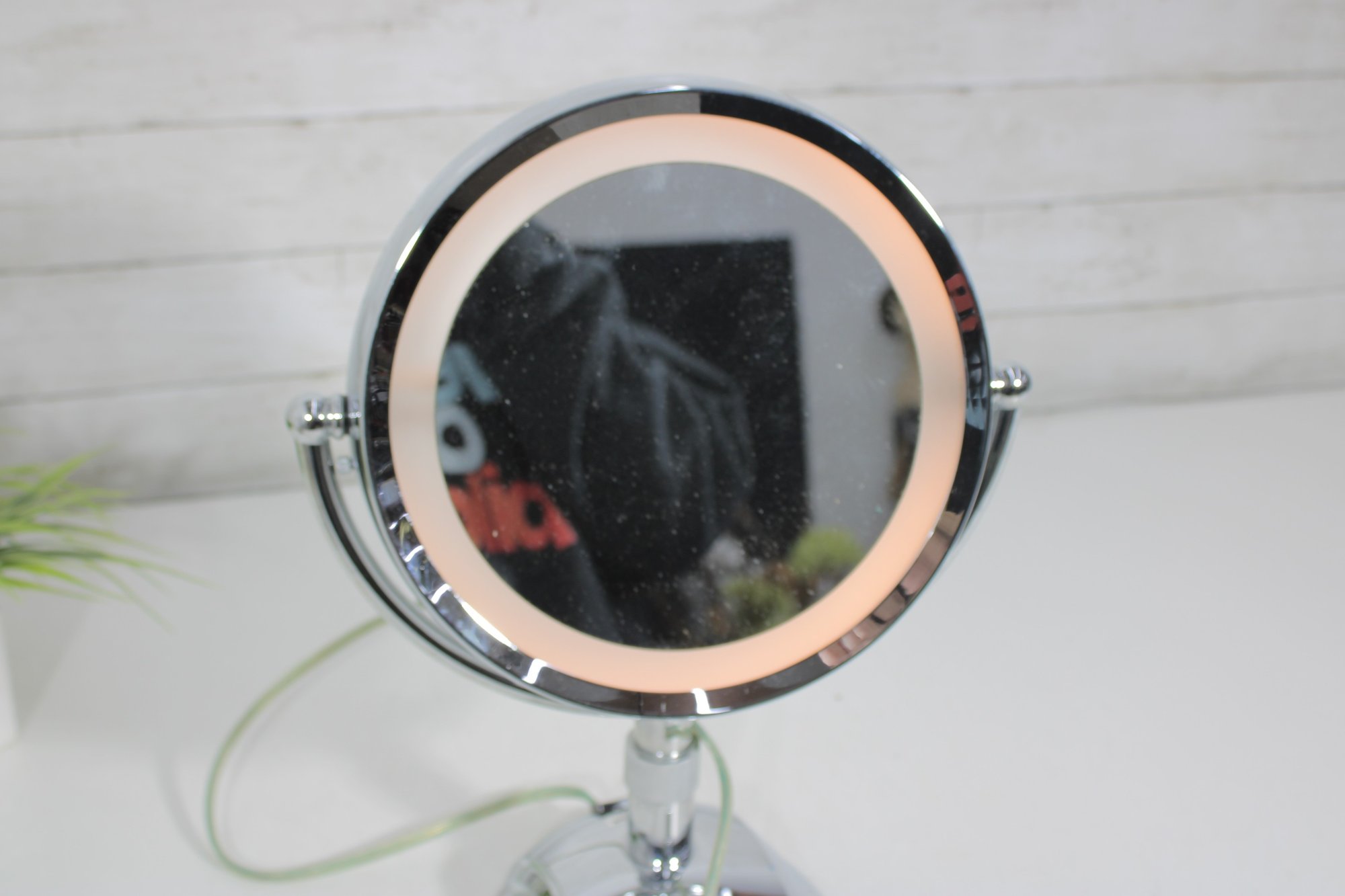 a sleek and functional chrome lighted vanity mirror, perfect for everyday grooming or makeup application. This double-sided mirror features a standard reflection on one side and magnification on the reverse, allowing for detailed viewing.