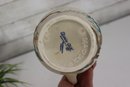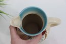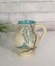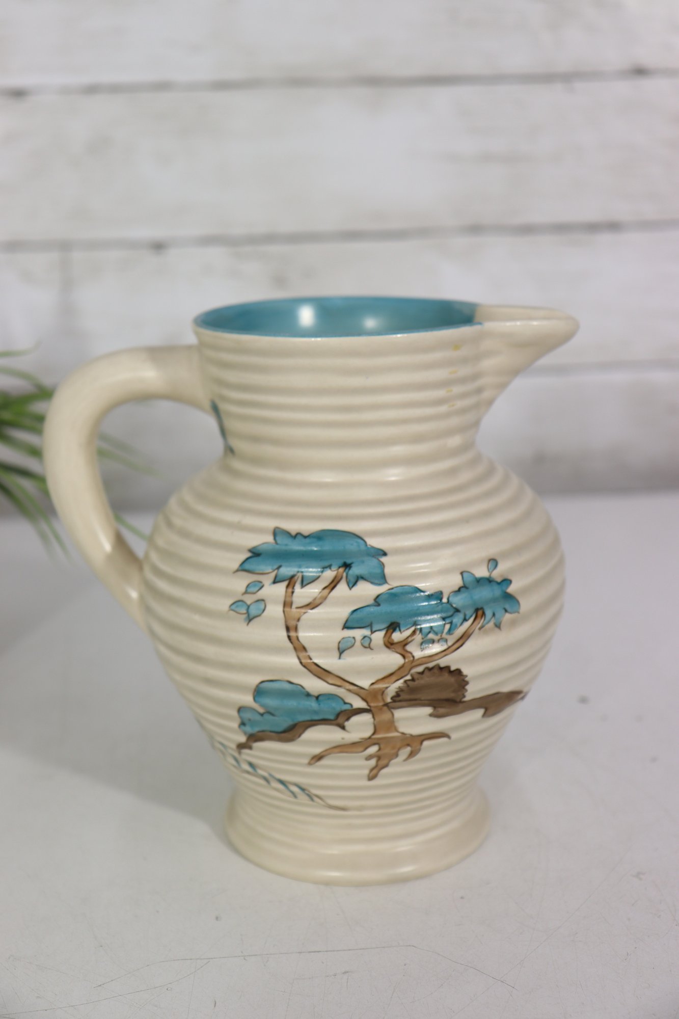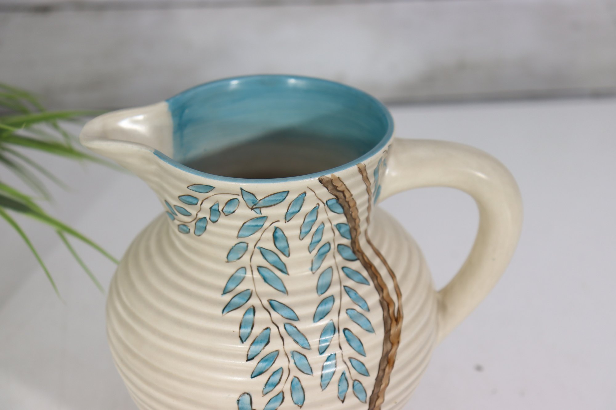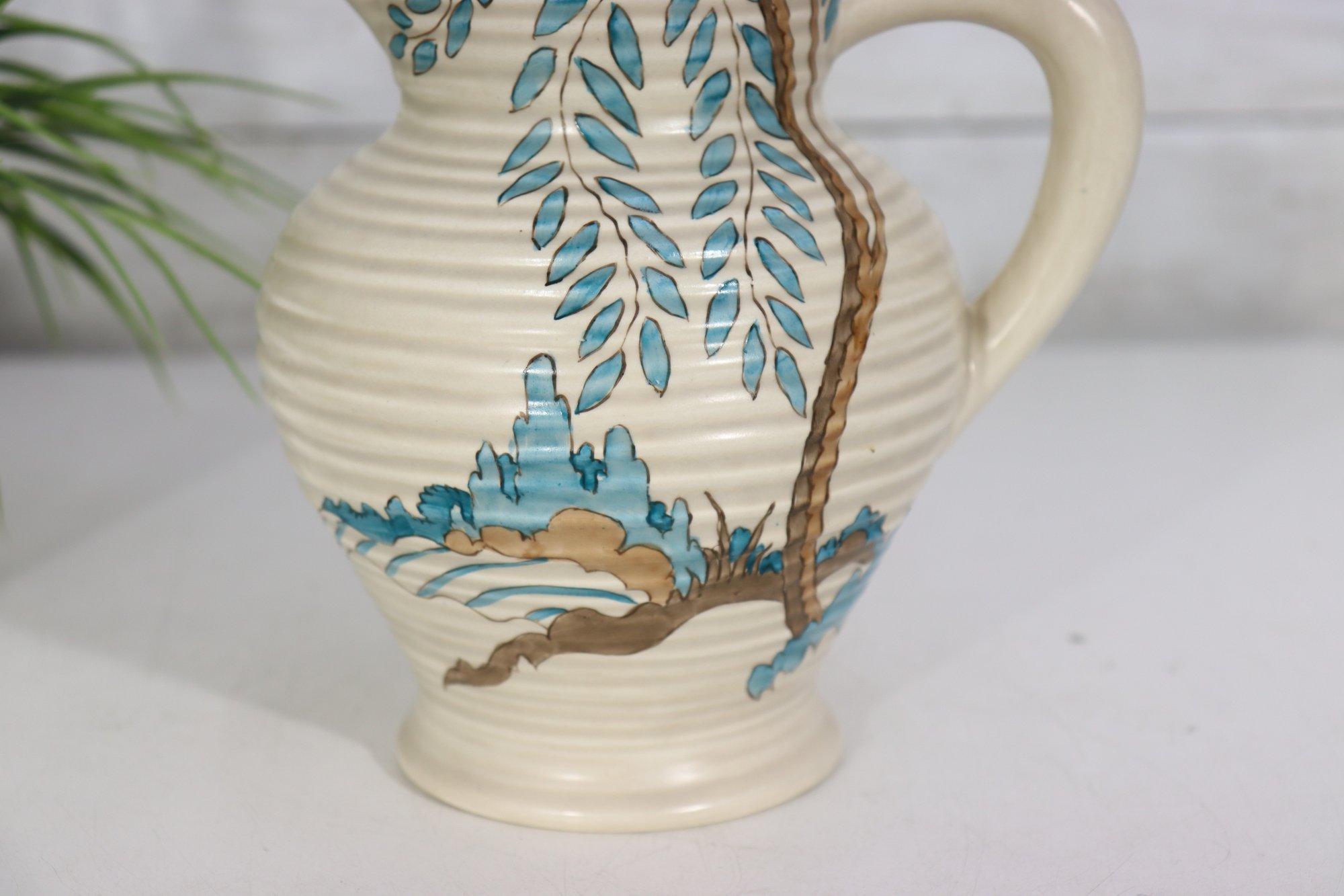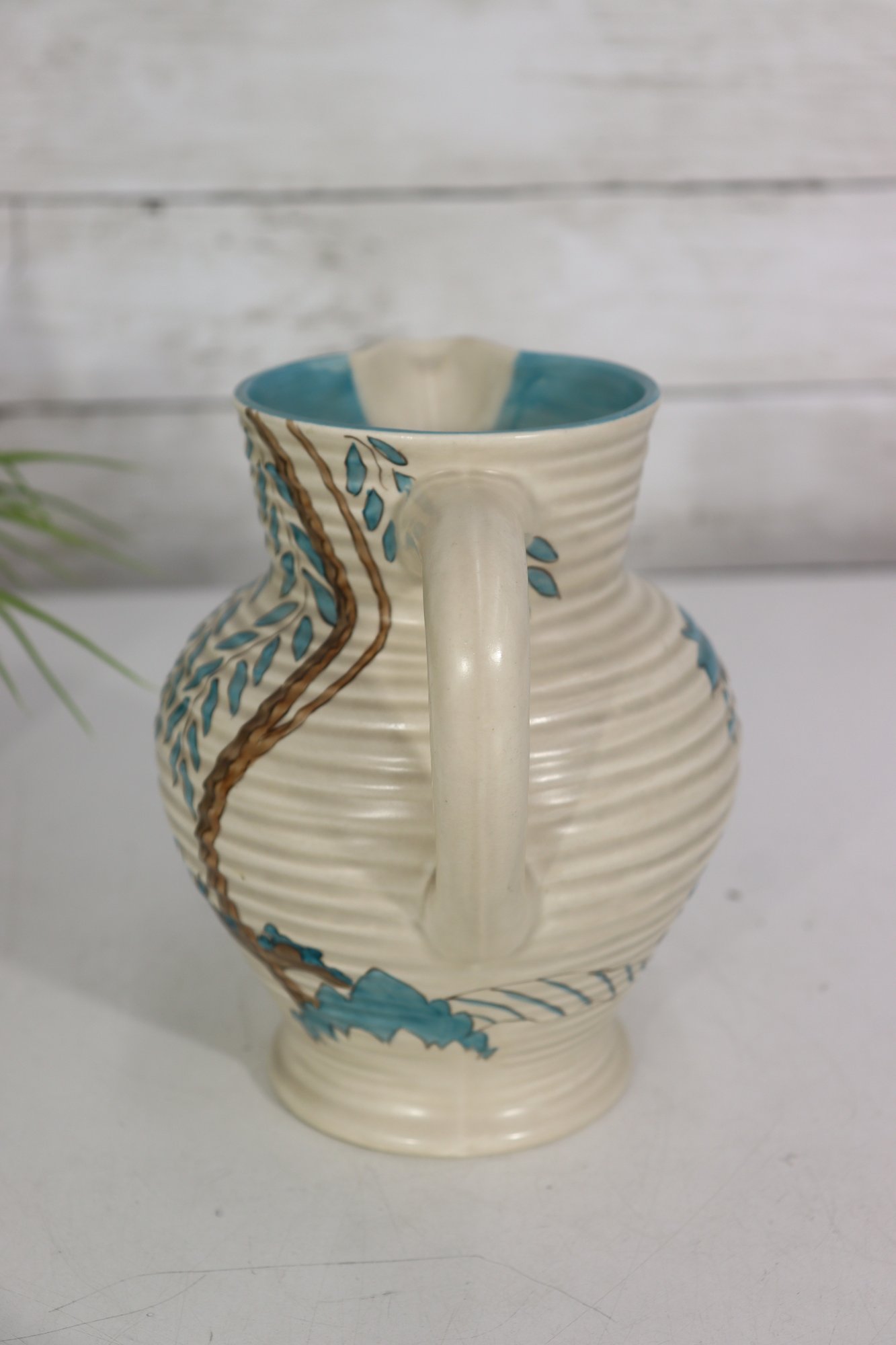 a beautiful Clarice Cliff “Mowcop” Lotus Jug, standing approximately 7 inches tall. This classic piece showcases Cliff’s signature hand-painted Art Deco styling, featuring raised ribbed texture, flowing willow-like foliage, and a serene landscape in shades of turquoise, tan, and brown.