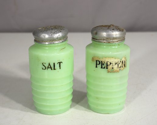 Iconic vintage Fire King Jadeite salt and pepper shakers with ribbed design and black lettering. A must-have for collectors of retro kitchenware.