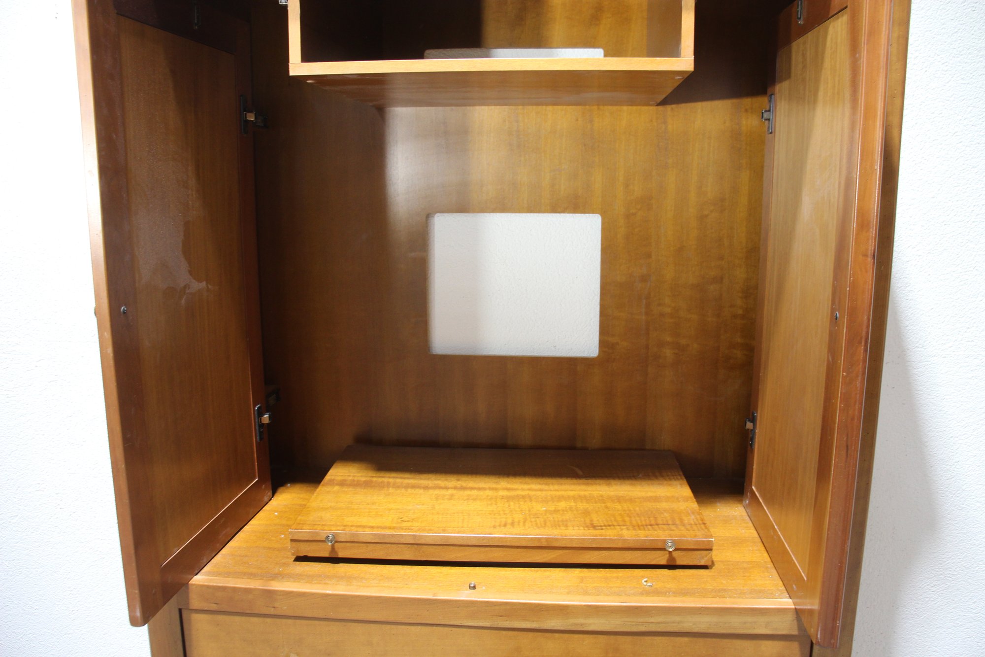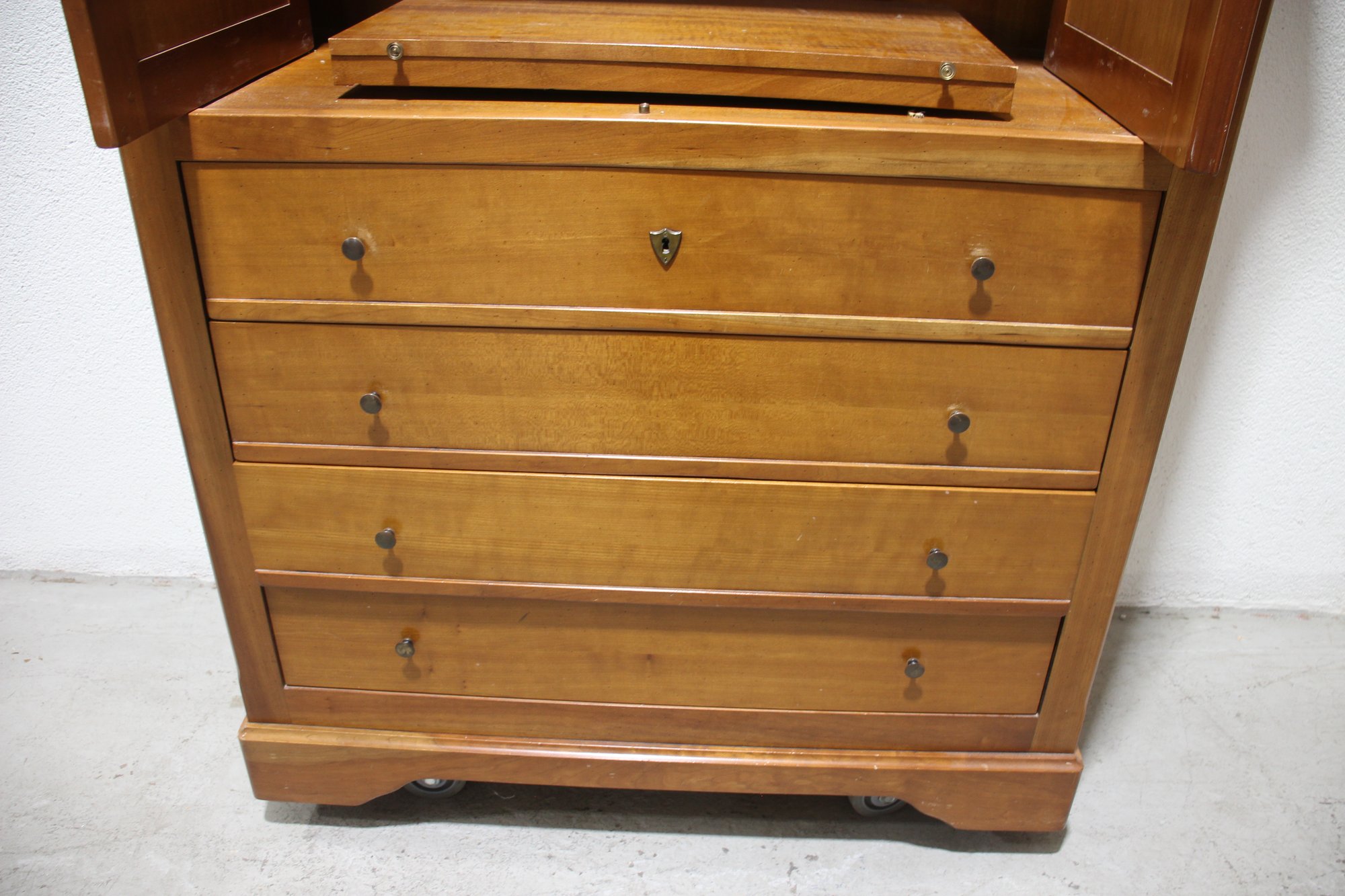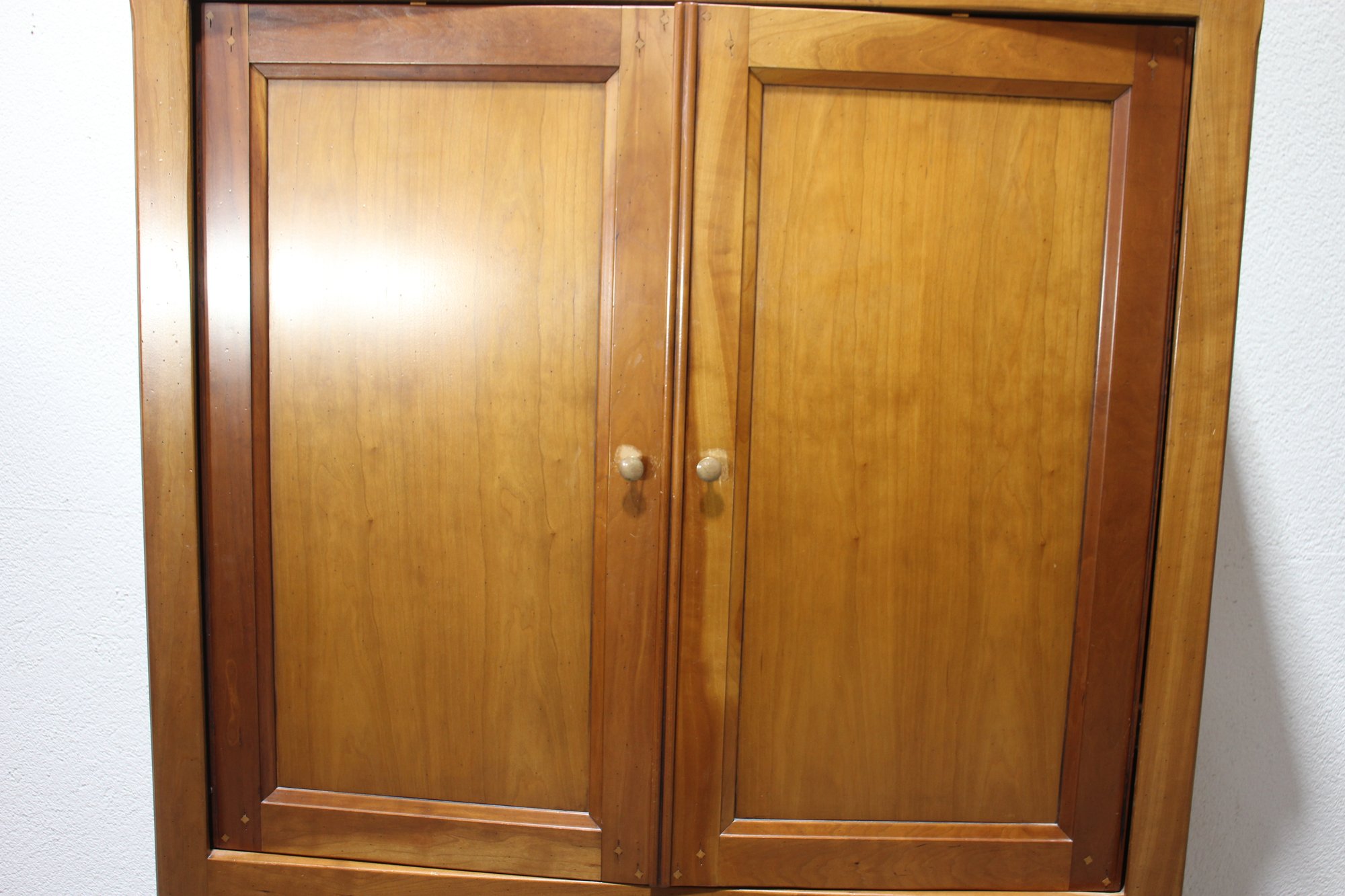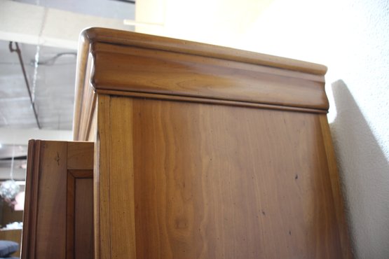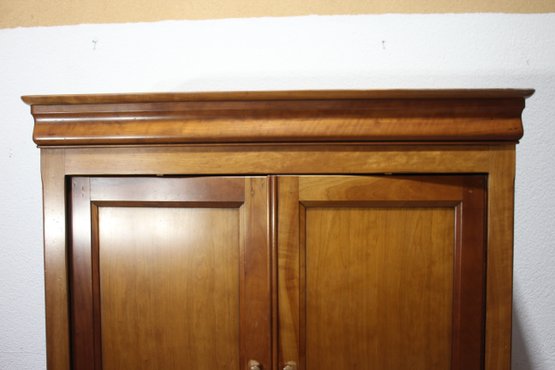 This classic wooden armoire is a versatile and stylish storage solution, featuring a spacious cabinet with paneled double doors and four deep drawers for organization. Crafted from solid wood with a warm finish, this piece blends functionality with timeless elegance.