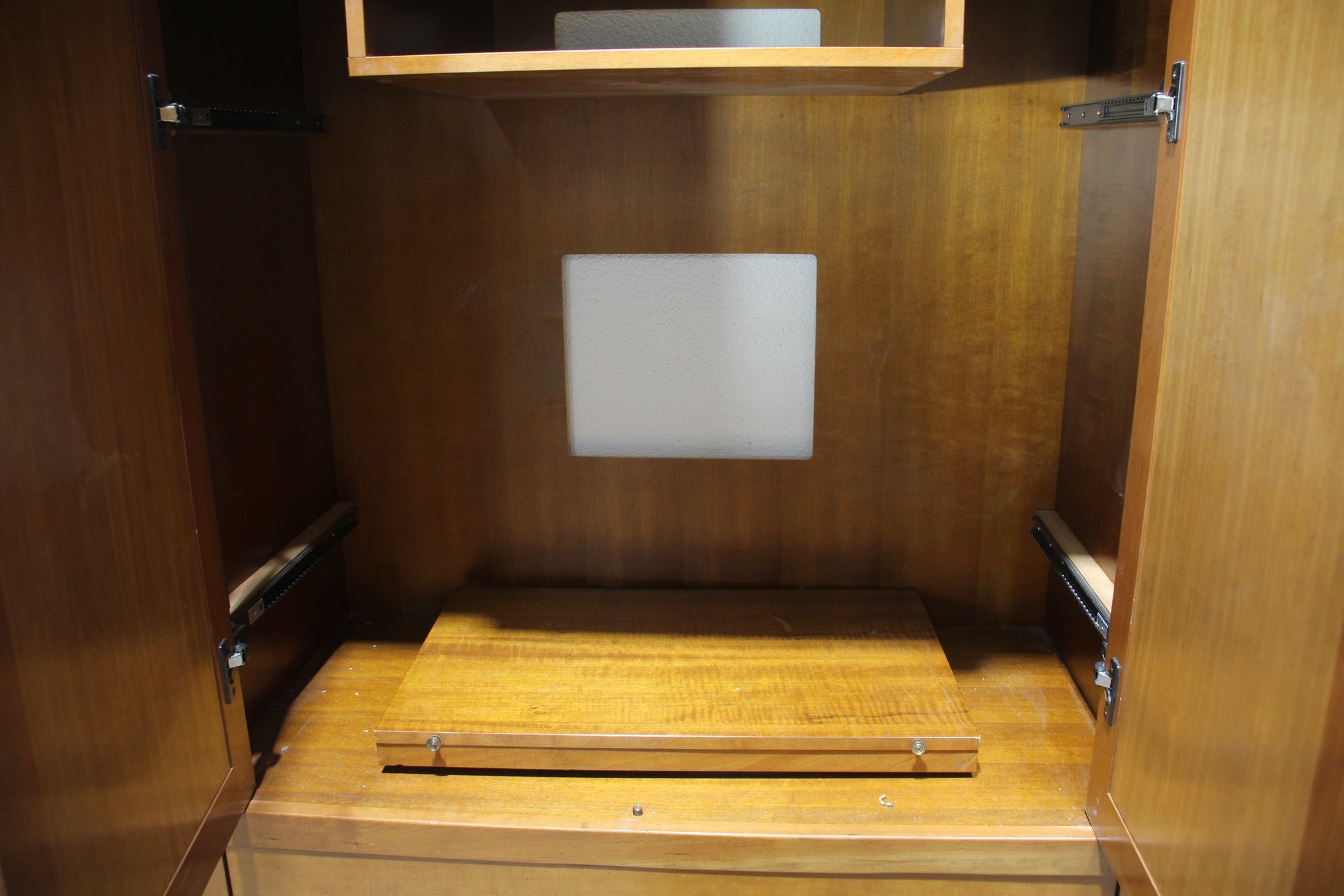 Measuring 78 inches high, 42 inches wide, and 21 inches deep, the armoire offers ample storage space. The upper compartment features a large open area with an adjustable shelf and a cable cutout, making it suitable for electronics, clothing, or general storage. Below, four deep drawers with brass keyholes provide additional storage for linens, clothes, or accessories.