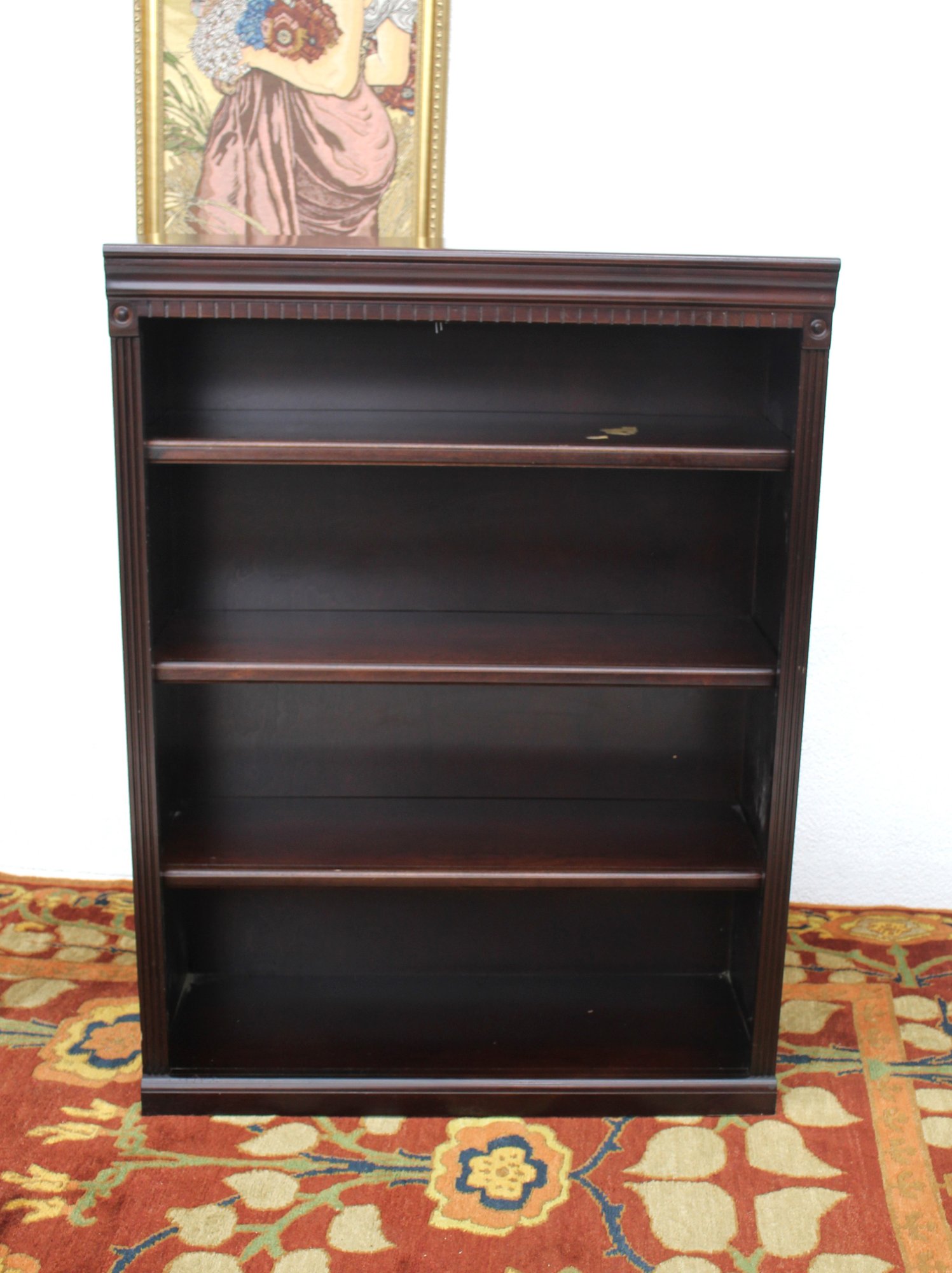 This elegant wooden bookshelf is a timeless addition to any room, featuring a classic dark finish and decorative trim along the top edge. With three spacious shelves, it provides ample storage for books, décor items, or collectibles. There is a noticeable area of wear on one shelf, which can be seen in the photos, adding a touch of character to this vintage piece.