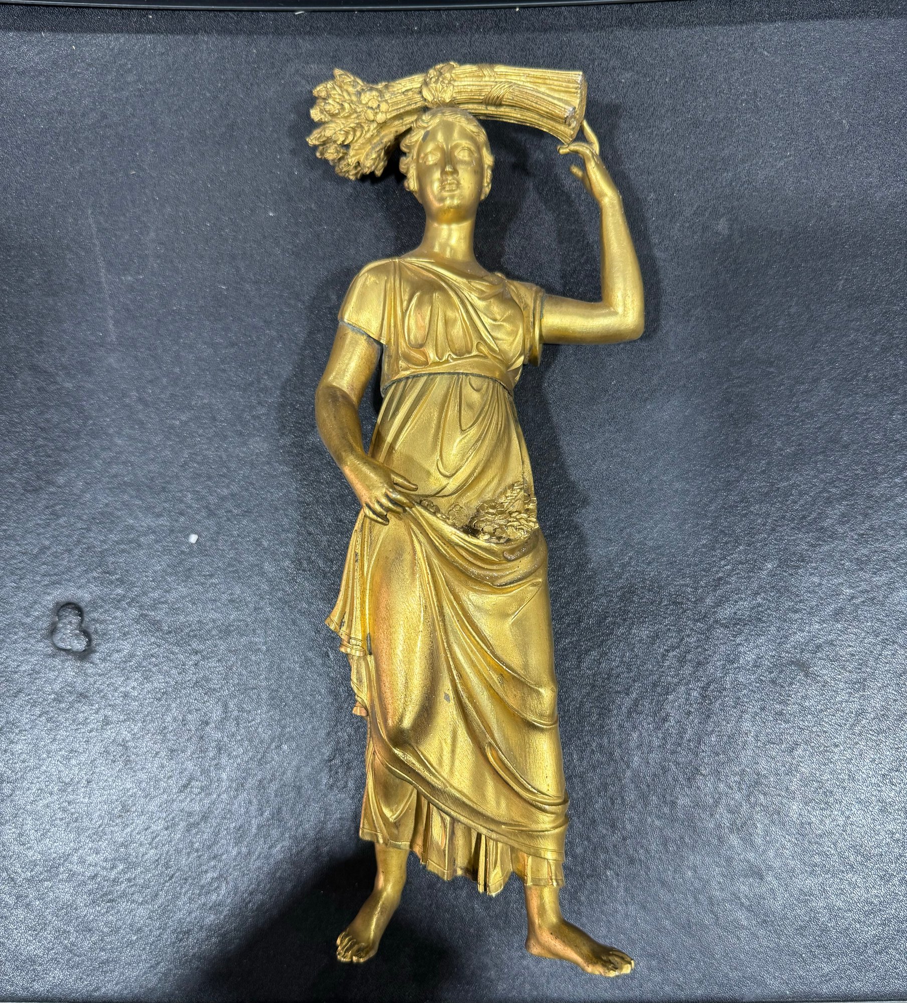 The statue depicts a classical goddess, poised with elegance, as she gracefully holds aloft a sheaf of wheat. Crafted with attention to the draping of her garments and the serene expression on her face, this piece is a homage to ancient artistry.