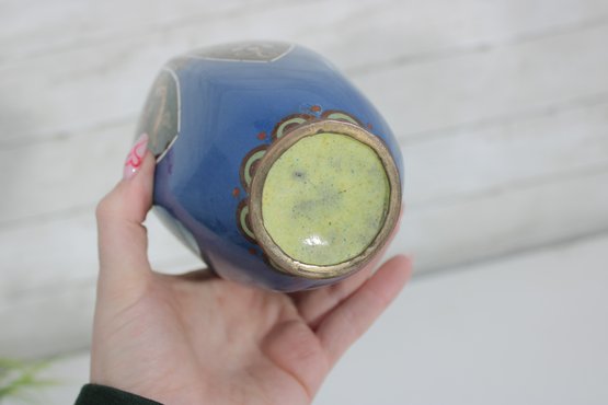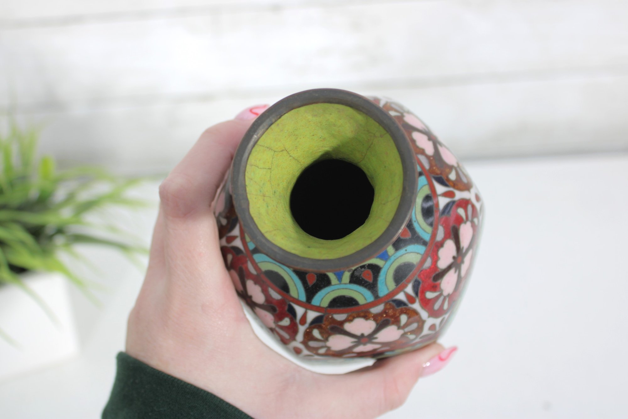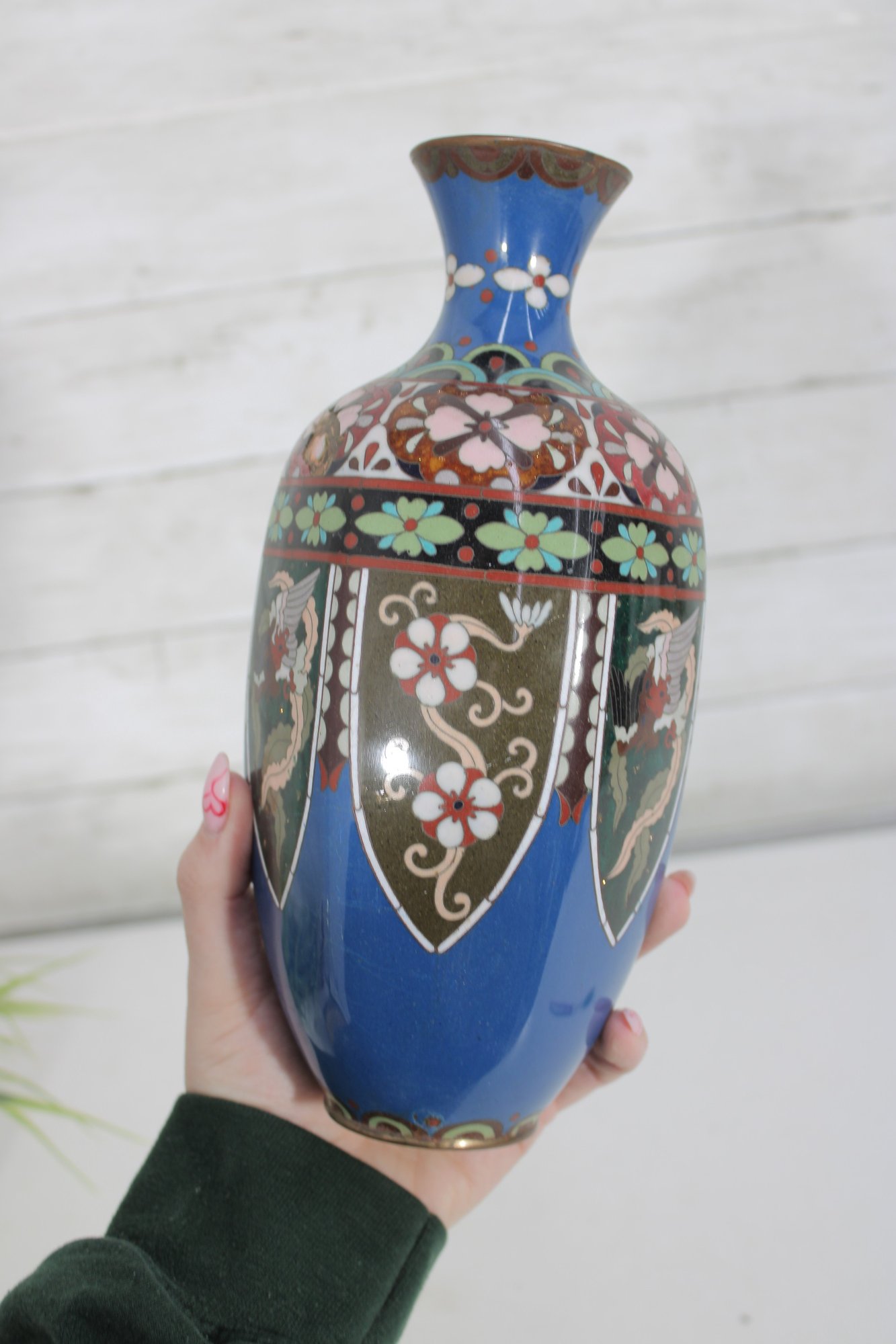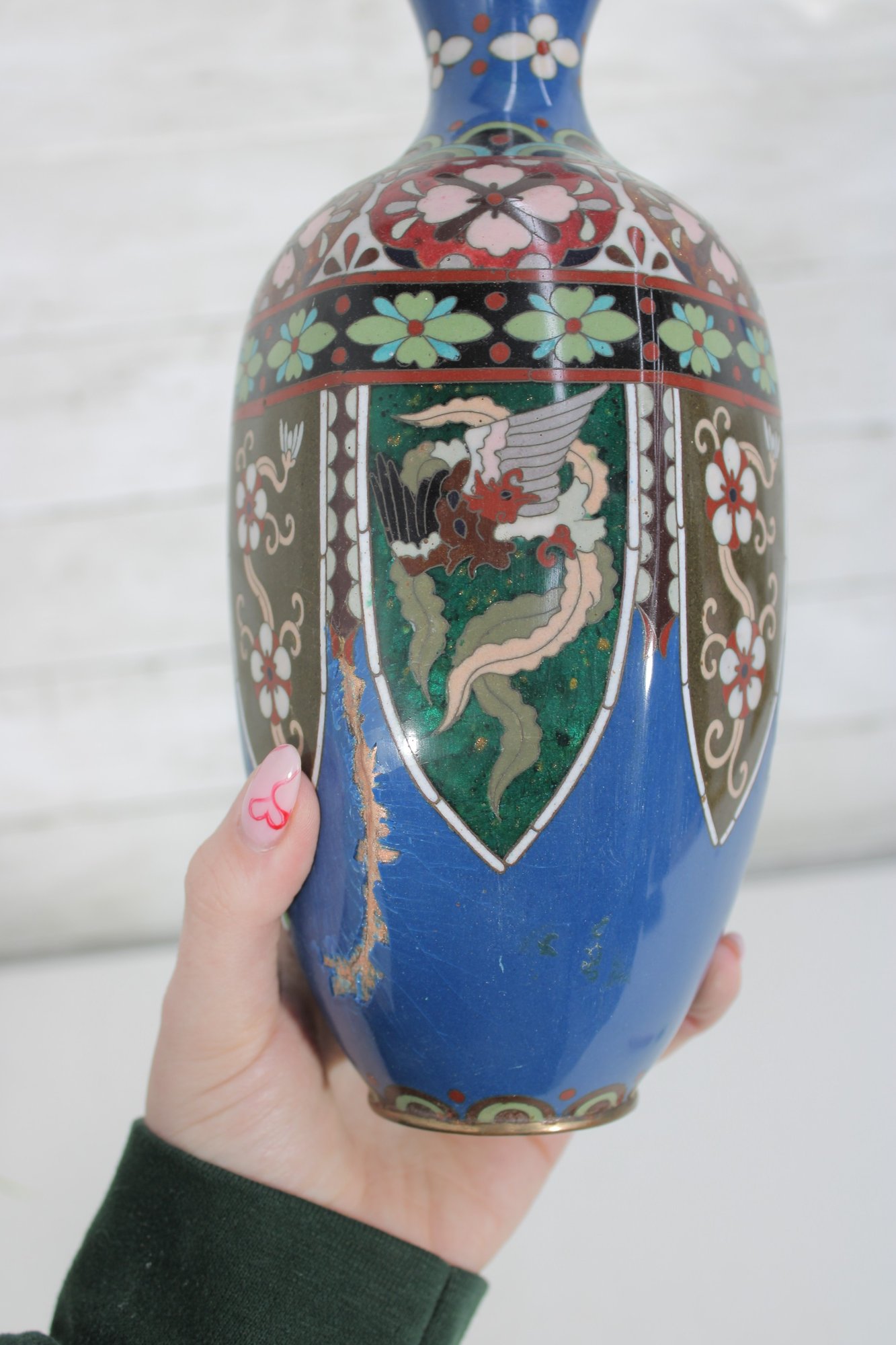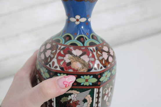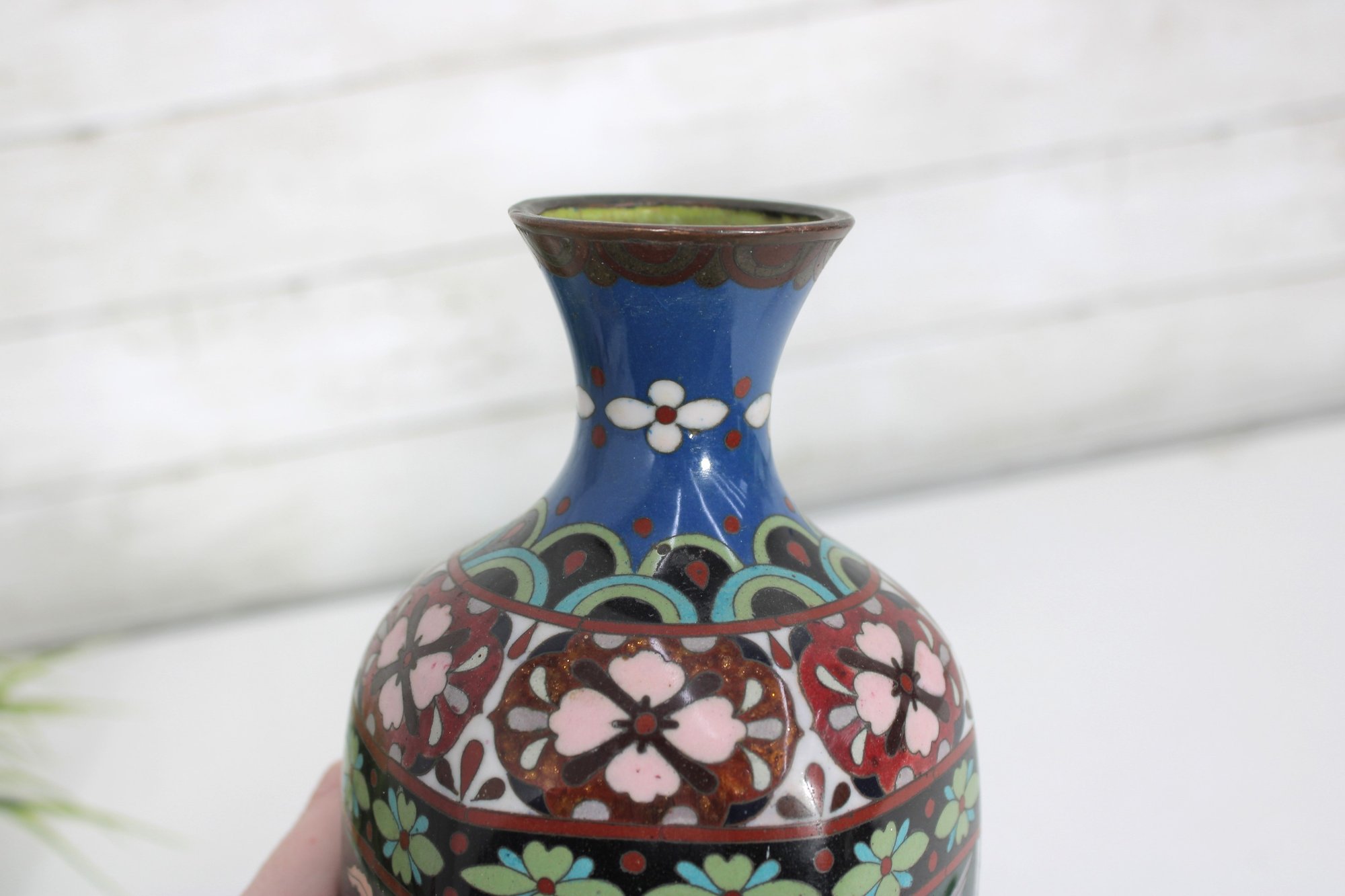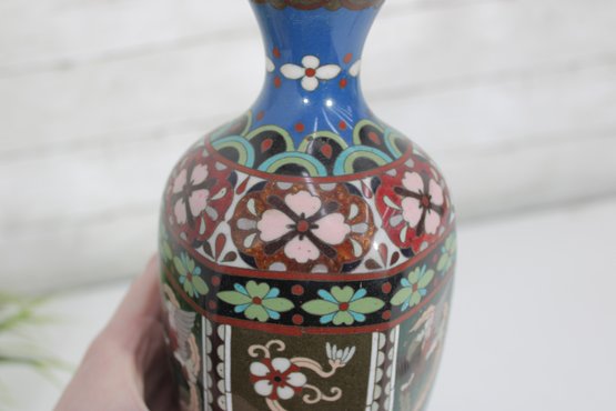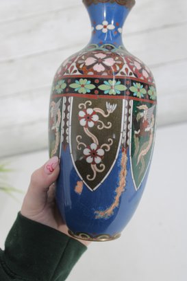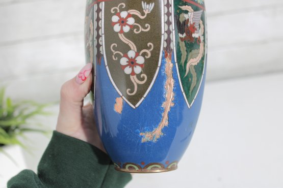 The vase measures approximately 9.5 inches in height and displays well with a classic baluster form and flared neck. Please note there is visible enamel loss and wear in areas, consistent with age and handling, which can be seen in the photographs. This wear does not detract from its overall decorative appeal and lends an authentic, time-worn character.