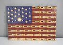 A bold and imaginative take on the American flag, "Clothespin Flag II" is a signed original mixed media artwork by T. Muffatti, created in 2001. Measuring 12" x 17", this piece creatively combines found objects—clothespins, washers, wood dowels, and a painted wooden panel—to reinterpret the stars and stripes in a textured, industrial-folk art style.