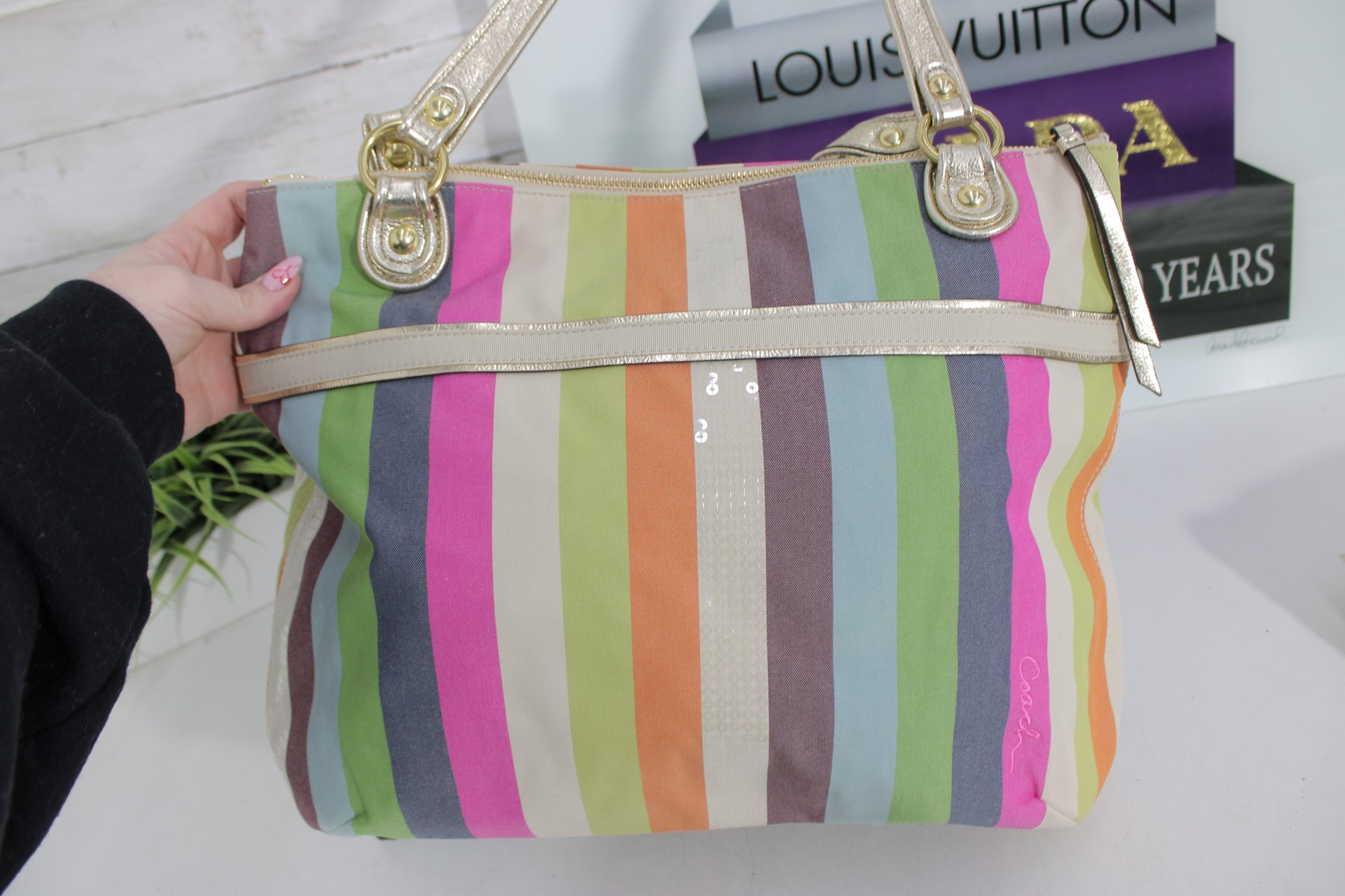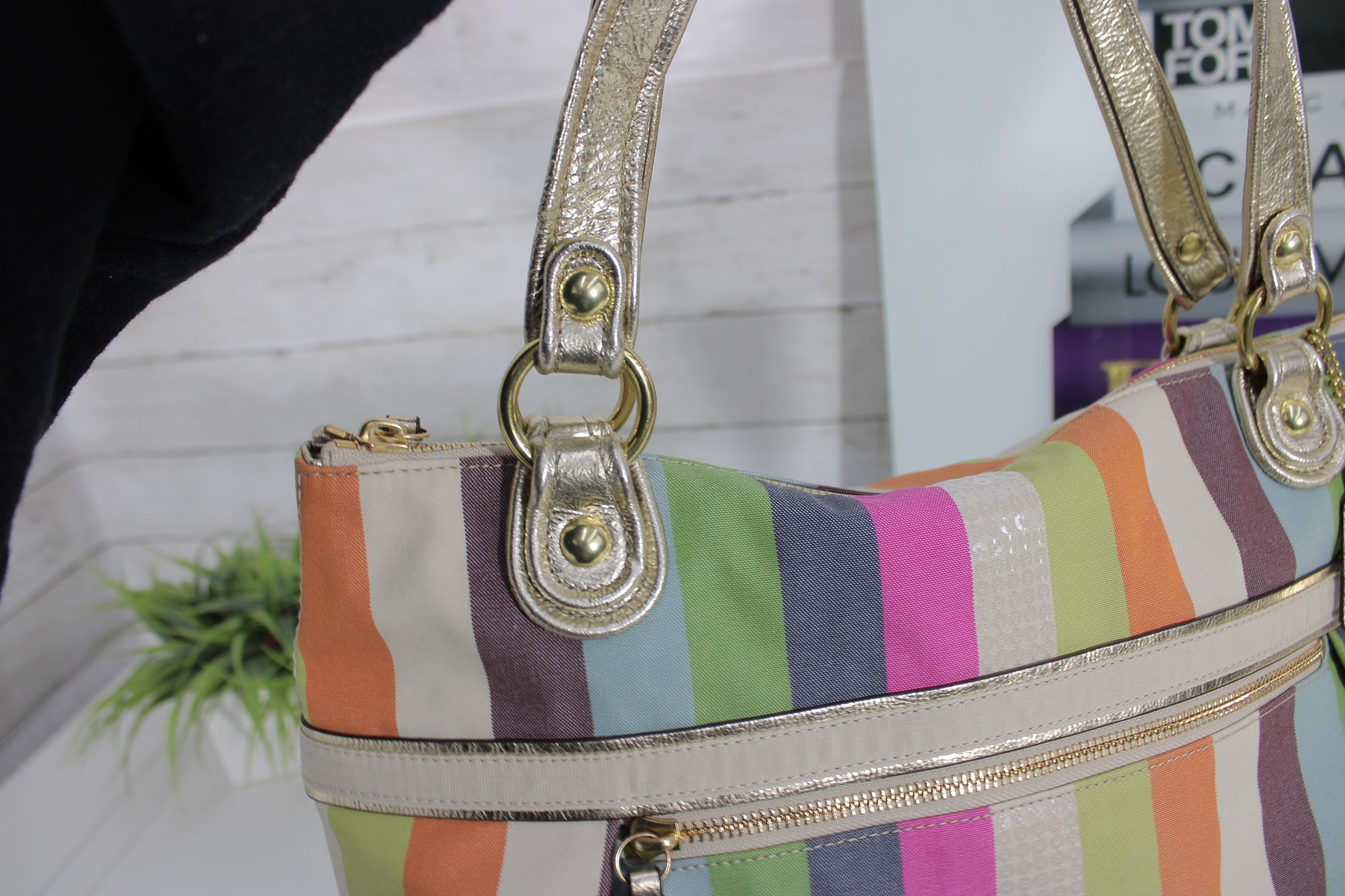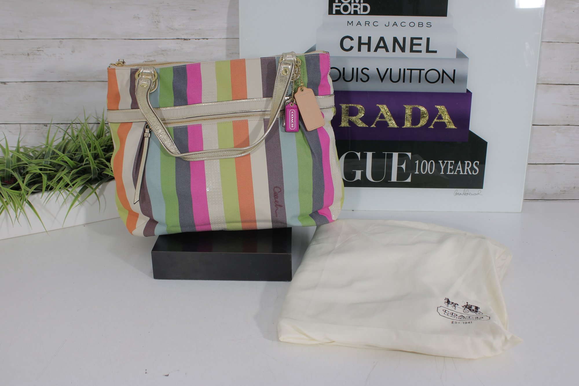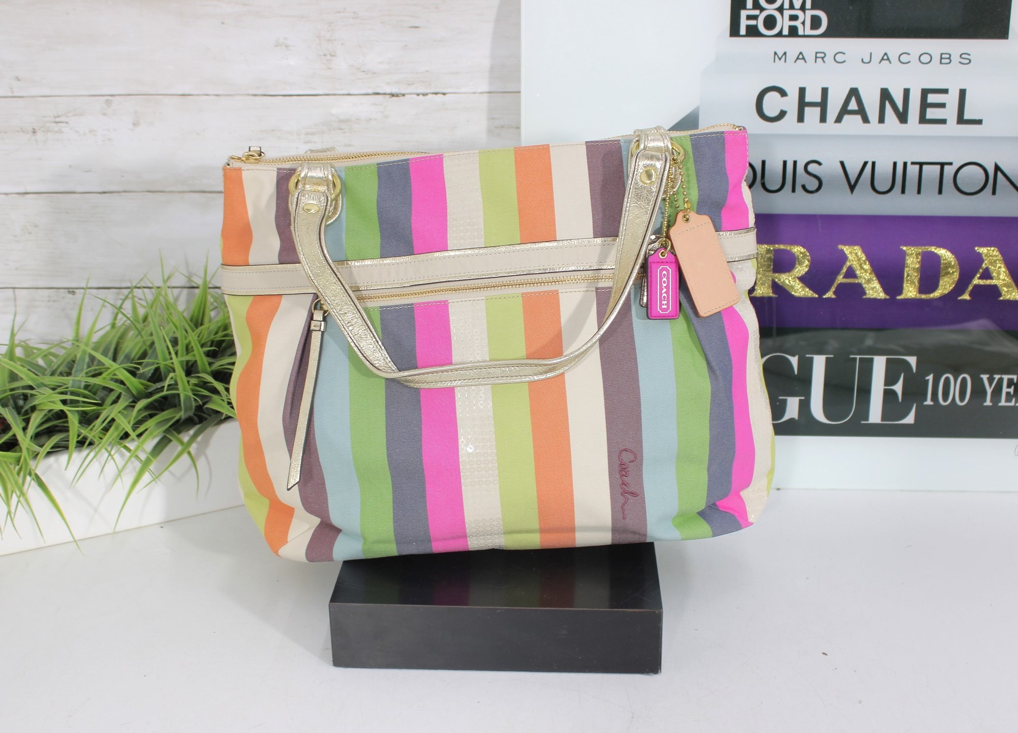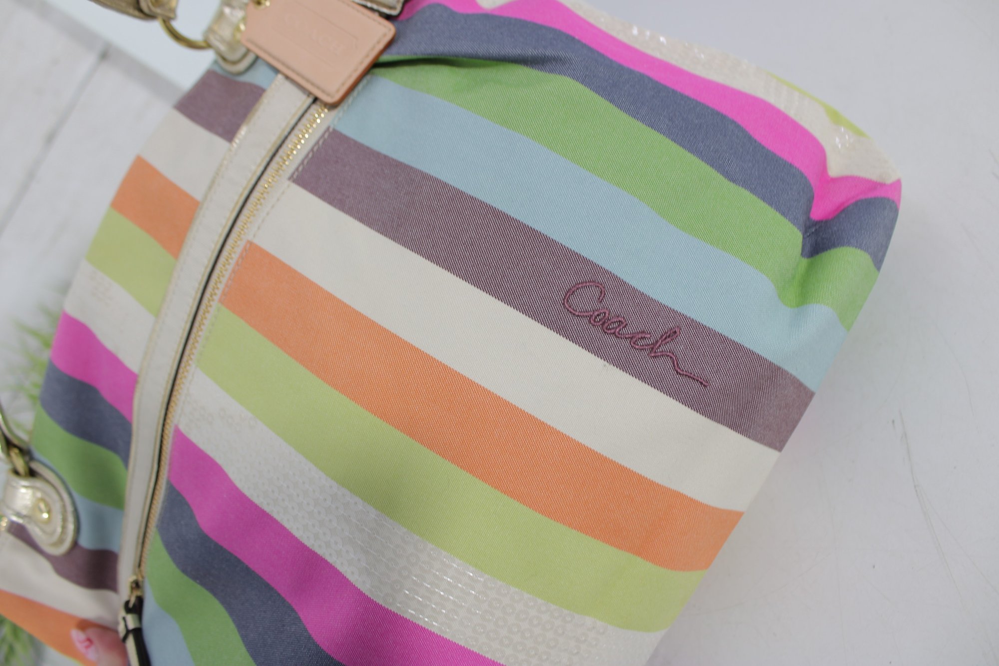 a vibrant and stylish Coach multicolor striped tote bag featuring bright pastel and bold stripe detailing with metallic gold leather trim and hardware. This eye-catching handbag blends playful color with classic Coach craftsmanship.