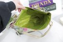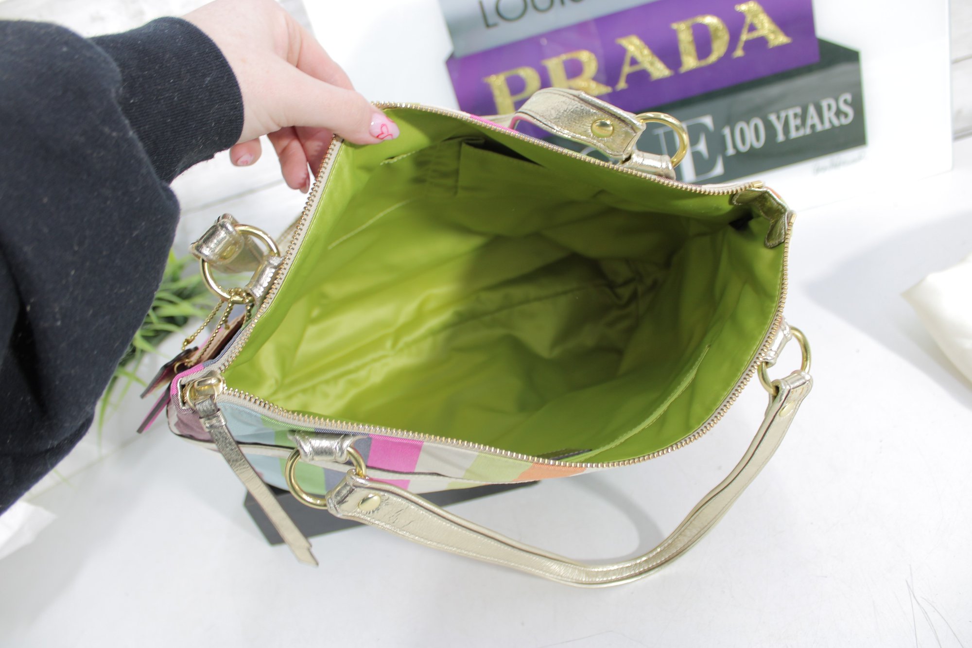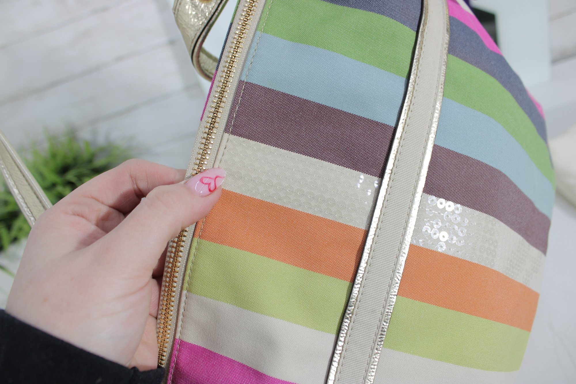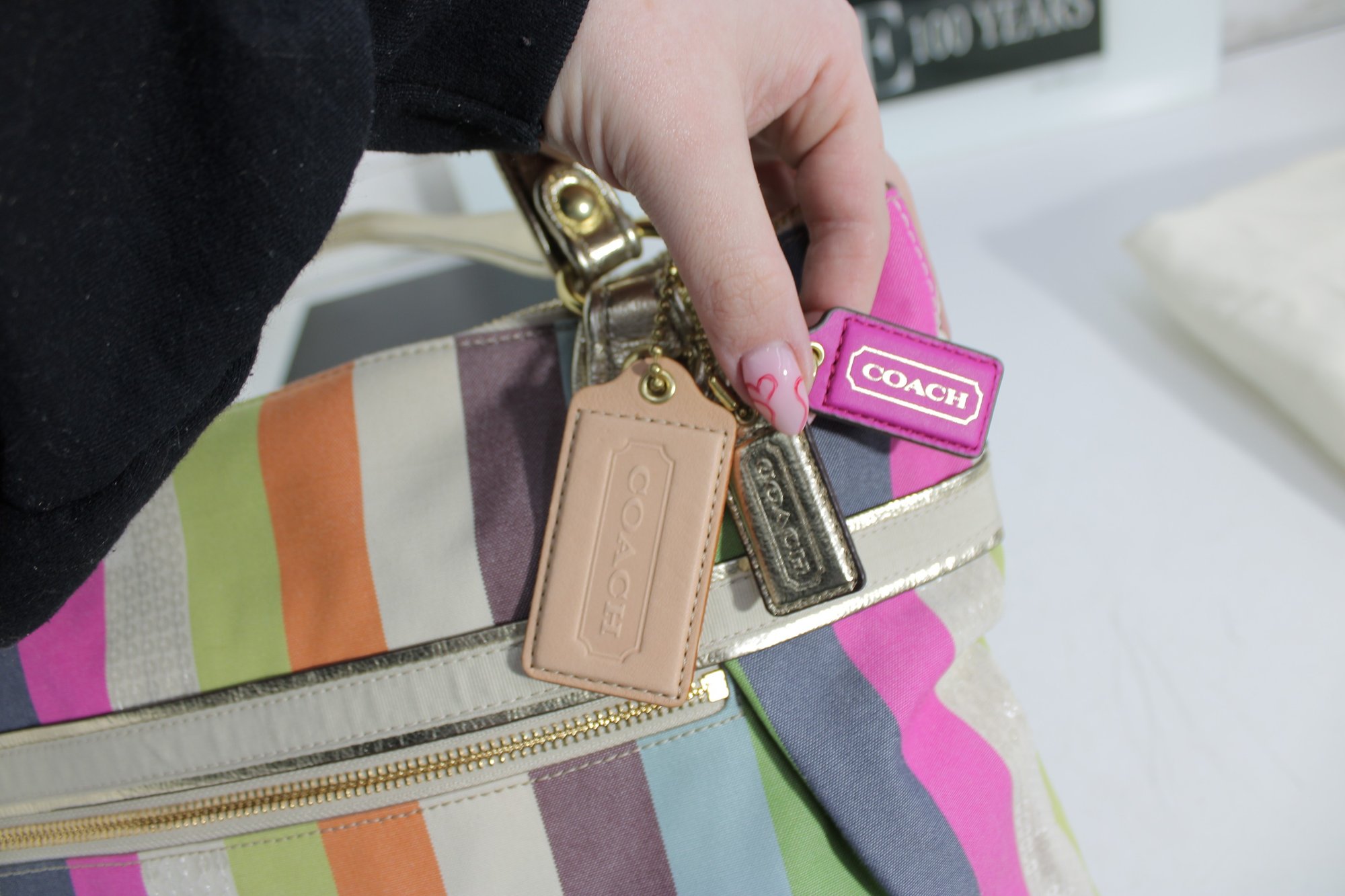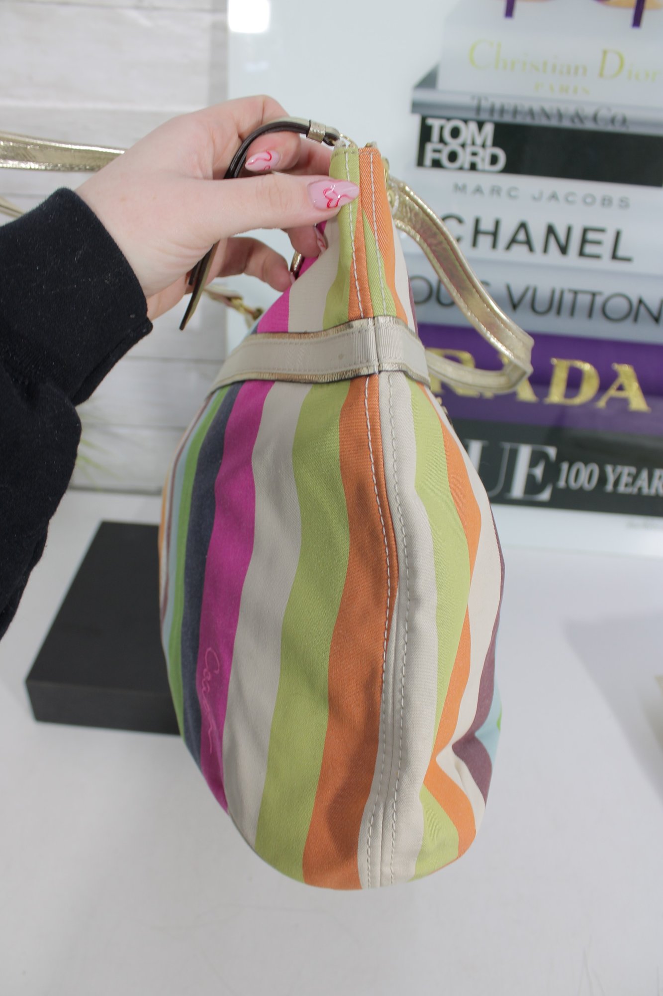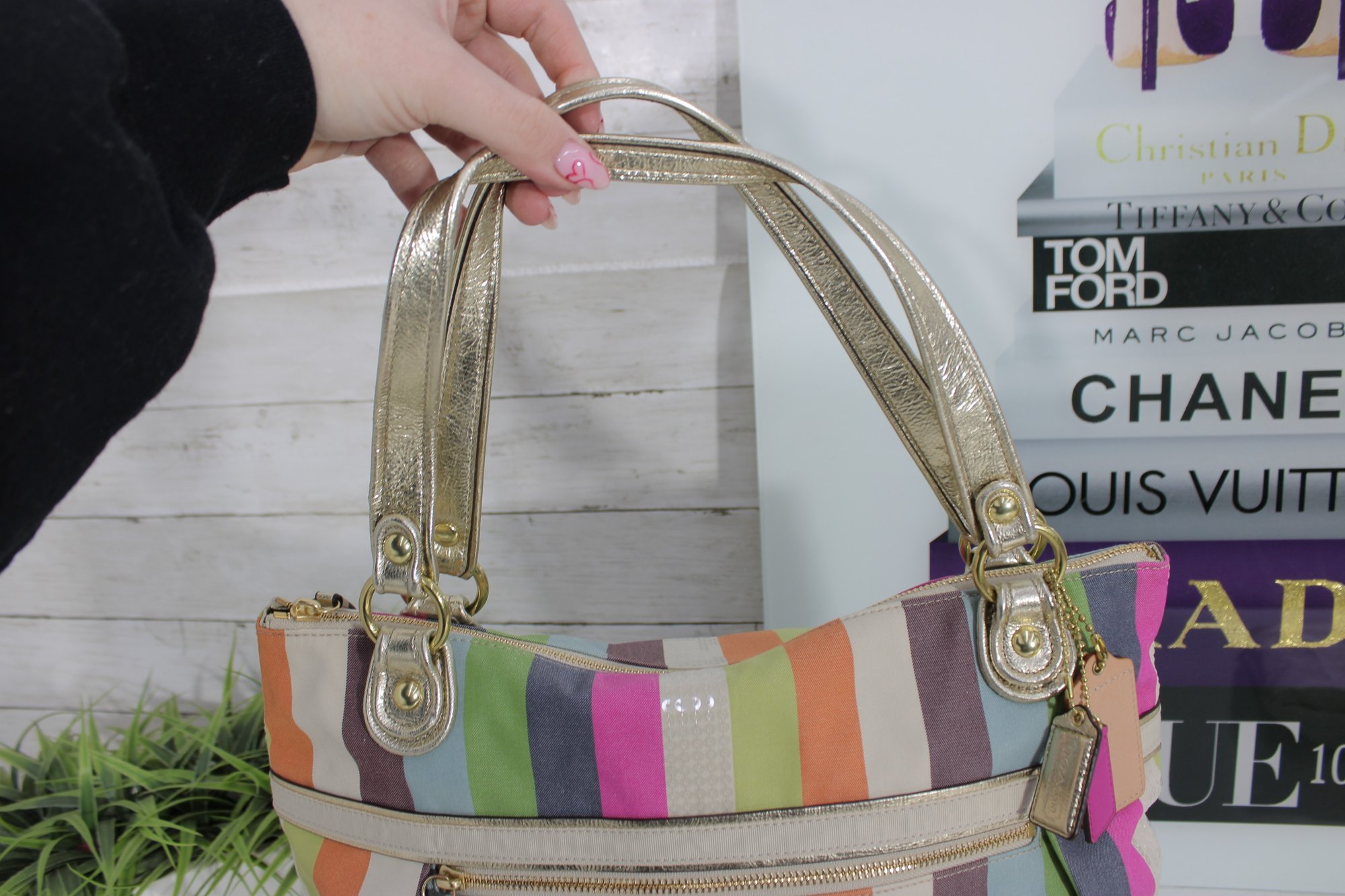 a vibrant and stylish Coach multicolor striped tote bag featuring bright pastel and bold stripe detailing with metallic gold leather trim and hardware. This eye-catching handbag blends playful color with classic Coach craftsmanship.