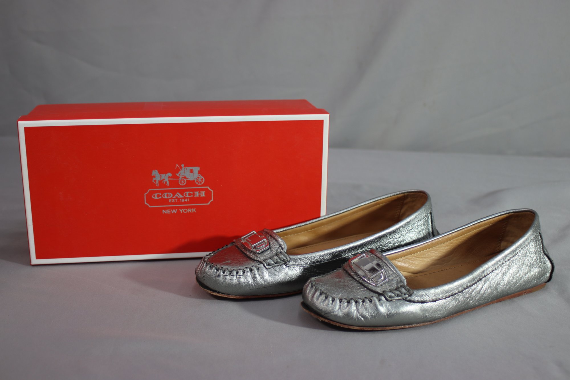Coach Warm Pewter, Happer Metallic Buffalo Flats. Size 9.5 With Original Box