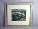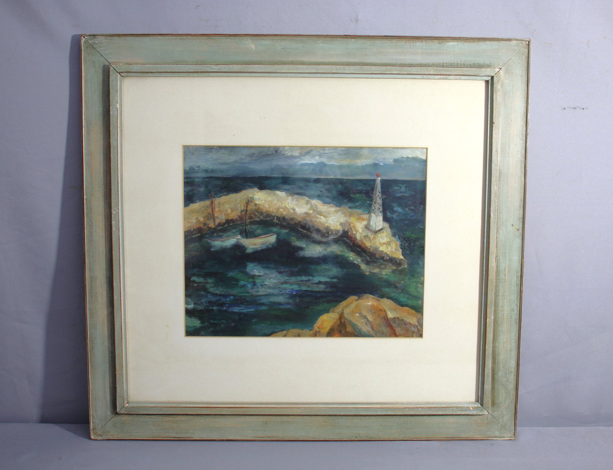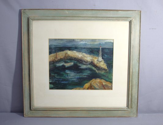 The artwork features a solitary boat anchored against a rugged, rocky outcrop, with a solitary lighthouse standing sentinel in the background. This composition masterfully captures the tumultuous mood of the sea, while the sky above holds a promise of calm with its soothing hues.