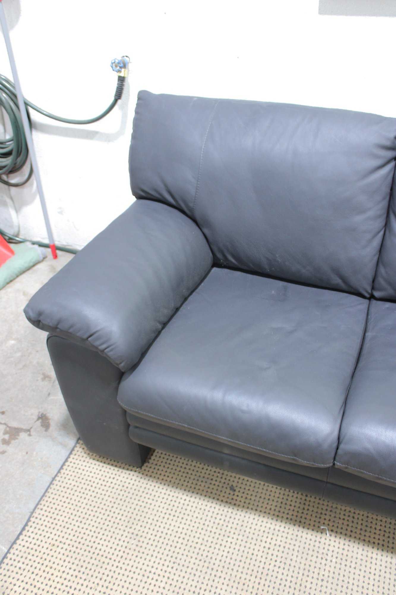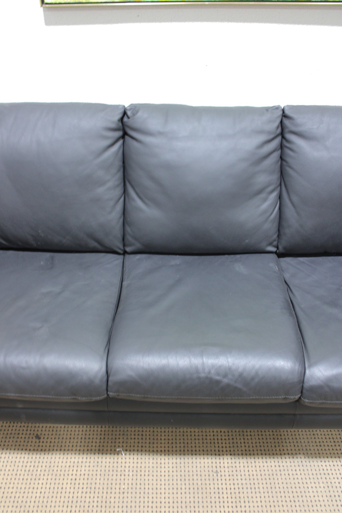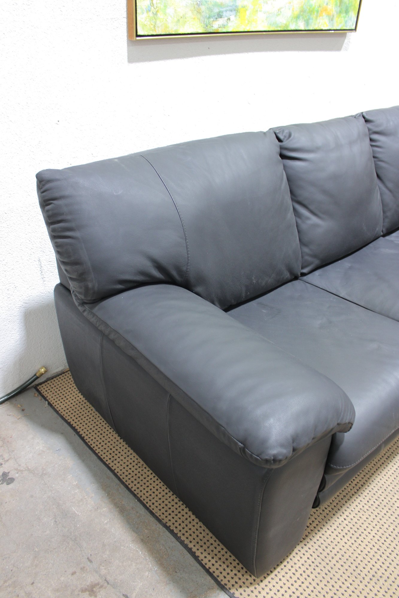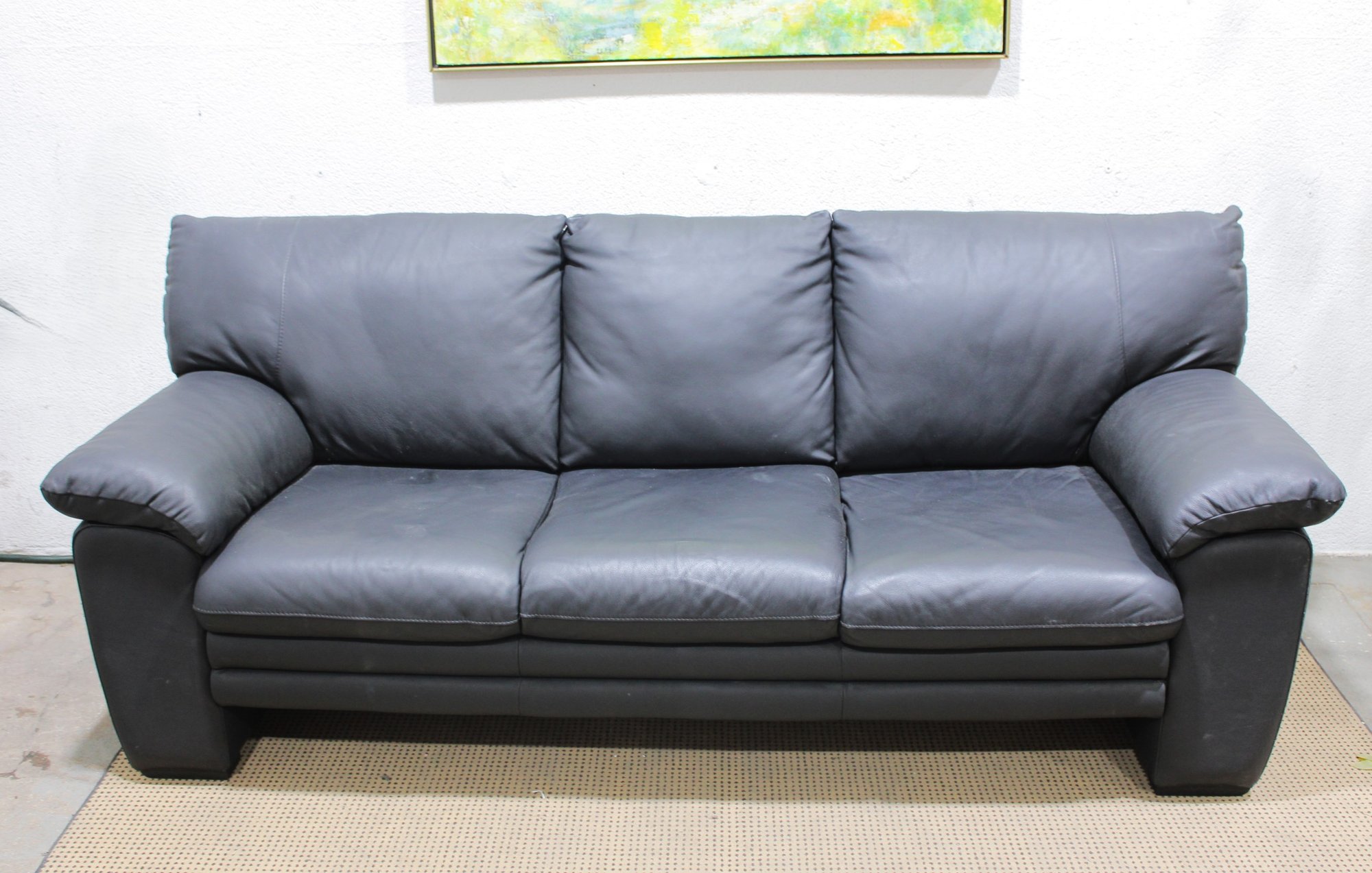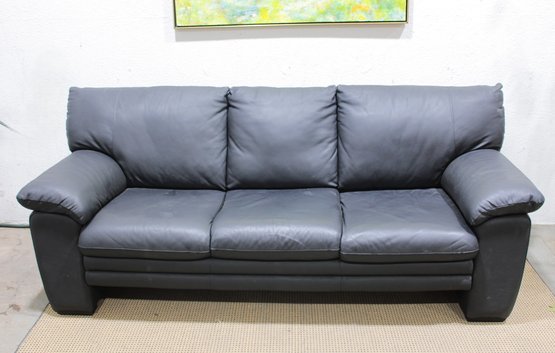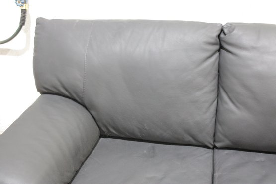 Upholstered in sleek gray leather, this sofa features clean lines, wide cushioned arms, and plush seat and back cushions that provide both support and relaxation. The minimalist styling makes it a versatile choice that works beautifully in contemporary, modern, or transitional interiors.