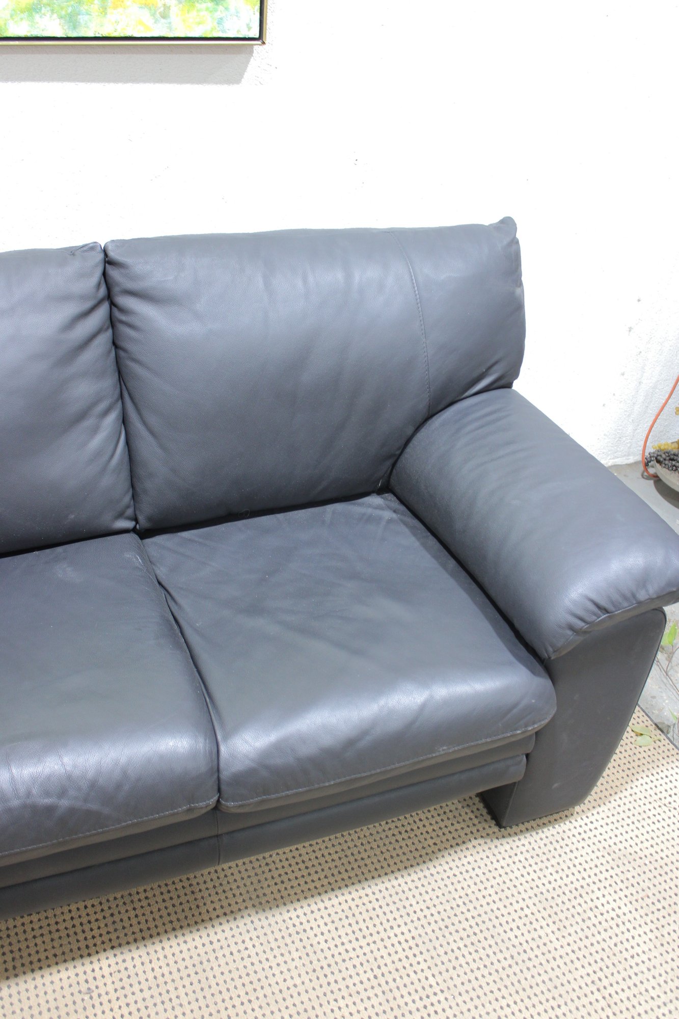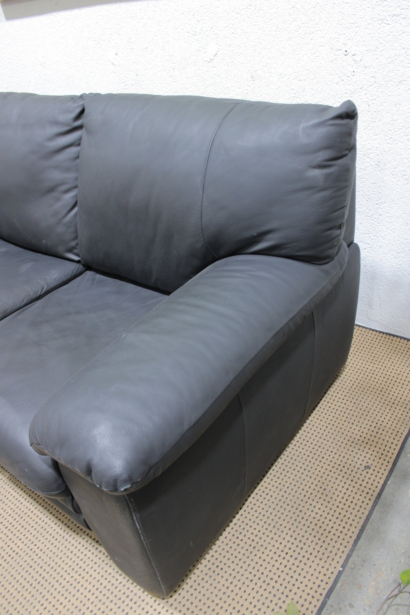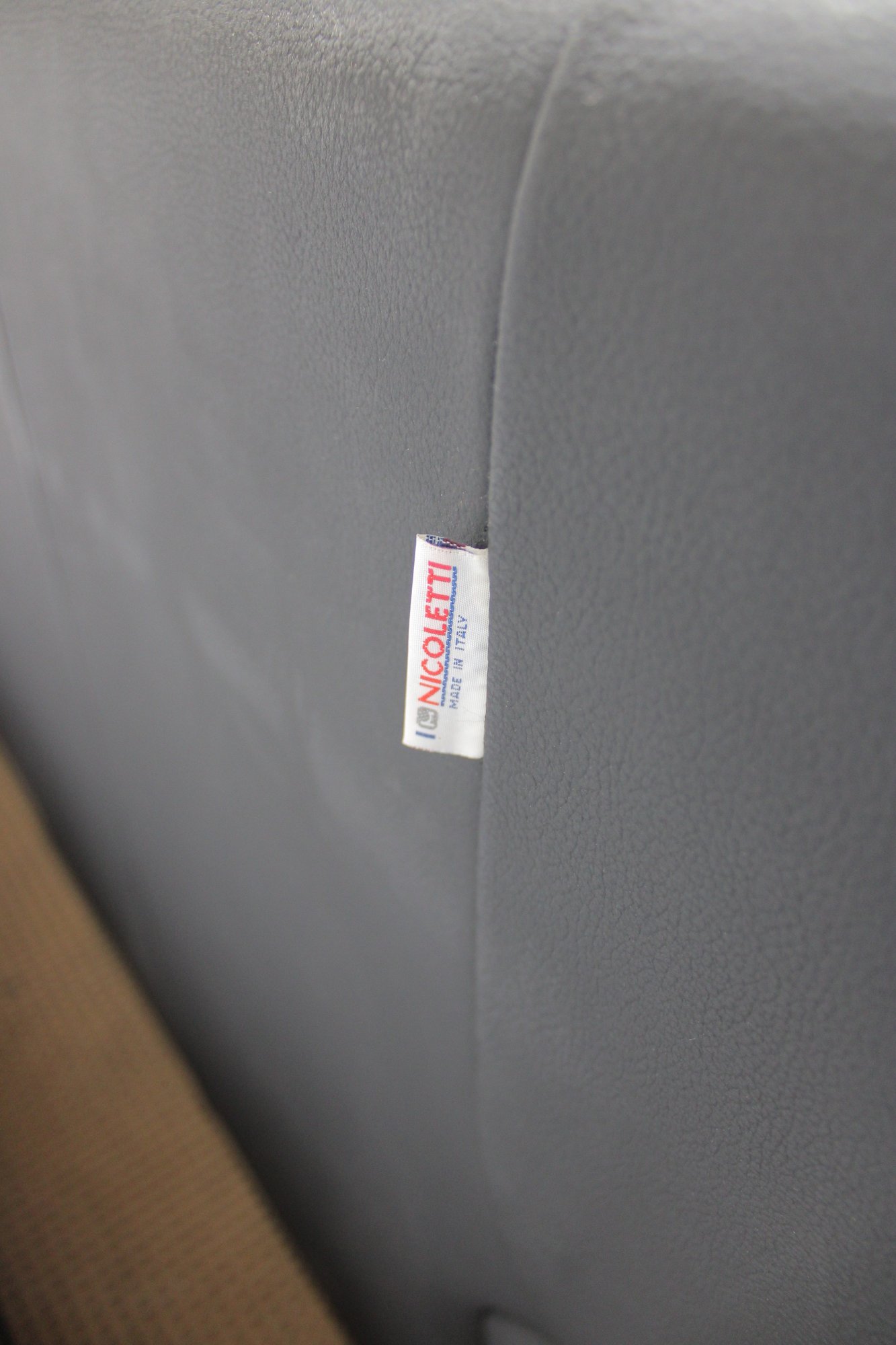 a Nicoletti Italian leather sofa, a high-quality piece known for comfort, craftsmanship, and modern European design.