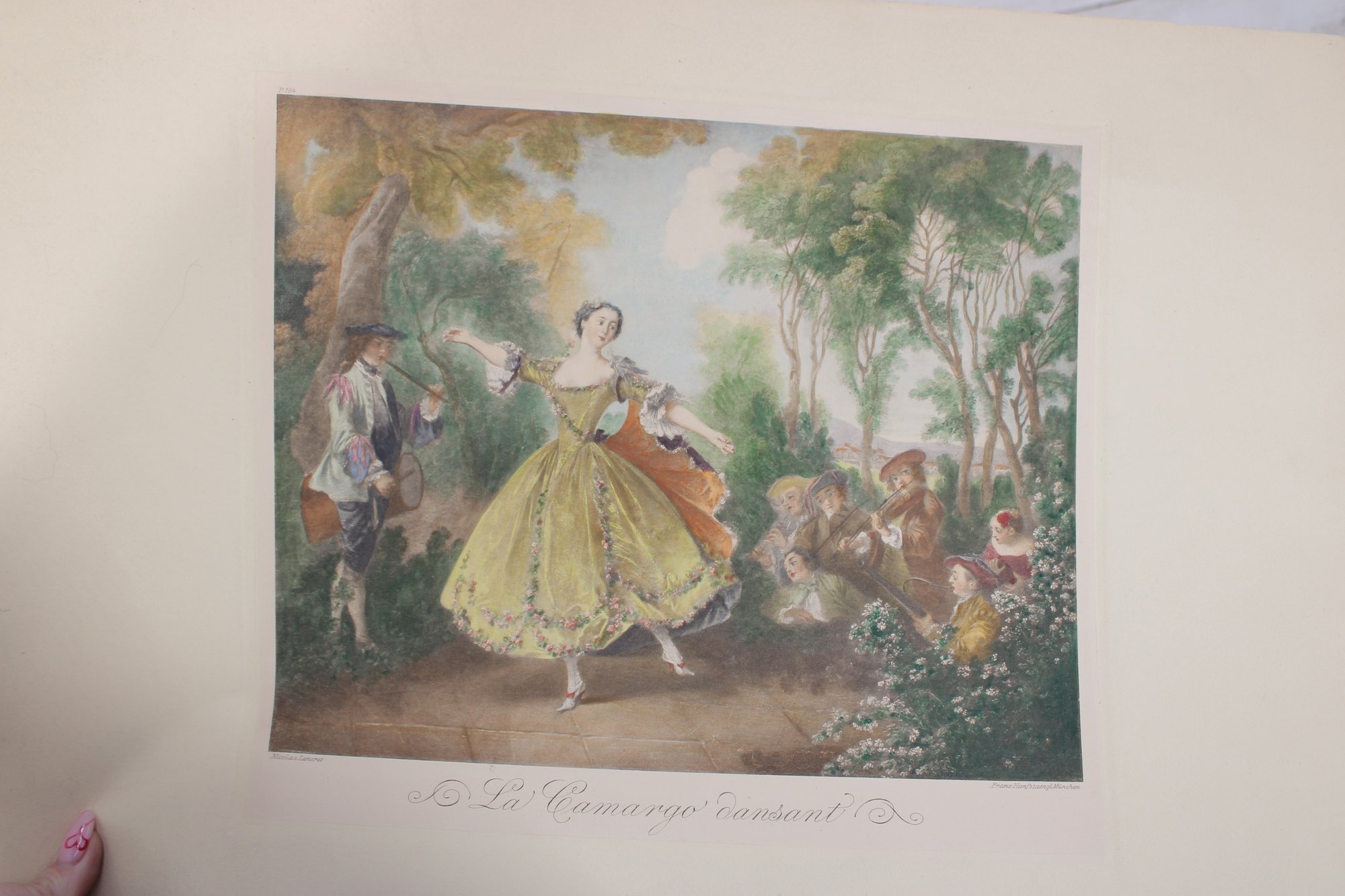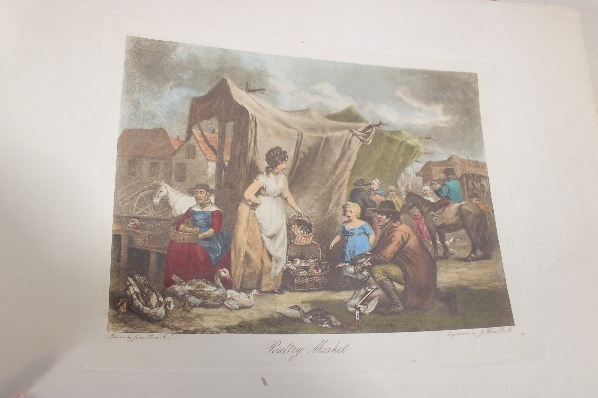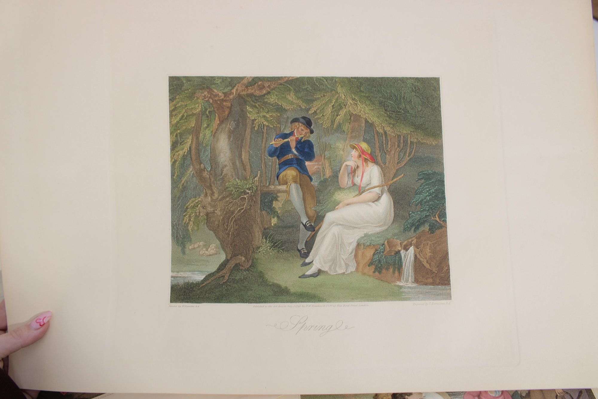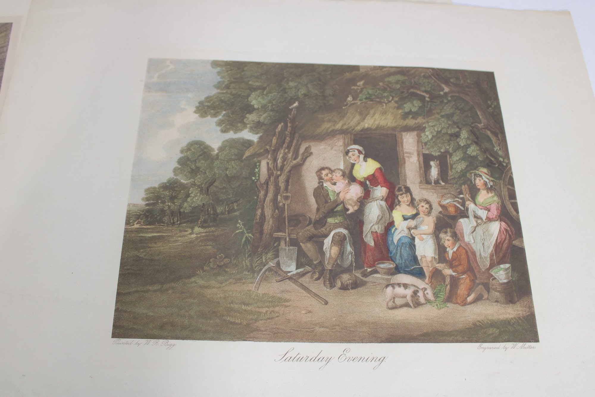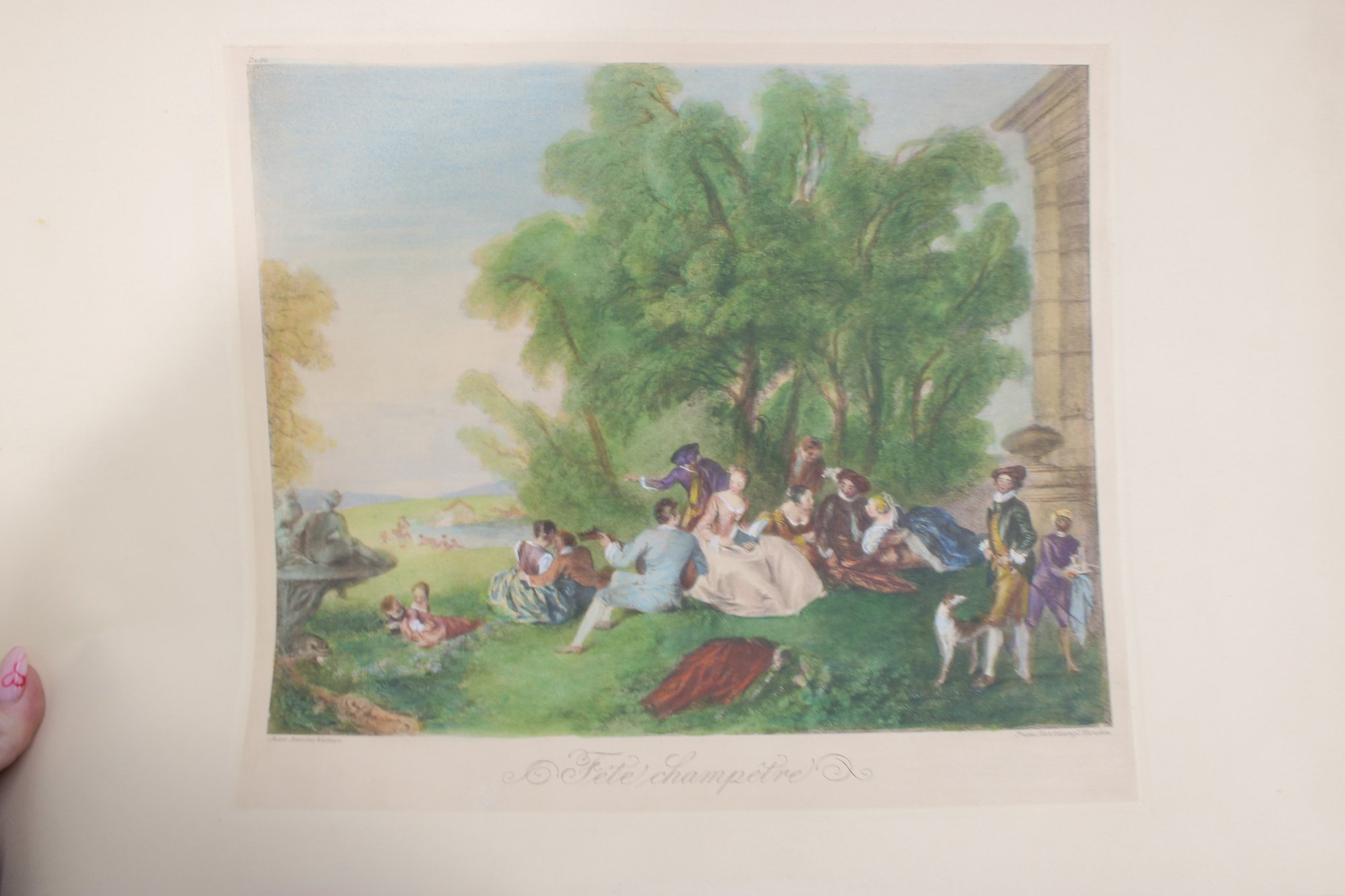 Charming assortment of antique hand-colored engravings depicting romantic pastoral and domestic genre scenes. This attractive collection features finely detailed illustrations of figures in countryside settings, family gatherings, musicians, and traditional rural life rendered in soft period colors and delicate engraving work.