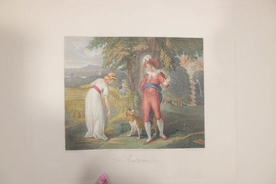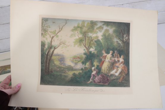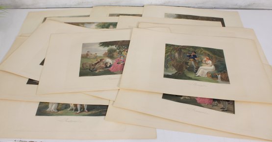 The prints reflect the refined European style popular in the late 18th to 19th century, with balanced compositions and warm storytelling imagery. Wide margins and classic presentation make them ideal for framing individually or as a cohesive decorative group.