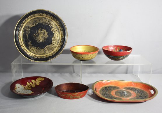 Large Black and Gold Charger Plate: This ornate piece features a radiant golden dragon motif at its center, surrounded by a ring of traditional patterns and a thick golden rim. The deep black lacquer serves as a dramatic backdrop for the opulent design.