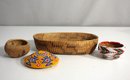 This unique collection of four handmade baskets includes a variety of weaving and beading techniques, showcasing vibrant colors and intricate patterns. Perfect for collectors of folk art or handmade crafts, each basket in this set is distinct in its design and cultural flair. The collection features woven designs with natural materials, alongside two colorful beaded baskets with geometric patterns.