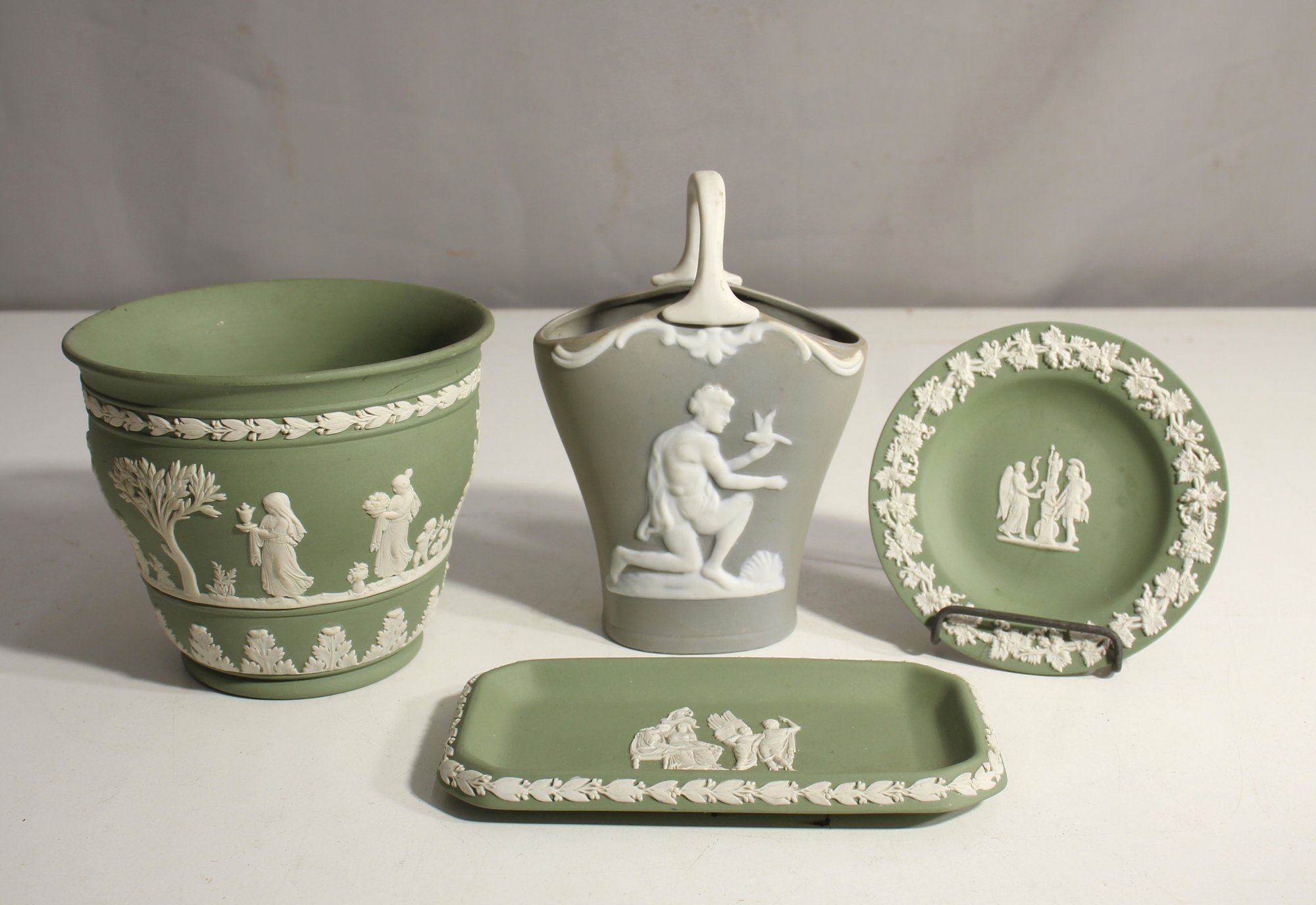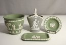 A charming assortment of Wedgwood Jasperware in classic sage green and gray tones. This collection includes: