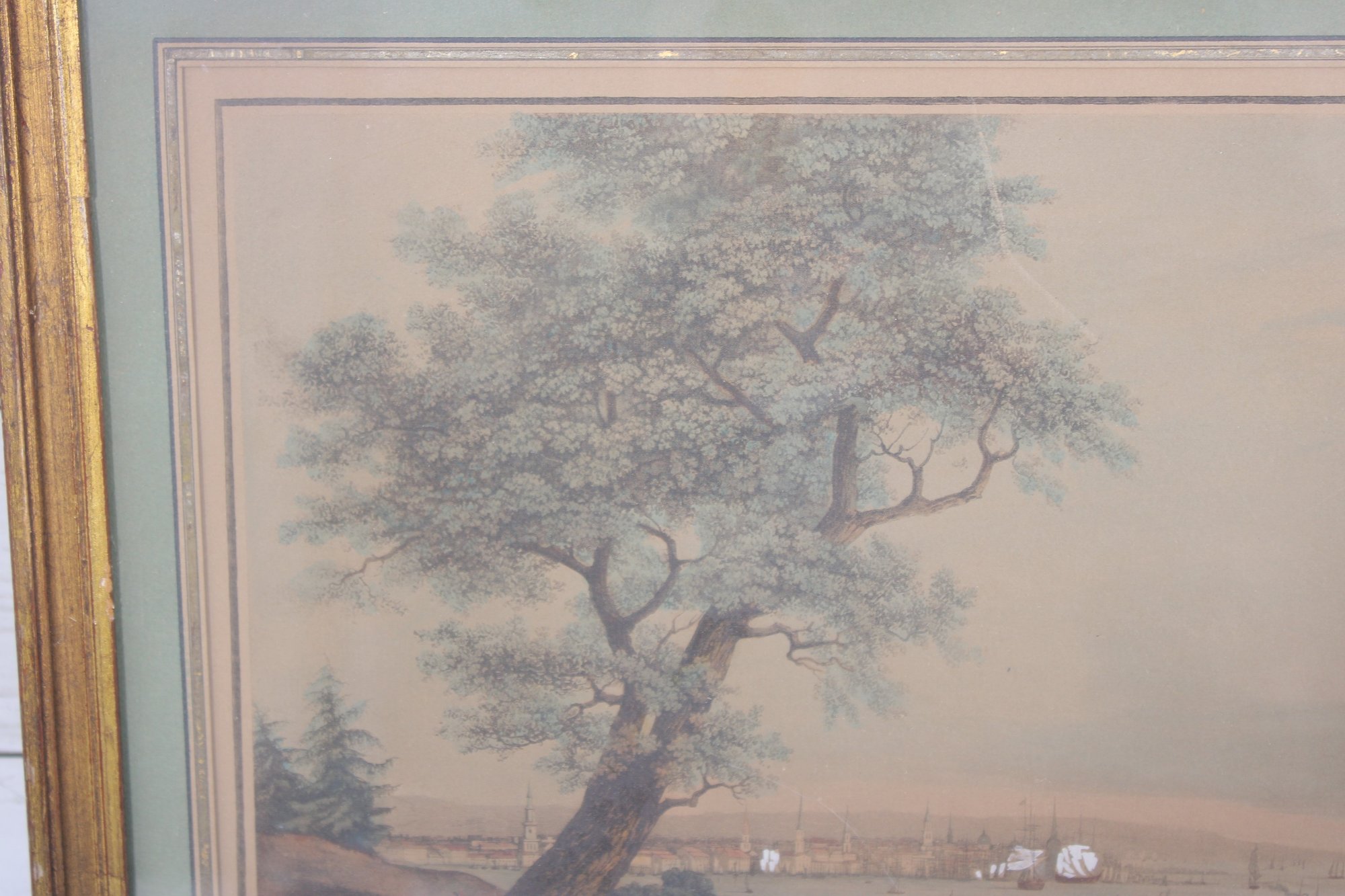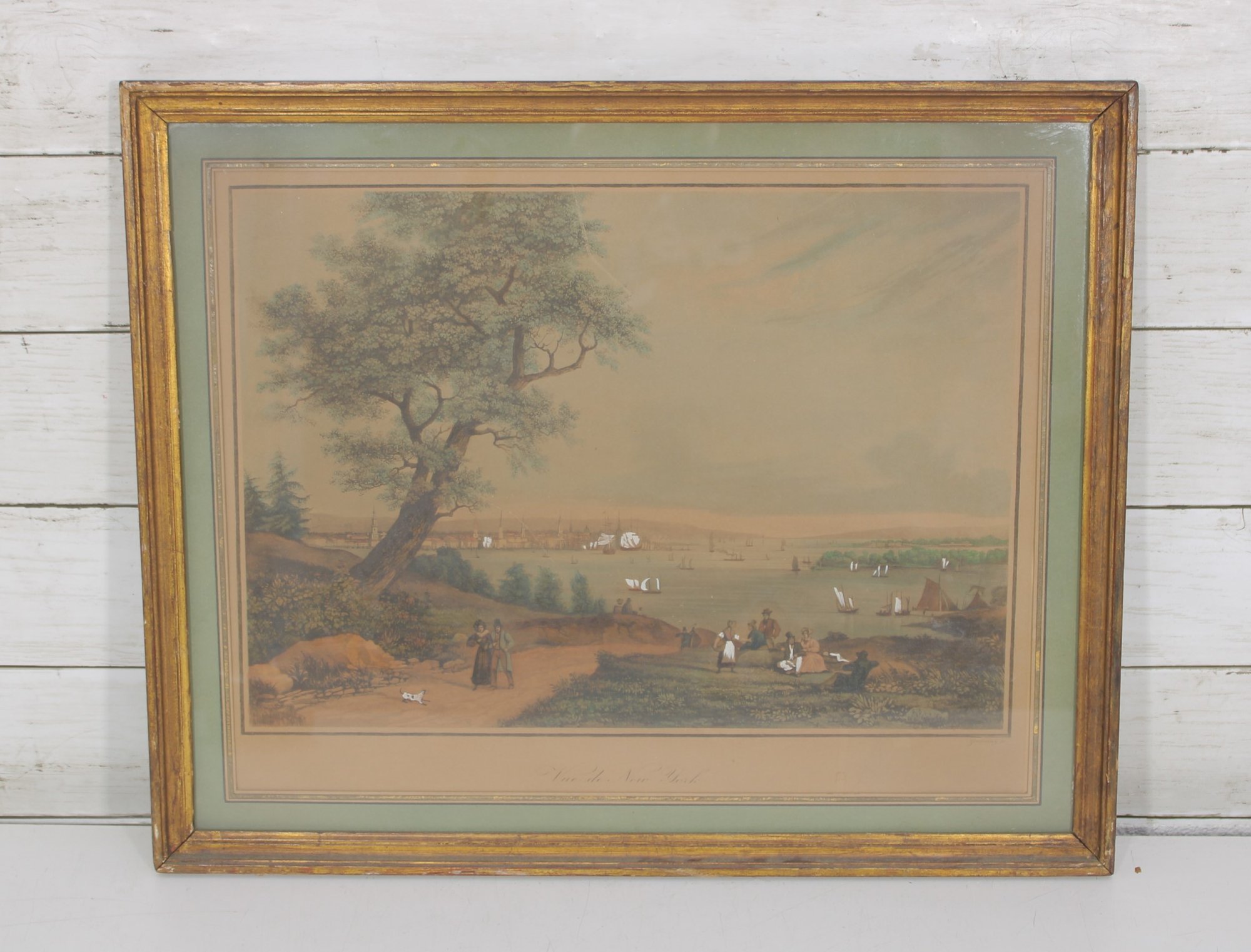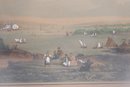 colored engraving depicting a lively harbor landscape with sailing ships, shoreline figures, and pastoral foreground details. The scene shows everyday life along the water—people gathered on land while boats and ships fill the harbor beyond—rendered in soft, muted tones typical of early 19th-century prints.