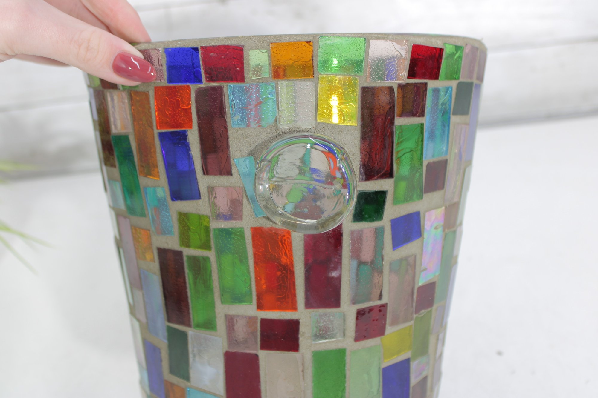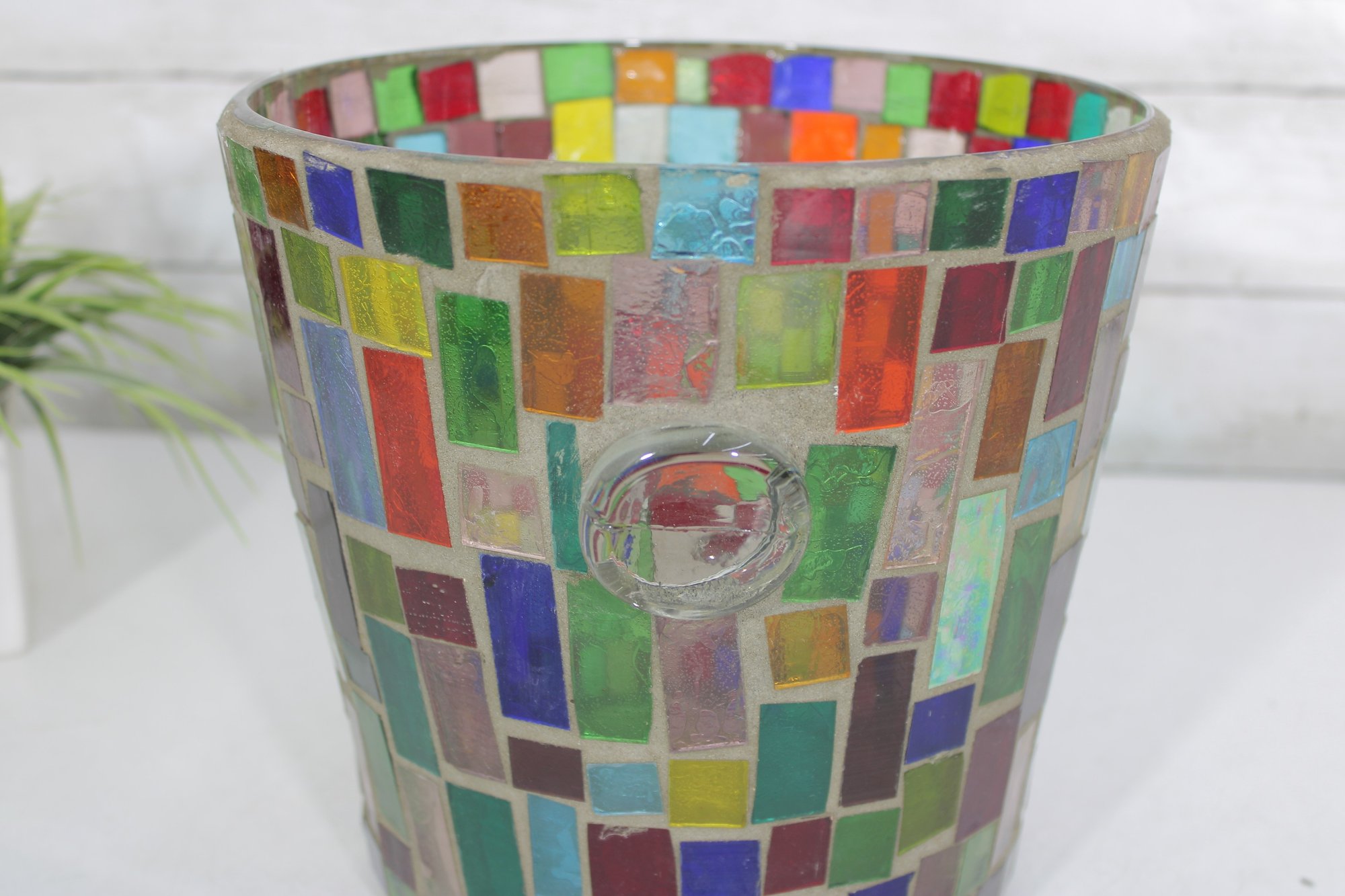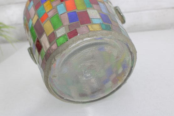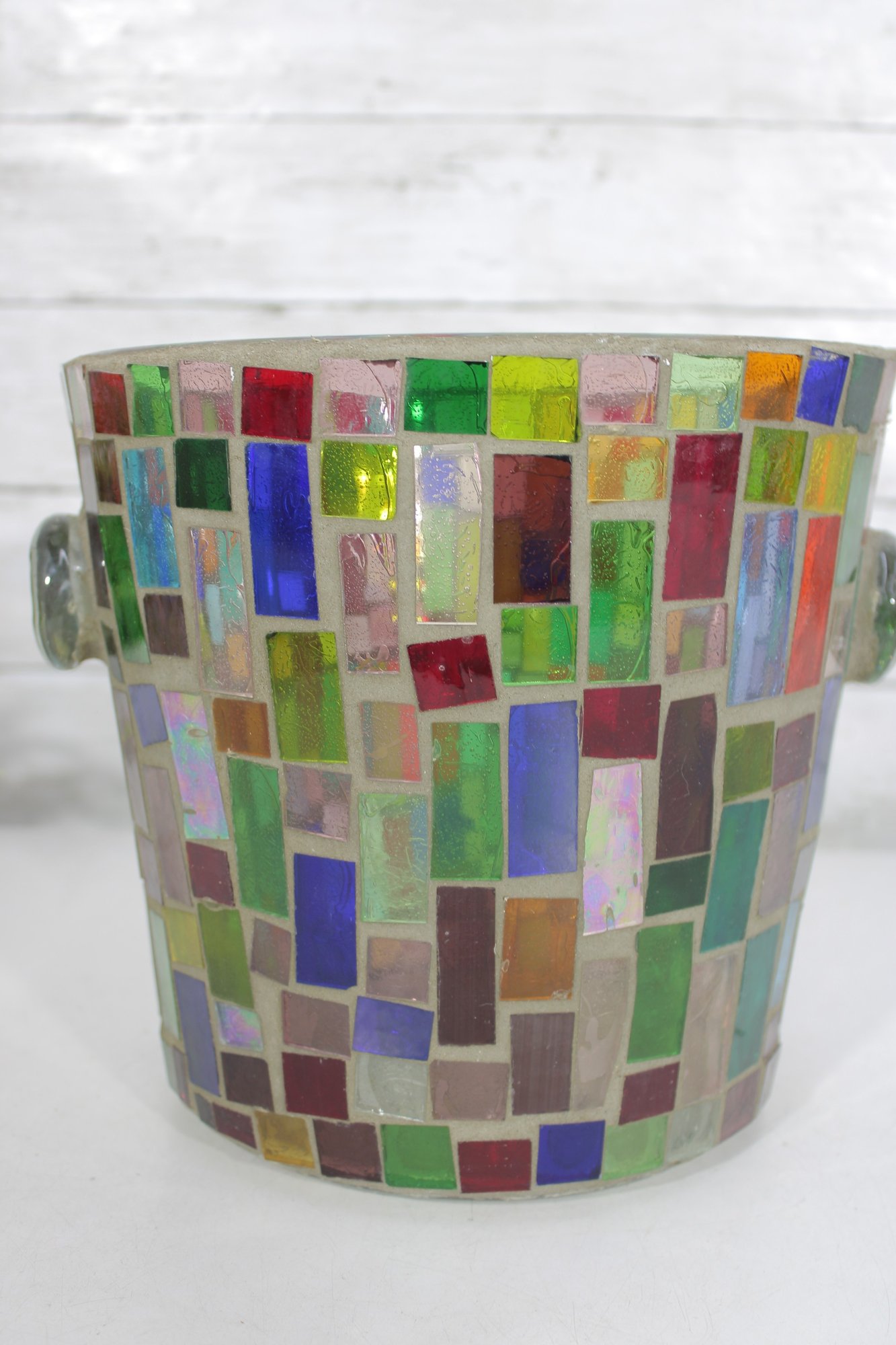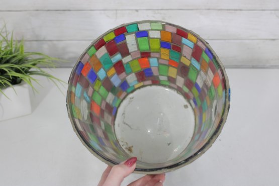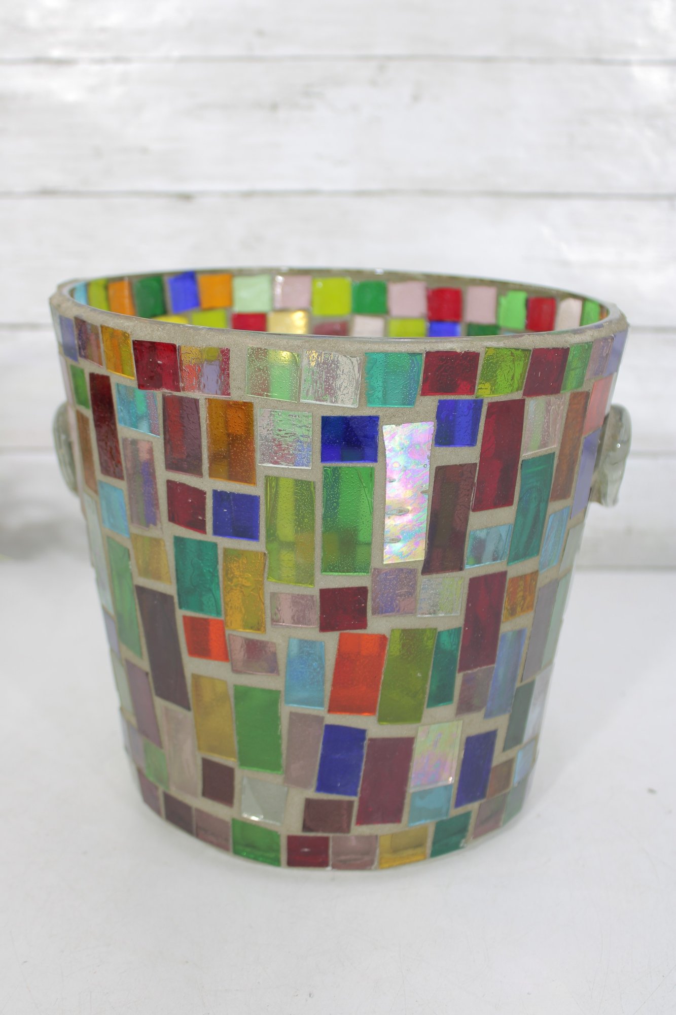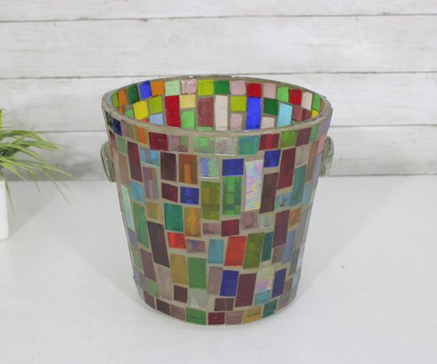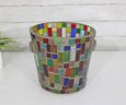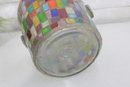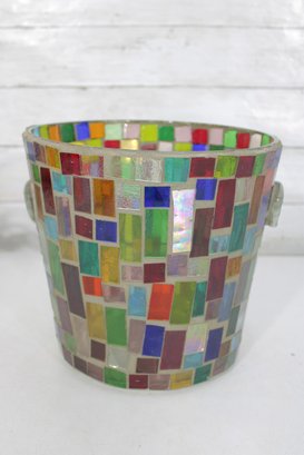 Vibrant mosaic glass ice bucket or wine chiller featuring a multicolor tile-style design that catches and reflects light beautifully. The handcrafted look and bright geometric pattern make this a standout piece for entertaining, bar décor, or as a decorative accent.