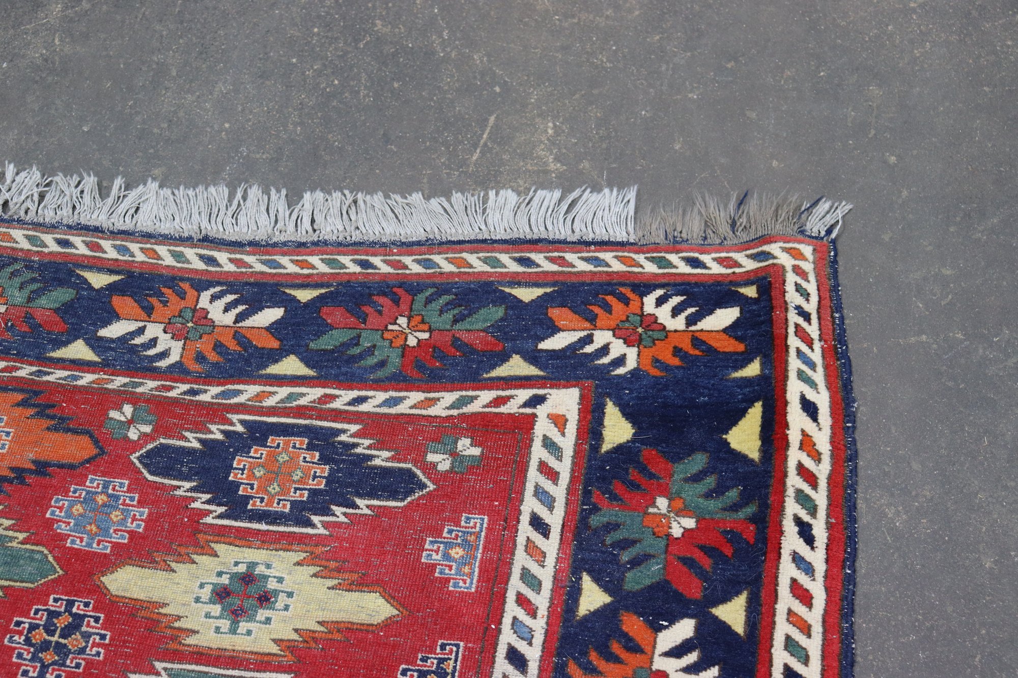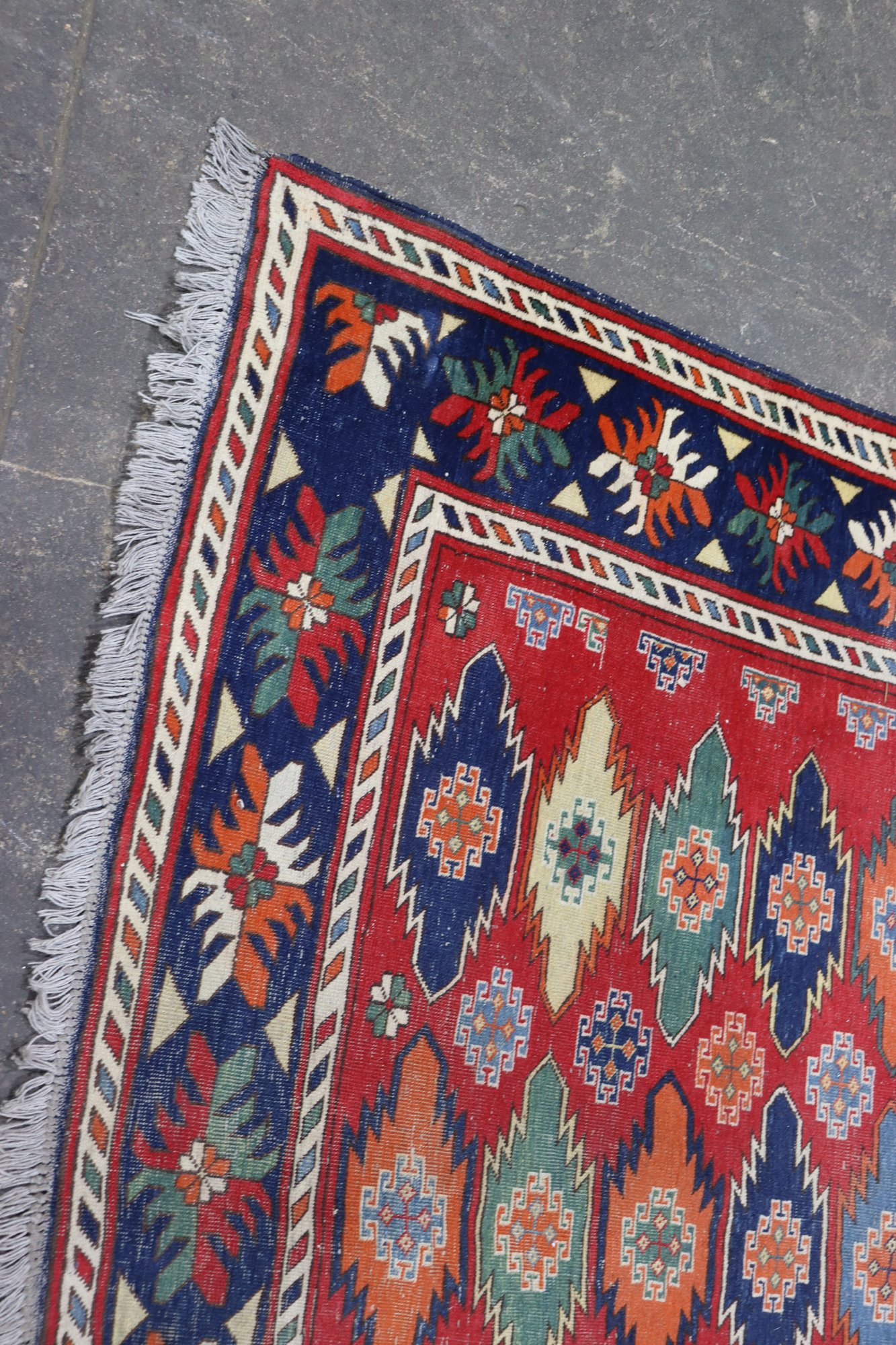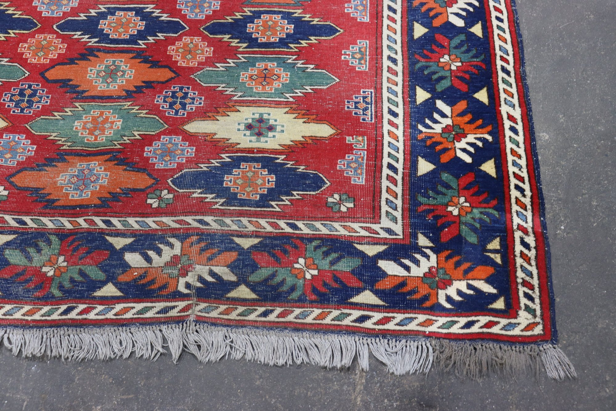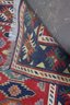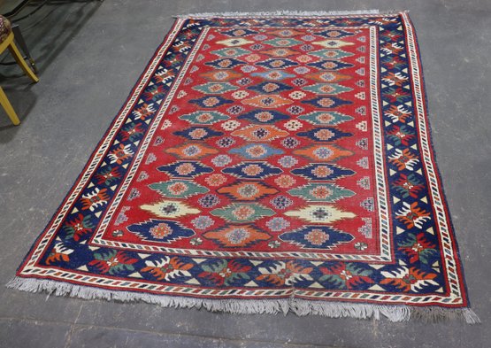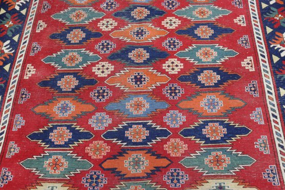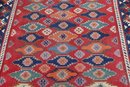 A beautifully patterned area rug featuring a bold tribal-style geometric design with rich colors and a detailed border. This rug makes an eye-catching statement and is well suited for living rooms, offices, or display spaces.