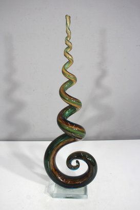 A stunning 23-inch tall art glass sculpture with an elegant spiral twist form, mounted on a clear glass base. This eye-catching piece features vibrant swirls of green, amber, and brown tones throughout its length, giving it a lively, fluid motion that shimmers in the light.