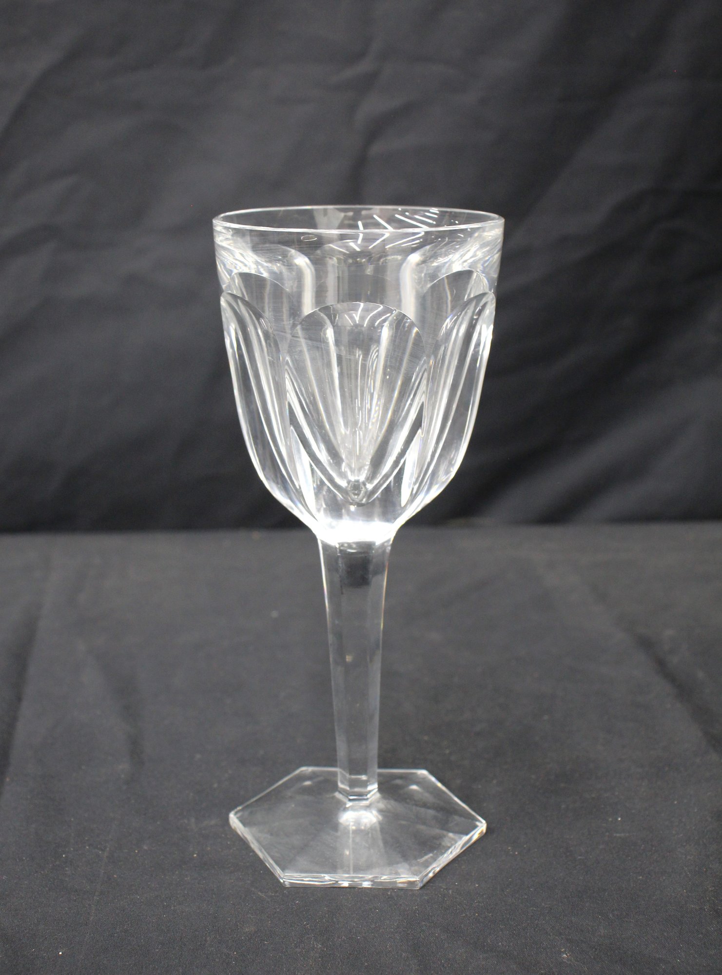 The glass is masterfully shaped with a broad, deep bowl that is ideal for allowing wine to breathe, enhancing the drinking experience. The design features elegant cut-glass patterns, with a series of vertical grooves that catch the light and create a sparkling effect.