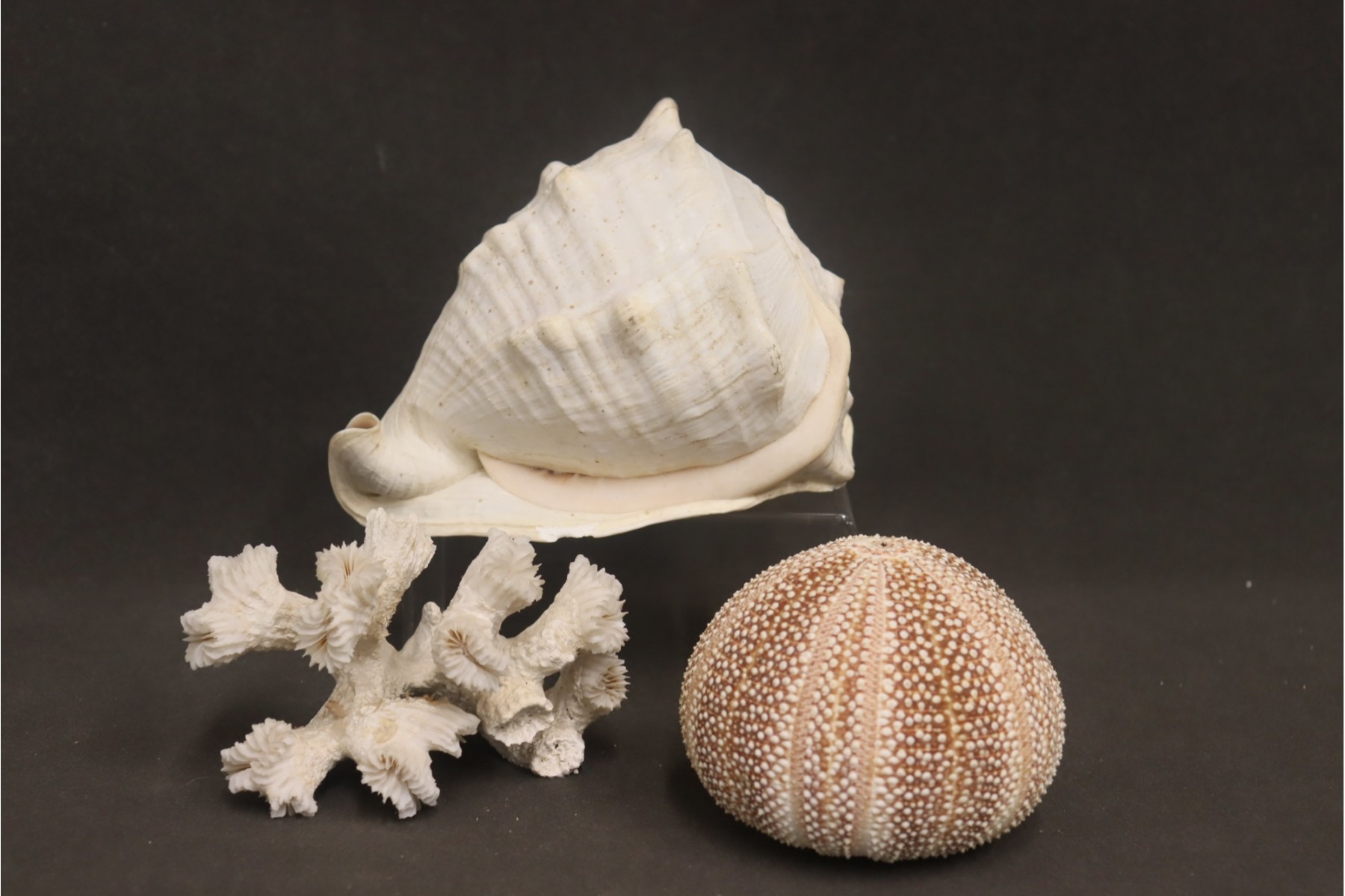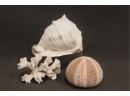 Conch Shell, Sea Urchin Shell, And Snow White Coral
