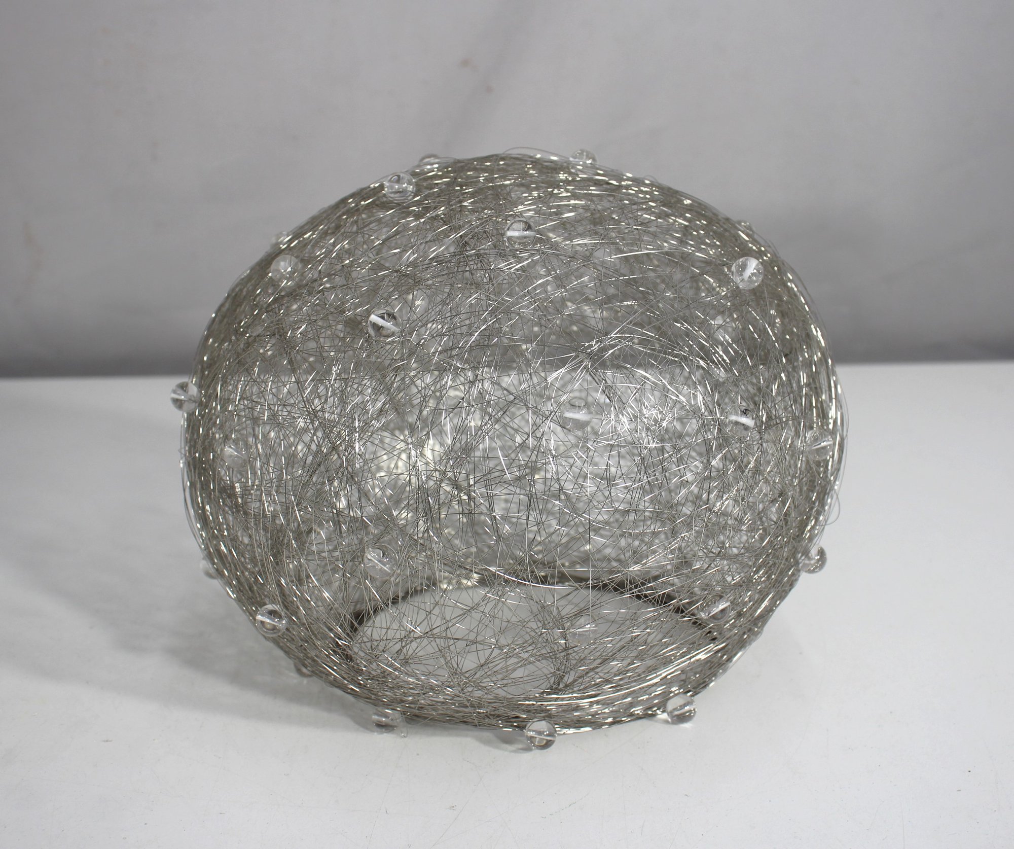 Add a modern, sculptural element to your lighting with this contemporary wire mesh lamp shade. Crafted from fine silver-tone wire intricately wound into a rounded form, this piece is both functional and artistic. Accented with clear beads throughout, it creates a shimmering effect when illuminated.