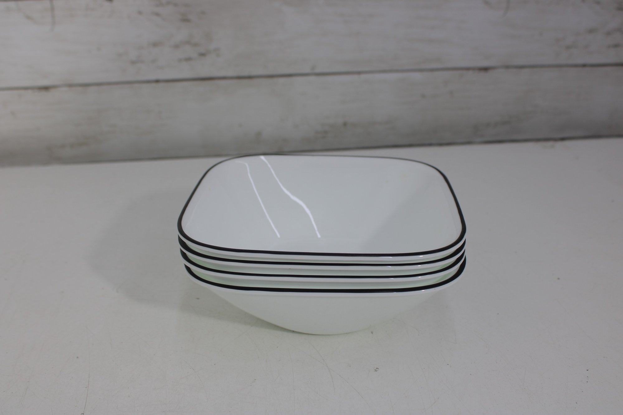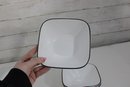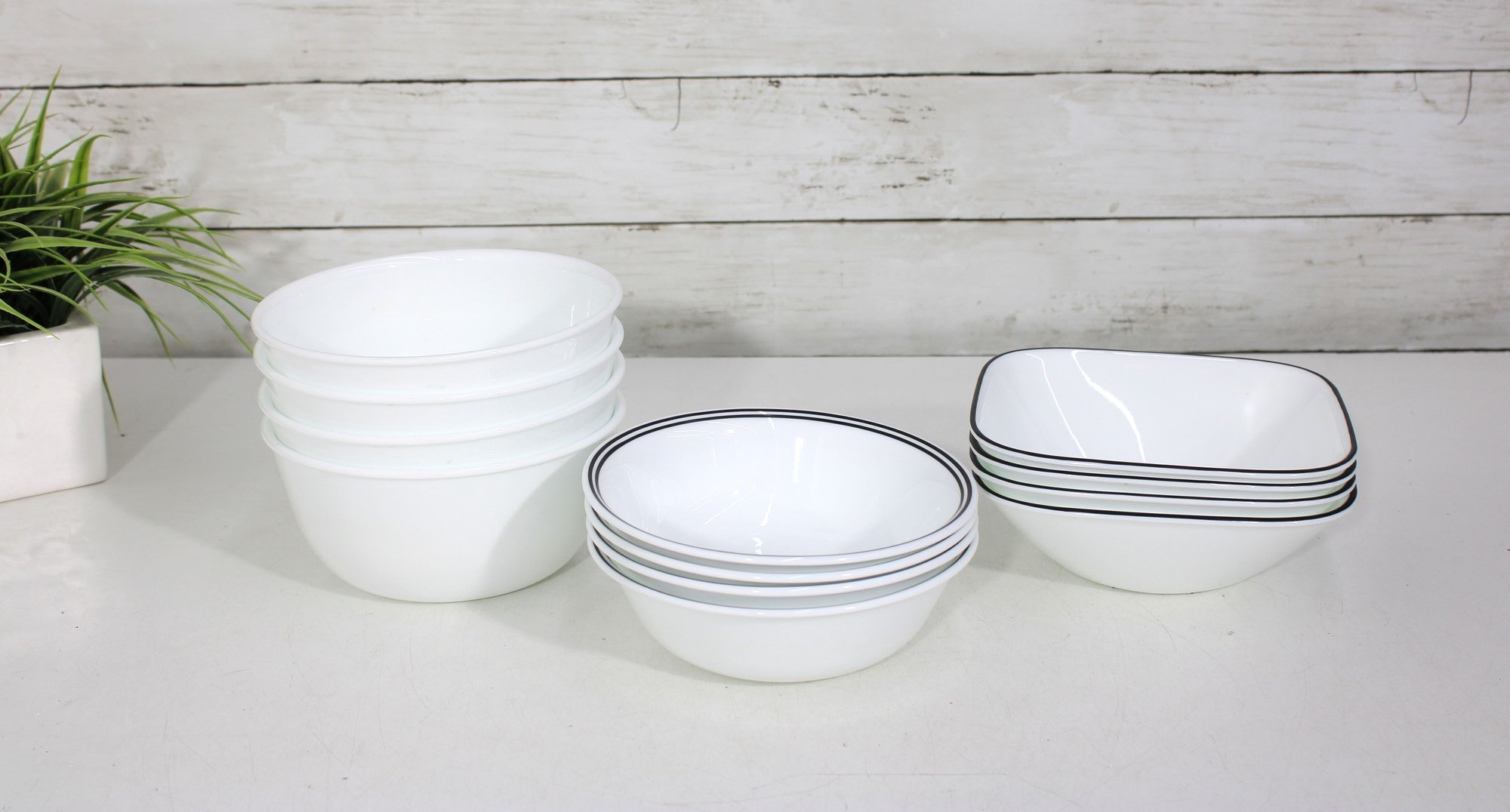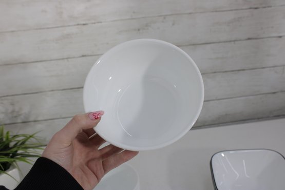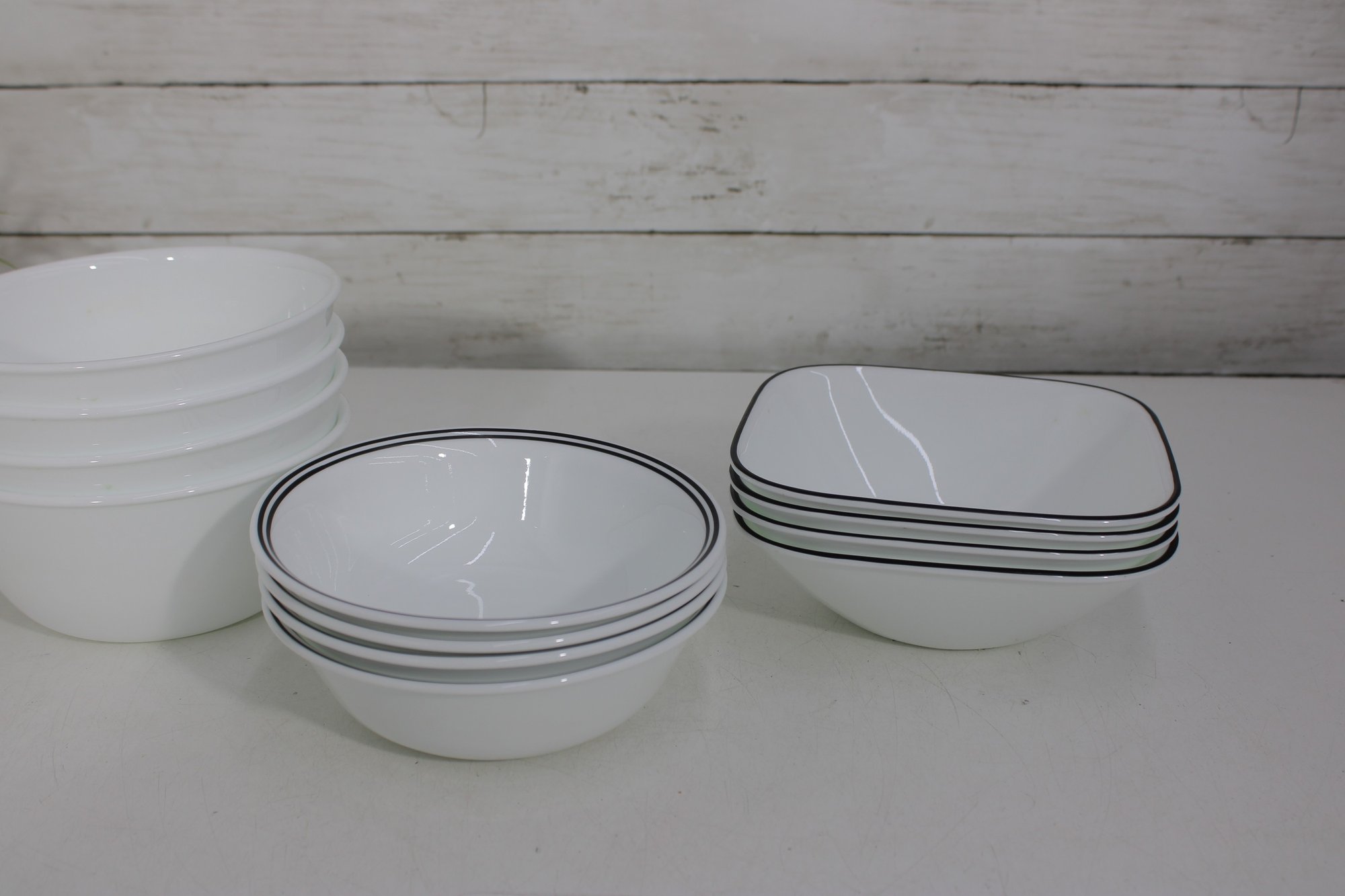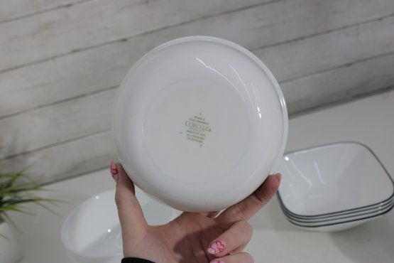 a group lot of Corelle bowls in the classic white design with a black rim accent. This versatile lot includes multiple bowls in mixed sizes, ideal for everyday use, serving, or completing a Corelle set.