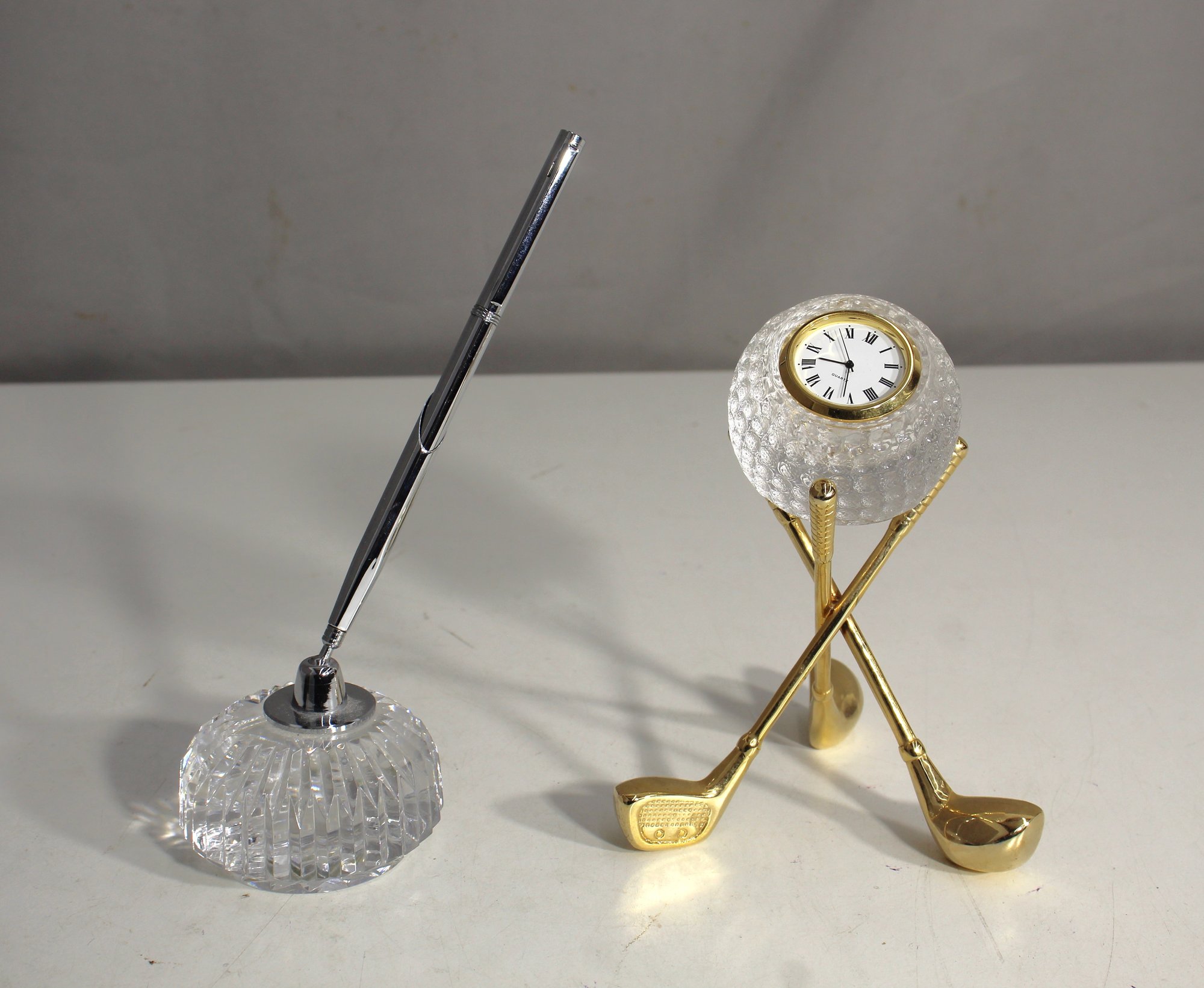 Enhance your workspace with this sophisticated set of crystal desk accessories. The set includes a crystal pen holder with a silver-tone pen, perfect for adding a touch of elegance to any desk, and a unique golf-themed clock featuring a crystal golf ball and gold-tone clubs. These pieces make a stylish and functional addition to your office or a thoughtful gift for any golf enthusiast or desk decor lover. The items are in excellent condition, offering both beauty and practicality.
