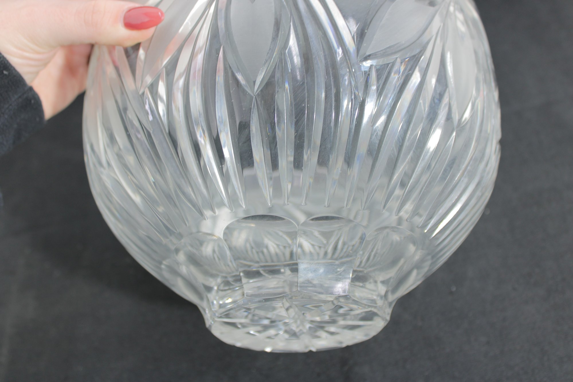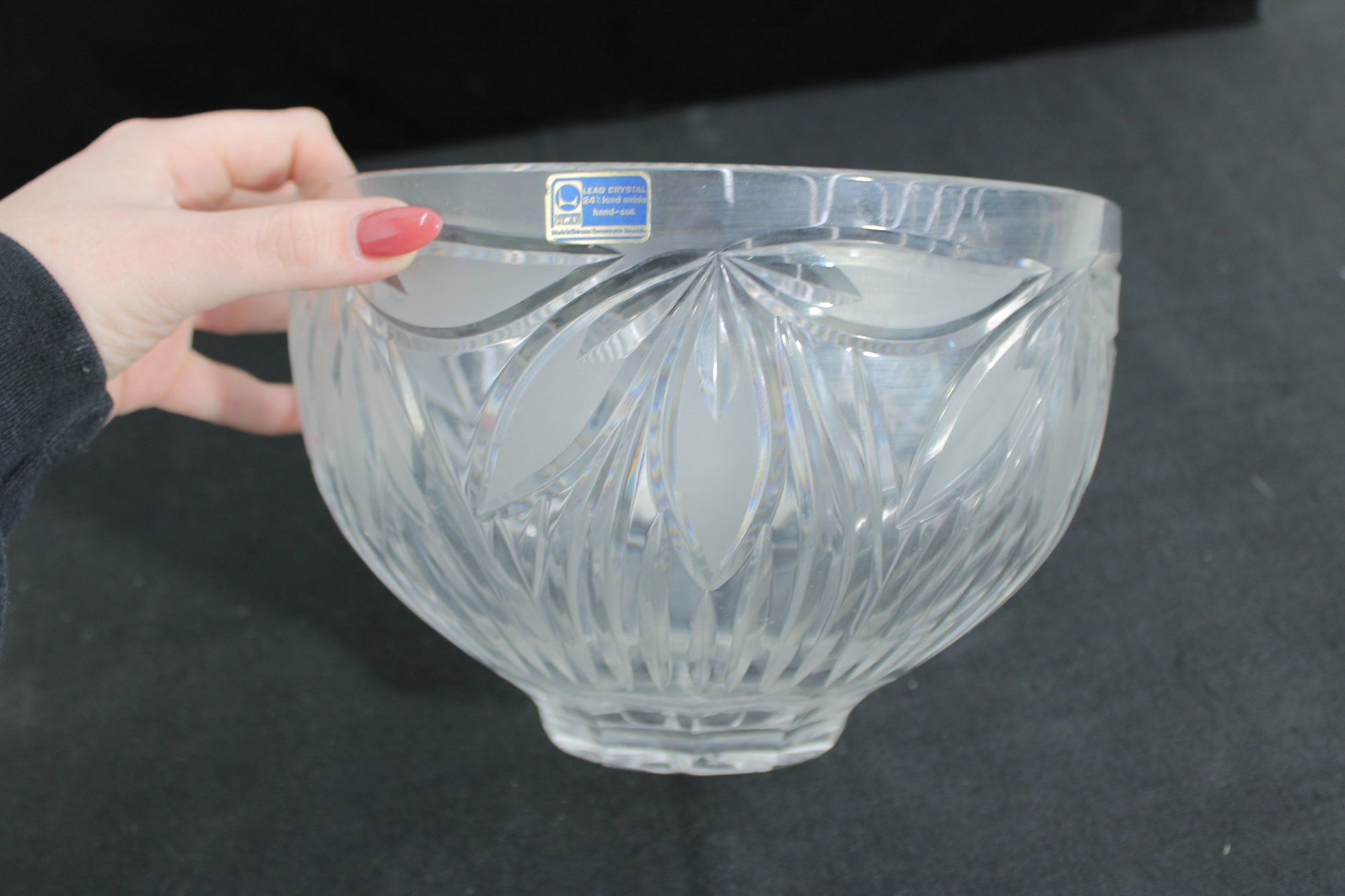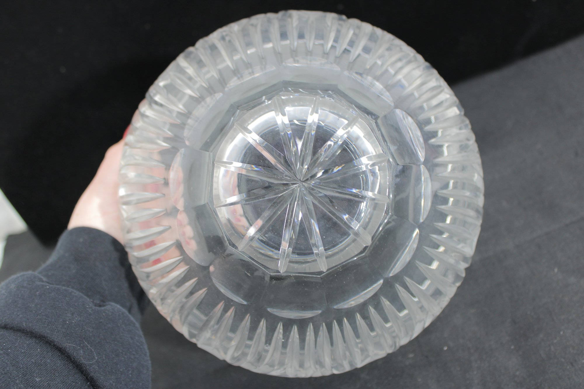 this beautiful cut crystal bowl, measuring 9.5 inches in diameter and 6.5 inches tall. With its graceful shape and deeply cut fan-style pattern, this piece offers that unmistakable brilliance and clarity only crystal provides.