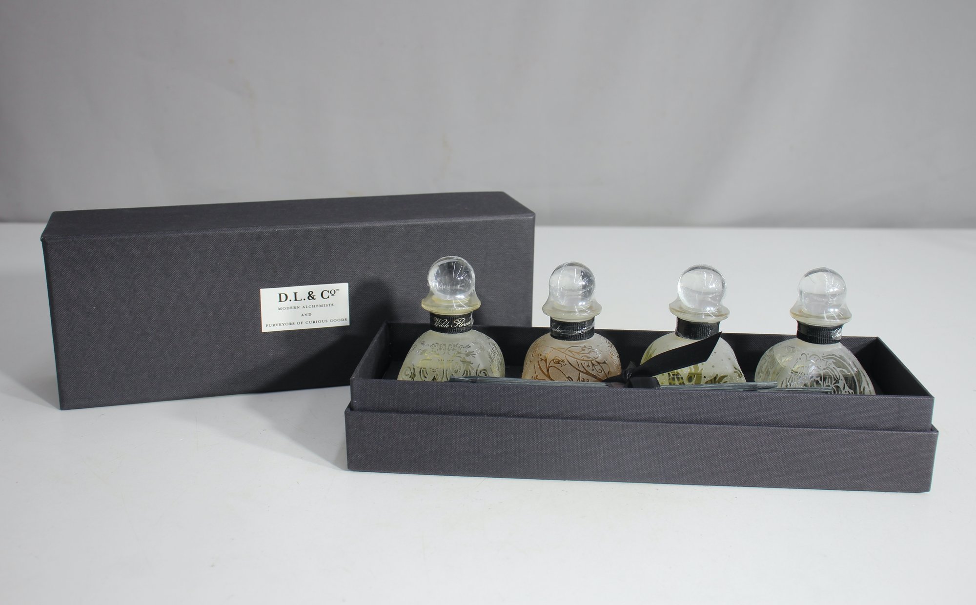 This is a stunning D.L. & Co. decorative diffuser set from the Modern Alchemists and Purveyors of Curious Goods collection. The set includes four beautifully etched glass bottles with unique scents and an assortment of diffuser reeds. Perfect for adding a touch of elegance and luxury to your home.