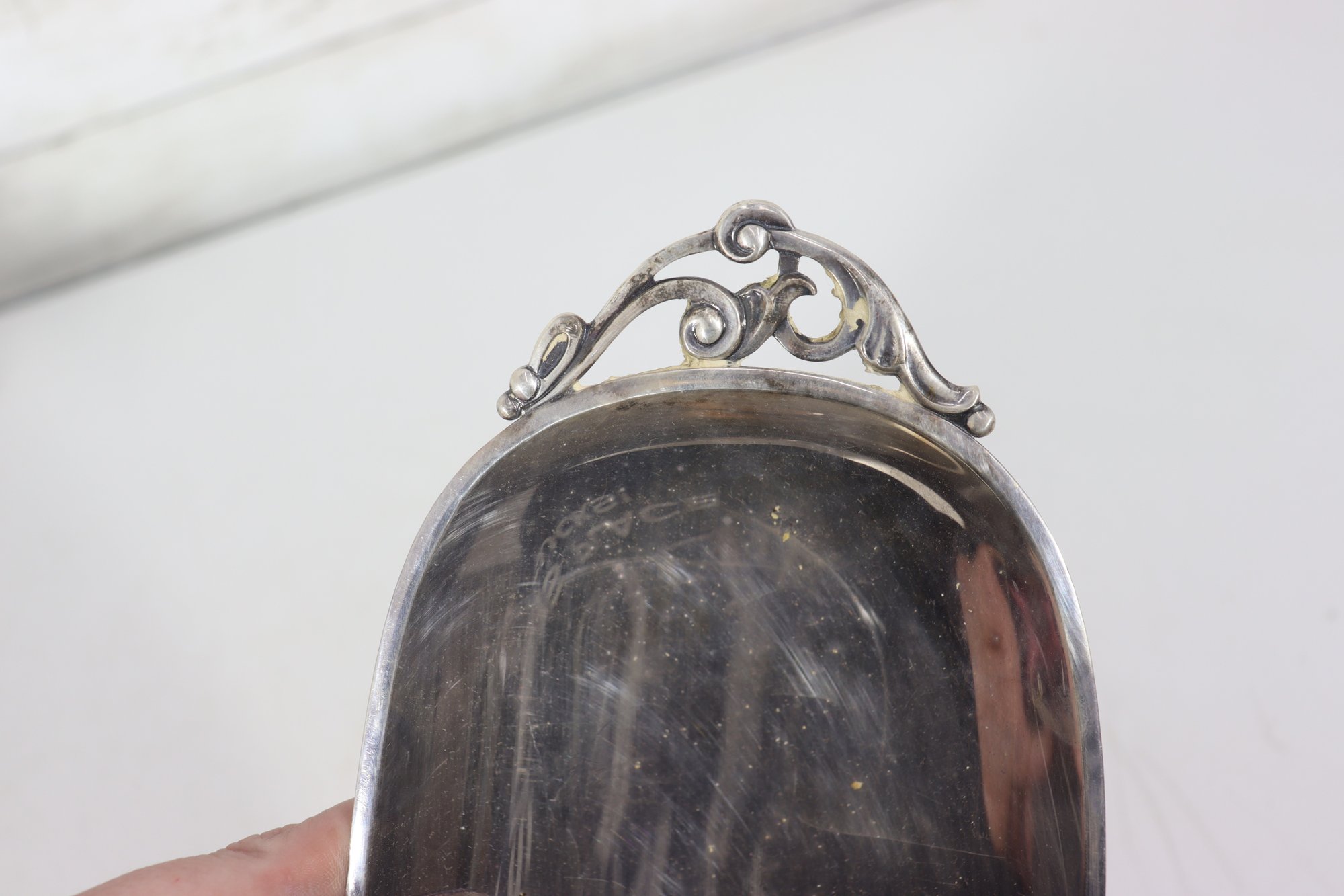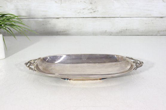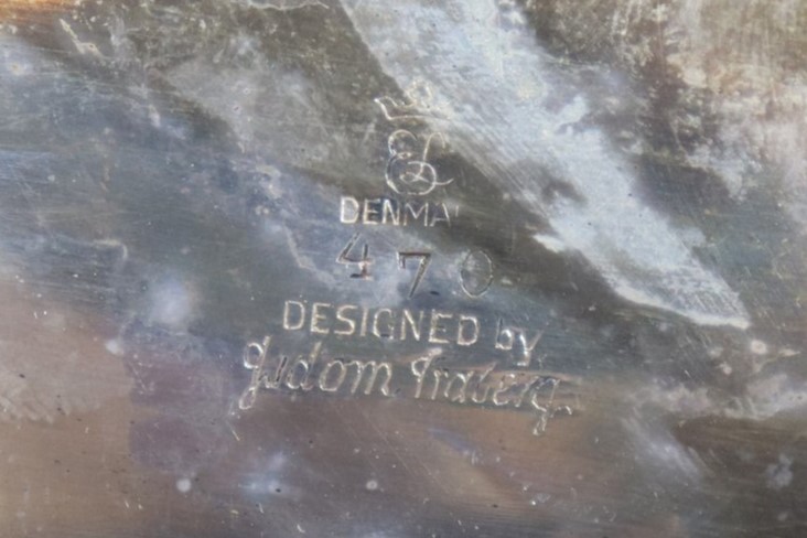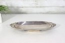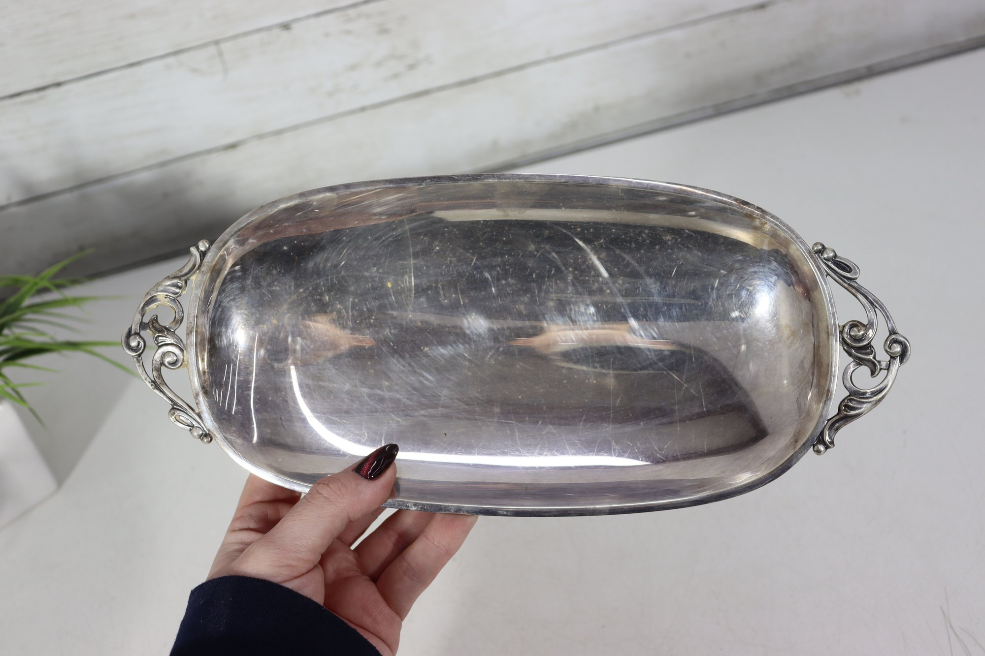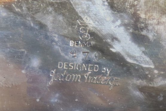 a Danish silverplate oval serving tray, marked Denmark No. 470 and designed by Gidom Fraberg. This elegant tray features a classic oval form with gently raised edges and ornate pierced handles, showcasing refined Scandinavian design.